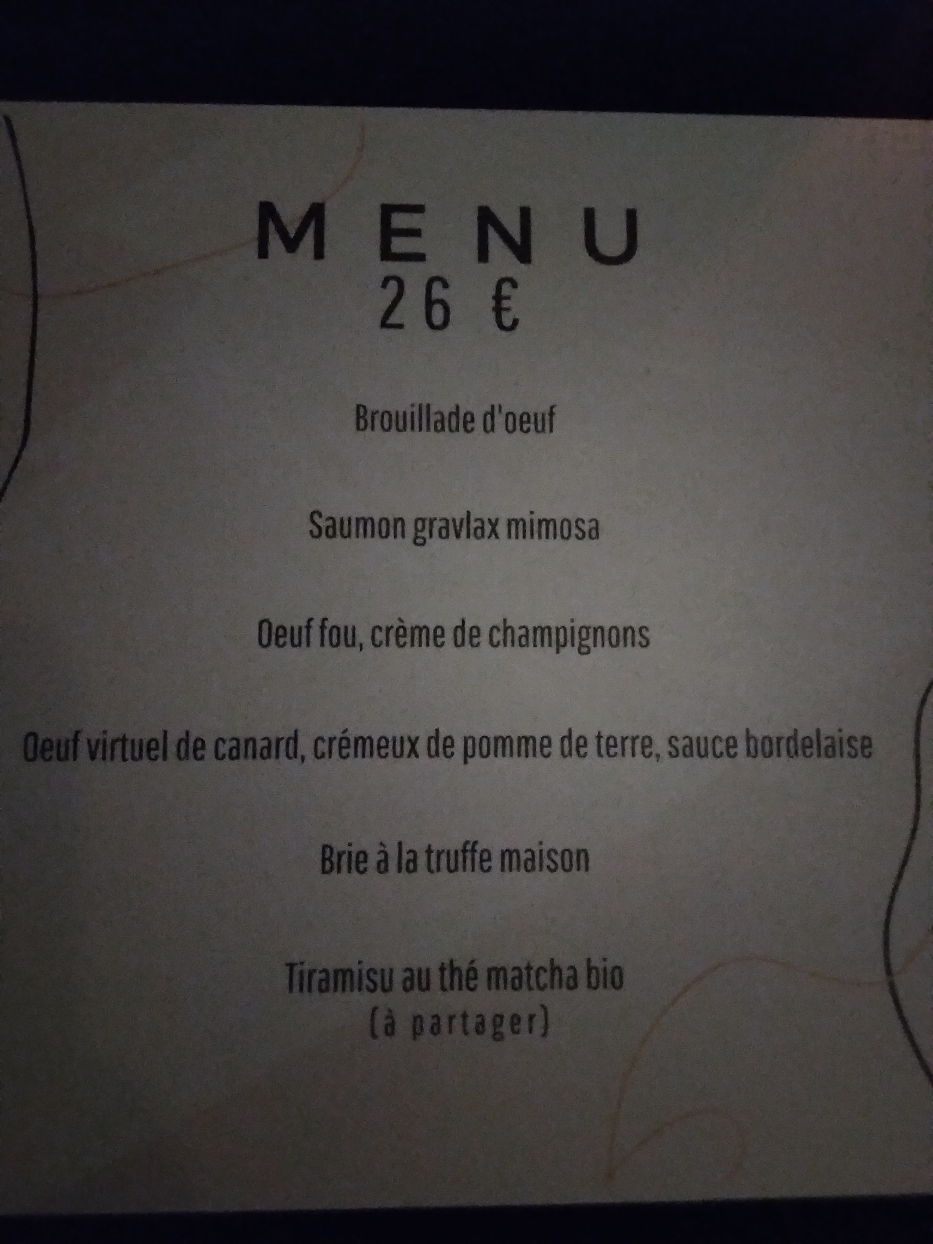 Super concept..tout à base d oeufs Personnel très sympathique Je vous conseille d aller y faire un tour