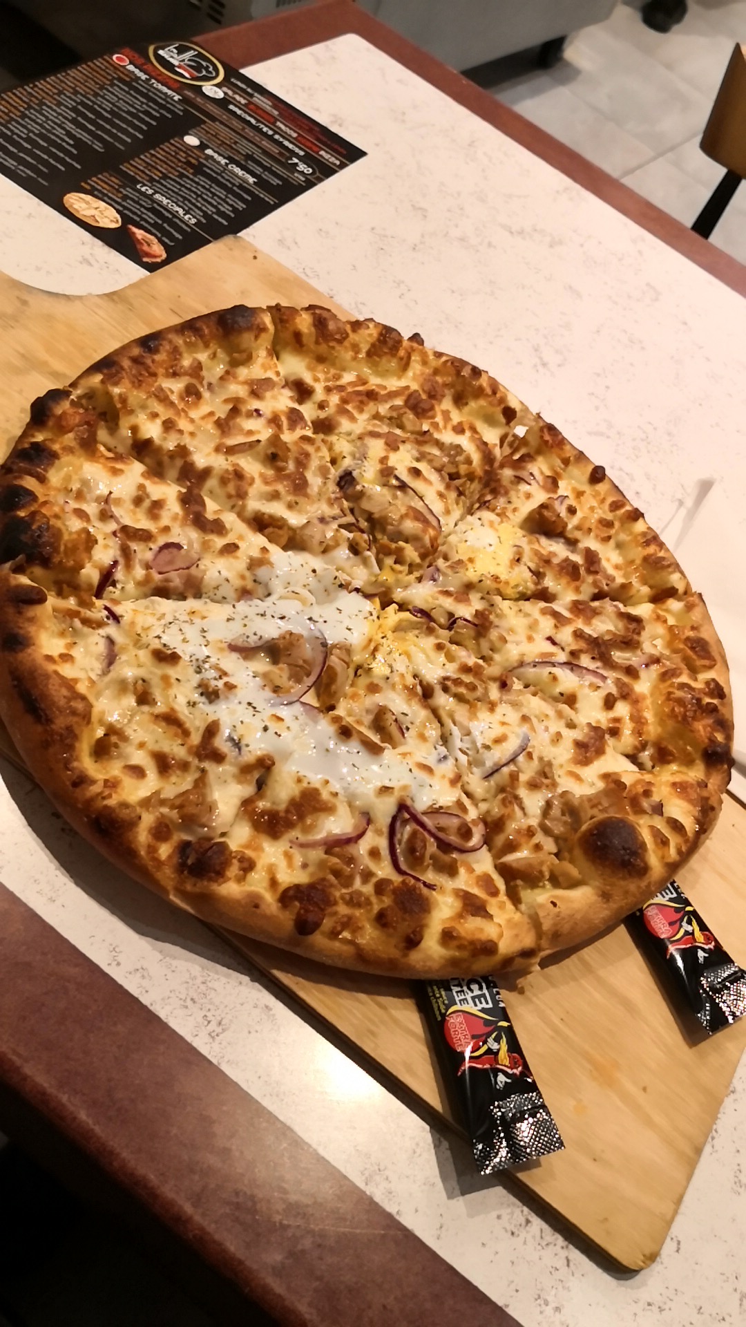 J'ai commandé la pizza Curry, pour moi un délice, j'ai vraiment adoré la sauce et la composition. Je recommande sans hésitation