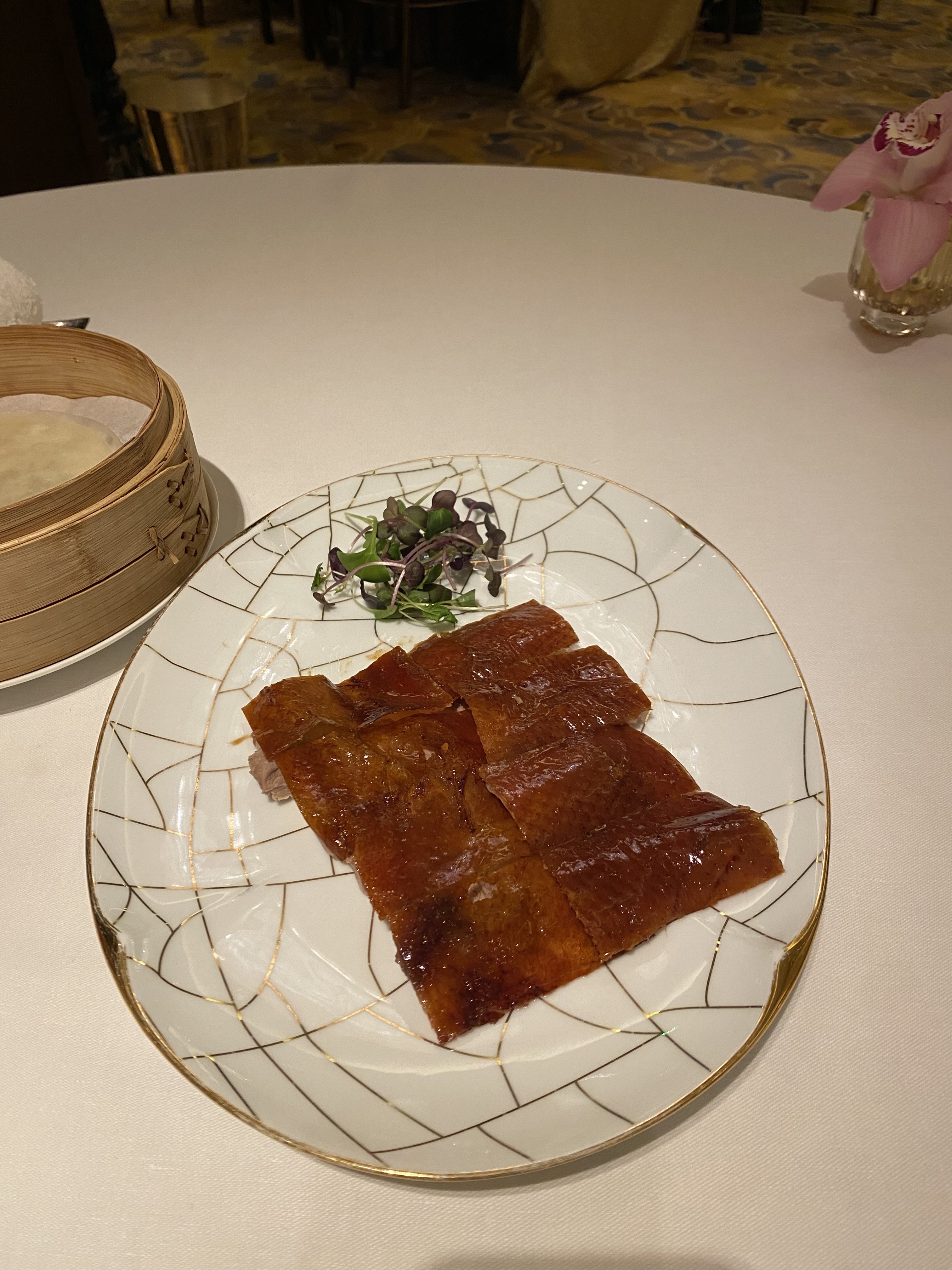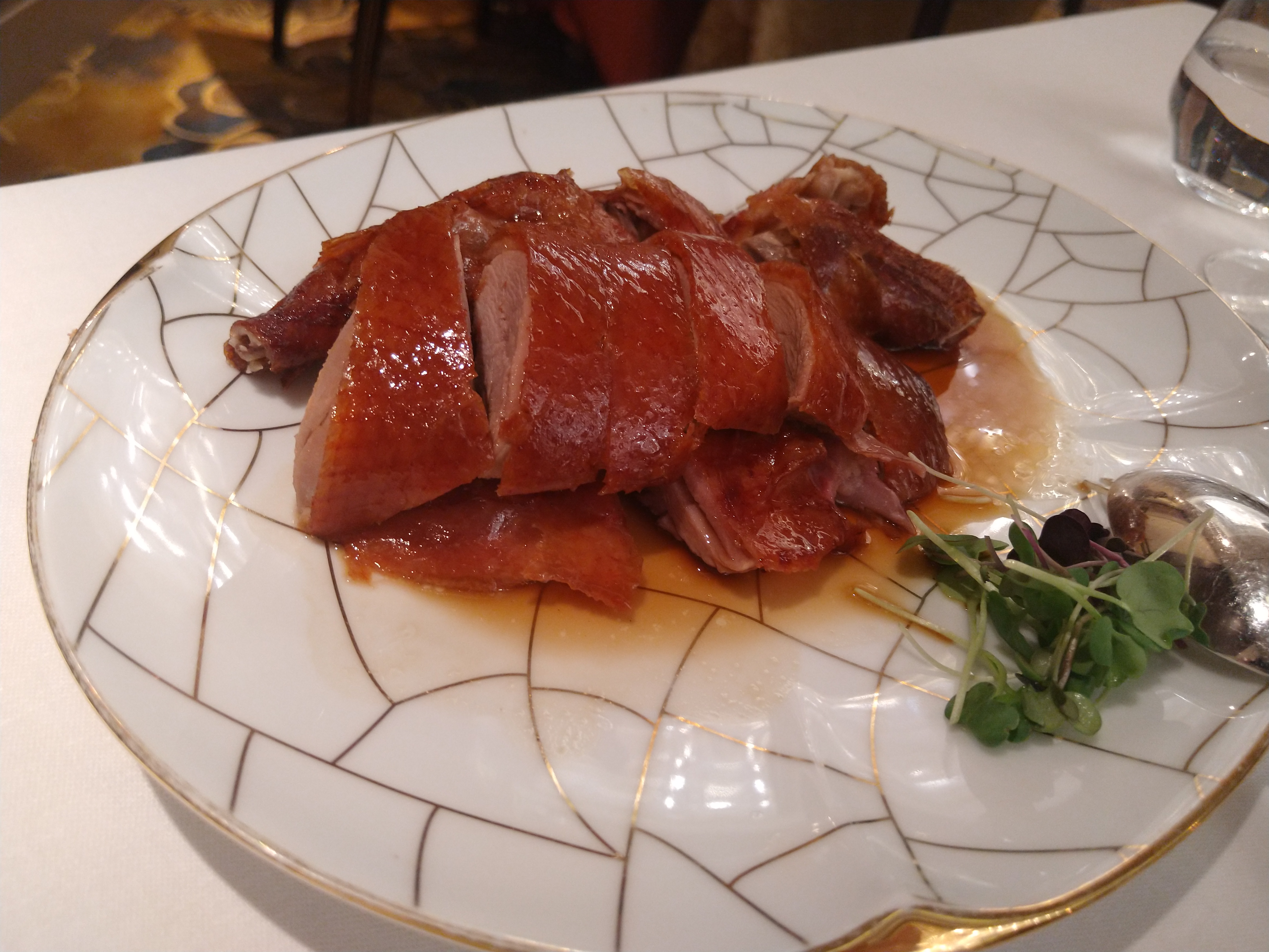 Un tres jolie restaurant dans un palace parisien un service irréprochable les vapeurs en entré parfait goûteux un régal LE CANARD LAQUÉ PÉKINOIS la c'était très différents en premier les crêpes, des disque de pâte de riz juste passés à la vapeur pas rôtis pas grille juste vapeur donc très collant et très molle donc quasiment impossible de faire un jolie rouleau et après 5 minutes les crêpes était inséparable collées entre elle. j'aurais aimé (c'est très personnel voir la découpe de la peau) le deuxième service une viande coupée finement servis avec des feuilles de salade iceberg ( la même salade que dans tout les fast food ) servi avec la même sauce que la peau croustillante . Nous avions espéré une découverte gustative et ce fut raté . De plus le mur a côté de notre table était maculé en plusieurs endroits Une expérience très moyenne