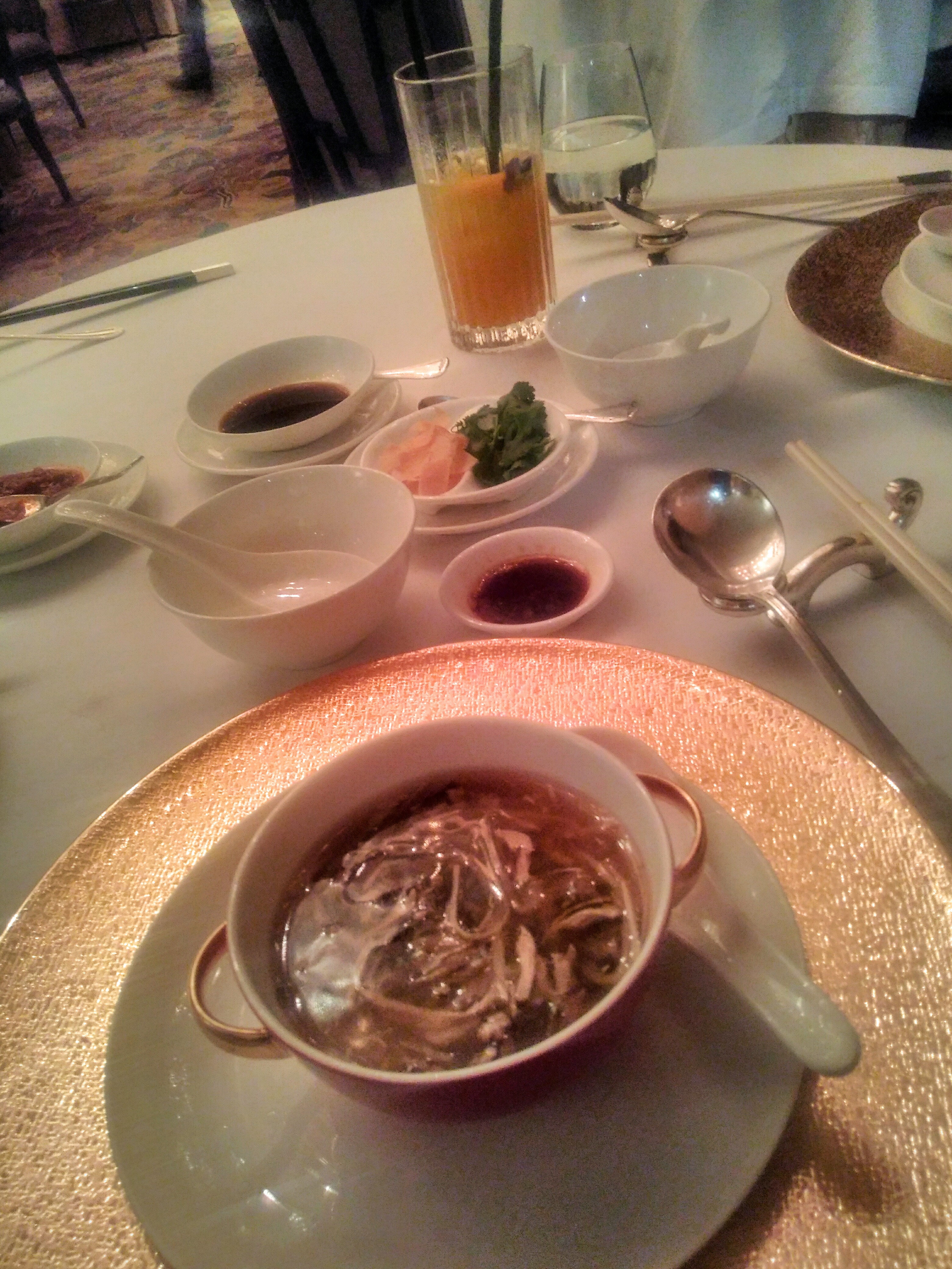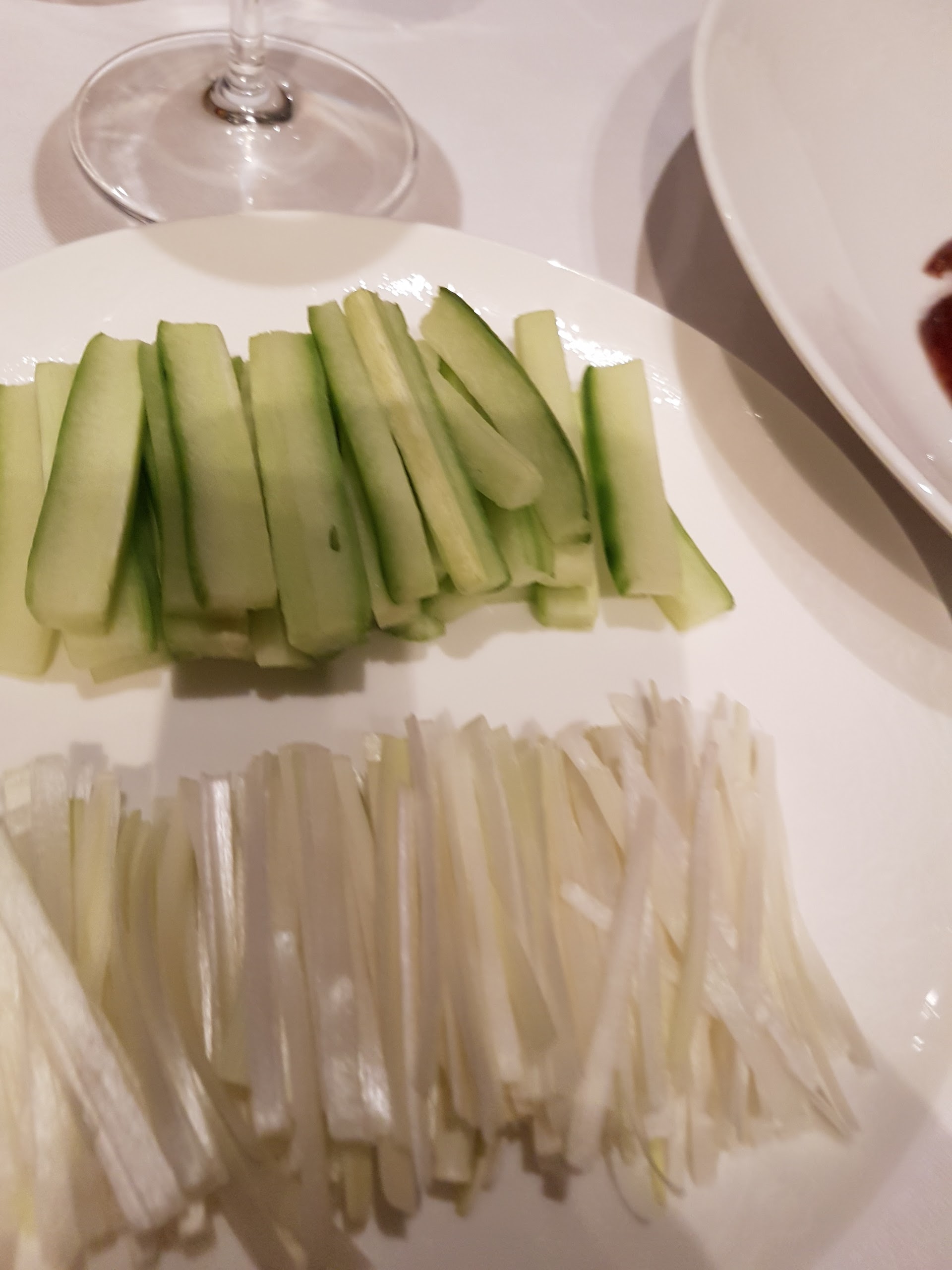 Nos attentes étau proportionnelles à l’occasion du Nouvel An asiatique où nous avons fait l’expérience et à la renommée de ce restaurant, et à vrai dire à son prix ! Nous avons choisi le canard laqué pékinois, plat traditionnel par excellence. Nous avons eu de sérieuses références chez d’autres concurrents reconnus à Paris mais aussi nous avons eu l’occasion de connaître le vrai goût à Pékin. Aussi, nous nous sommes attablés pour une grande expérience culinaire. Malheureusement cela a été une énorme déception au niveau gustatif comme au niveau de la présentation (dressing en frenglish). Qu’ont-ils fait de la belle viande du canard laqué qui nous a été enlevée illico presto de la table direction cuisine aussitôt après nous l’avoir montré ? En retour, on nous ramène une assiette avec de la viande réduite en charpie hachée menue, un plat “maison” improbable qui n’a rien à voir avec le plat original que nous avons commandé pour le Nouvel An asiatique. On en était venu à se demander si c’était de la même viande. Il reste le cadre, mais tout cela ne valait pas le déplacement. Conclusion: des regrets en plus, mais de l’argent en moins dans notre bourse.