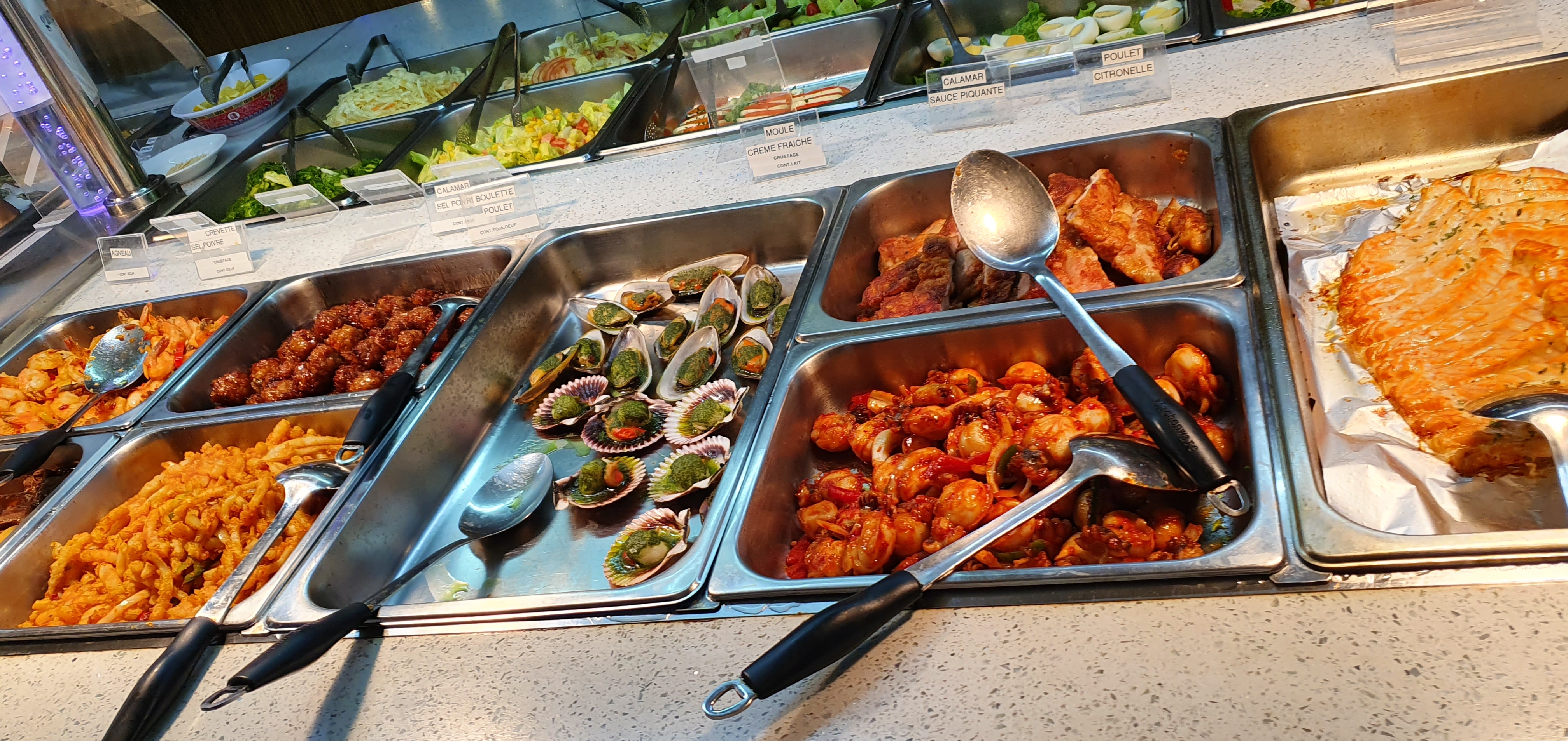 Obligés de manger halal, pas de nems porc, truc qui ressemble à du jambon mais insipide dans le riz cantonnais, qualité gustative bof. Et pourquoi des pizzas, des frittes, des bonbons en guise de dessert ... Dommage, j'étais venu pour manger chinois... mais on ne m'y prendra plus !!! Par contre, beau buffet pour le poisson et les crustacés !