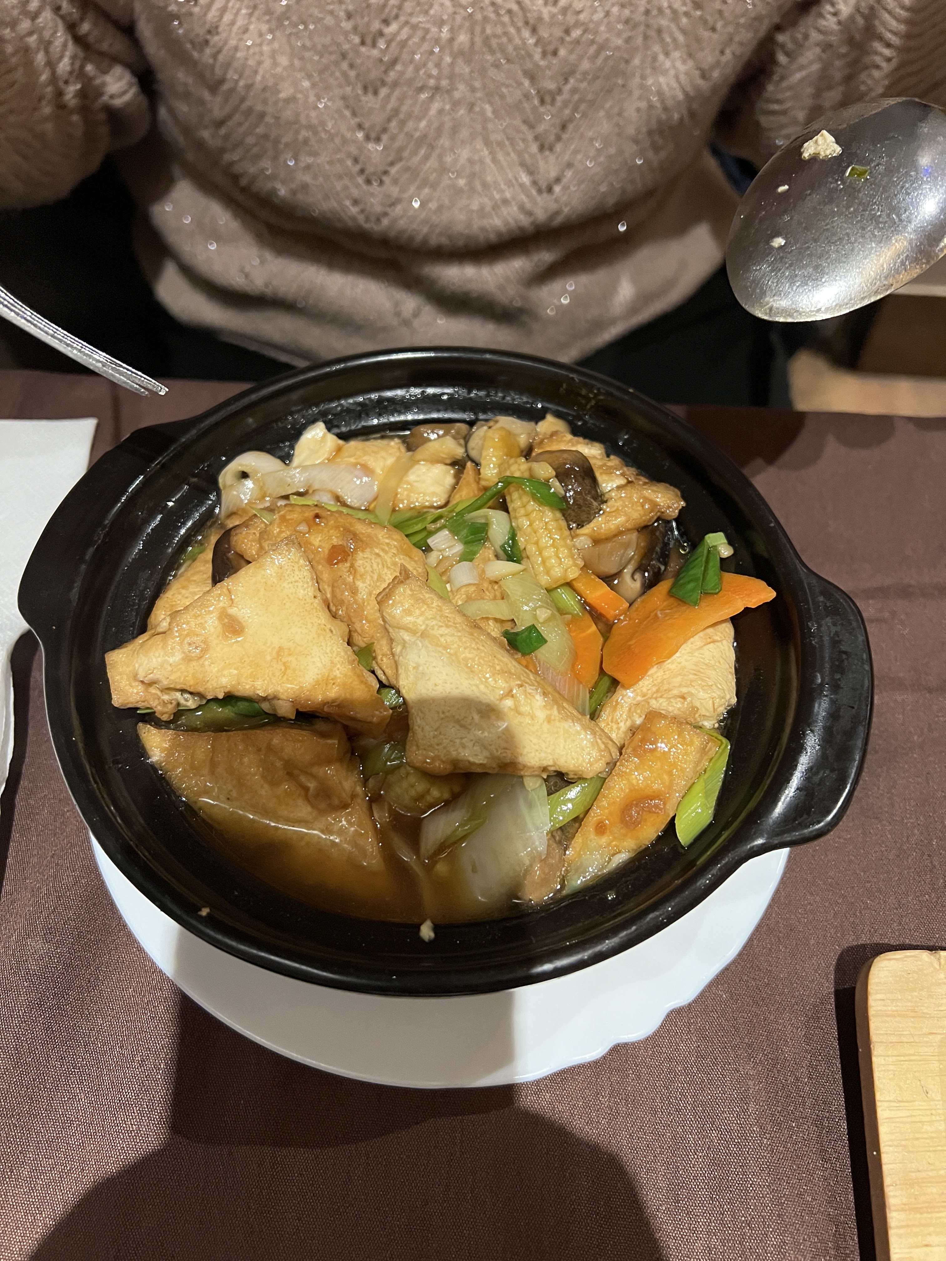 Goût modéré, ni trop gras ni salé Et je suis très touché de pouvoir manger chinois en France. La soupe aux légumes est très claire et vous pouvez en boire plusieurs bols Et chaque assiette contient beaucoup de nourriture Il en reste encore après avoir mangé Très plein