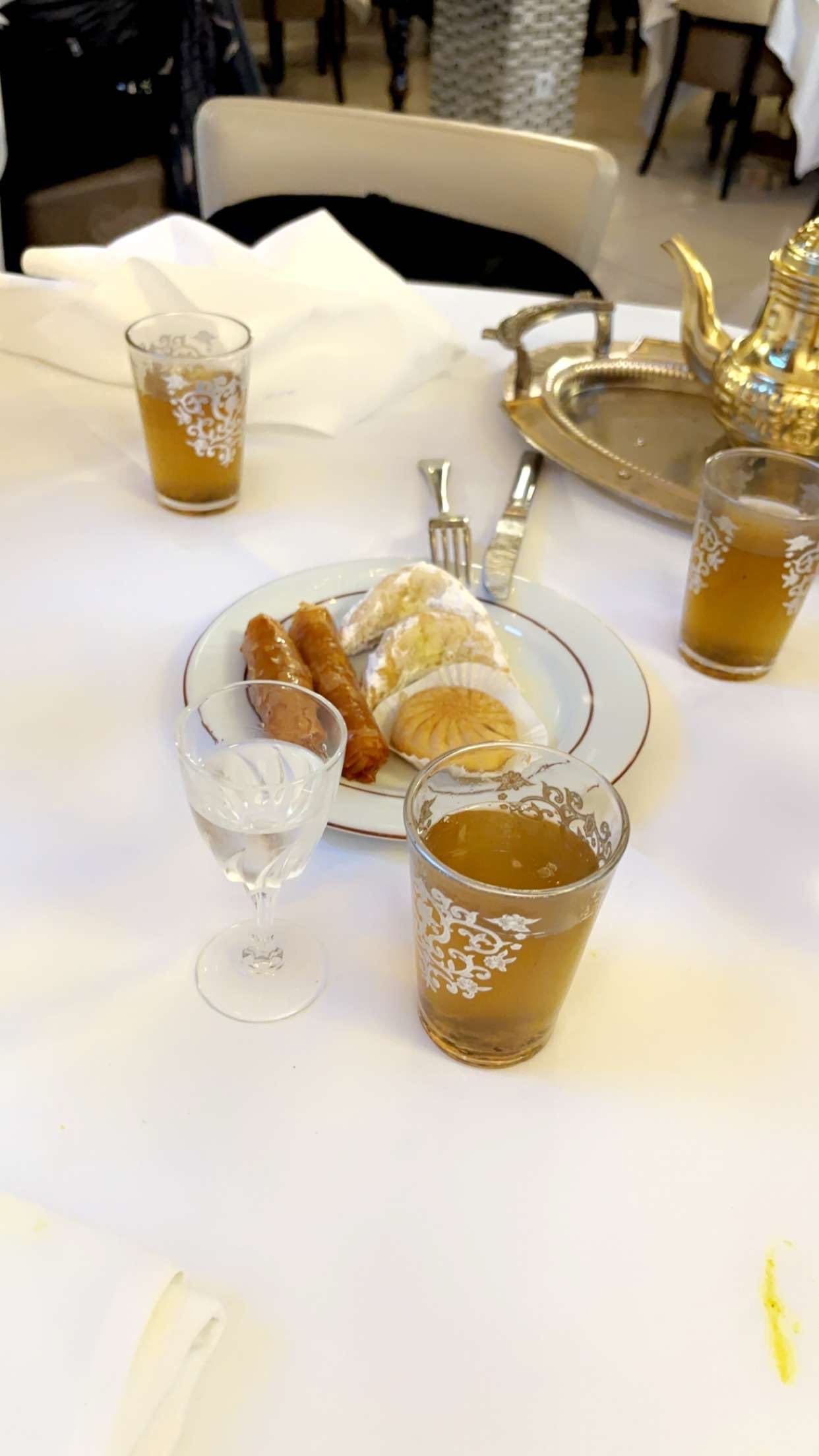 Repas bon mais cher, et les quantités ne sont pas respectées. En effet, nous étions deux à prendre un couscous, on nous a ramené un plat à partager à deux, peu de viandes...et les pâtisseries, nous avions pris un assortiment de 5 pâtisseries par personnes, nous étions 5, donc 25 pâtisseries en tout...Or, on nous a servi un plat avec 20 pâtisseries, avec peu de variétés,un peu décevant!!!Bien sûr il n'ont pas oublié de facturer quand même 25 pâtisseries!!pas très honnête!