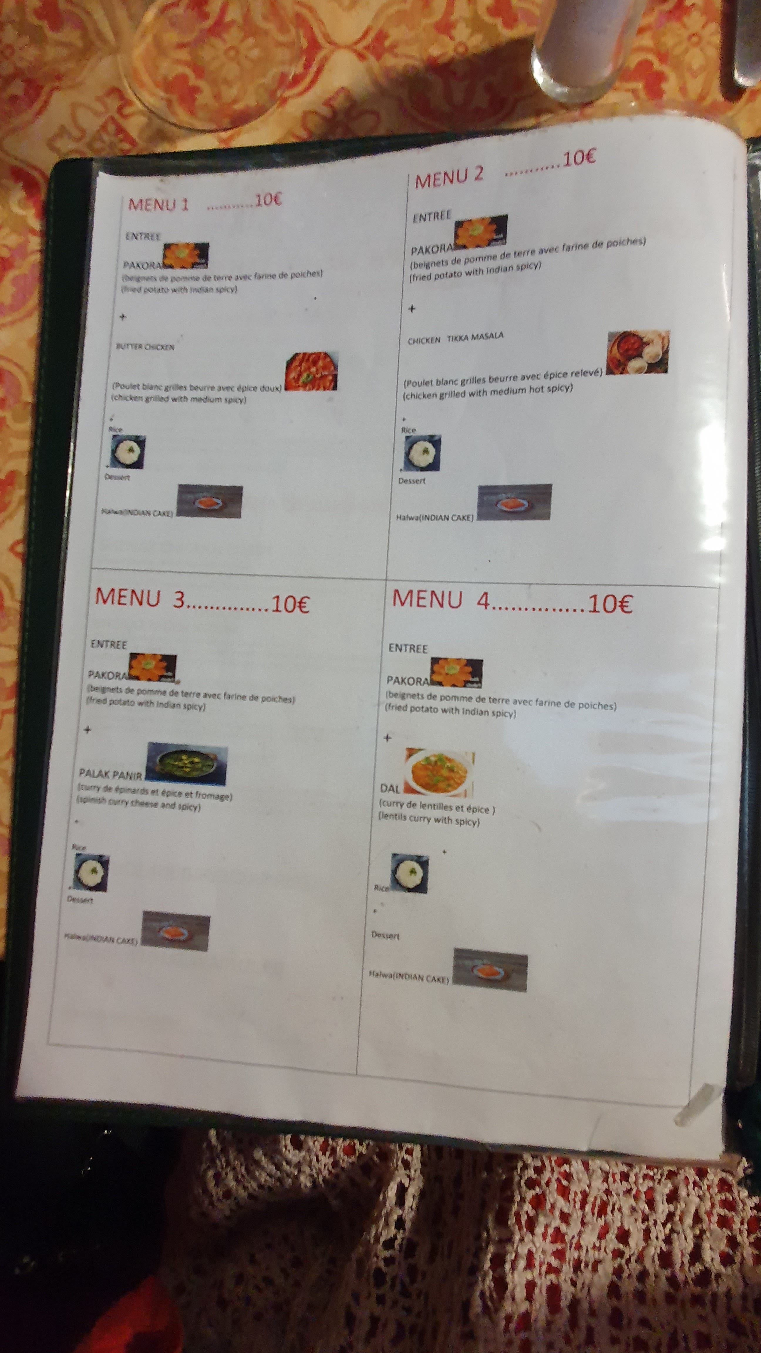 Nourriture solide et super bon marché. 10€ le menu avec naan, poulet au beurre et dessert. Un peu moins de 12 € le litre de vin maison. Fortement recommandé!