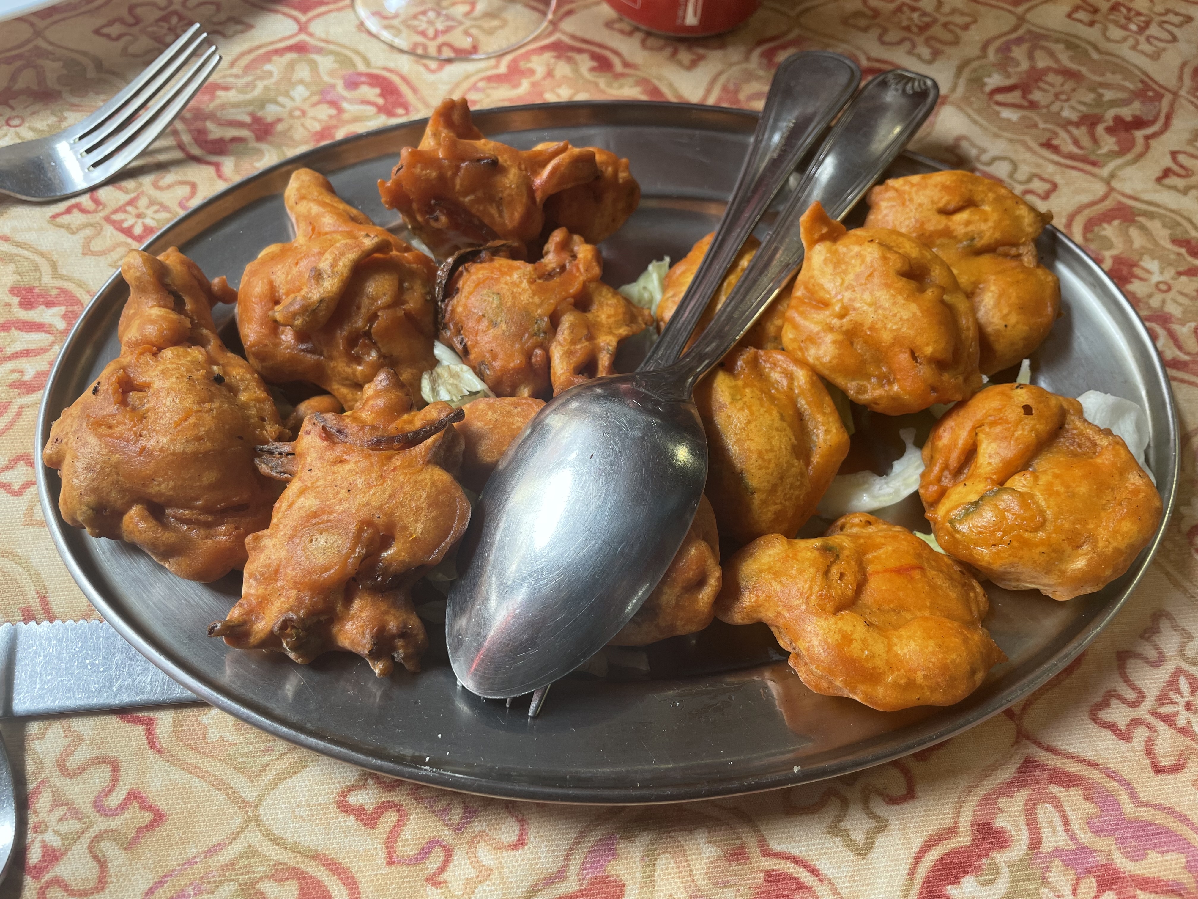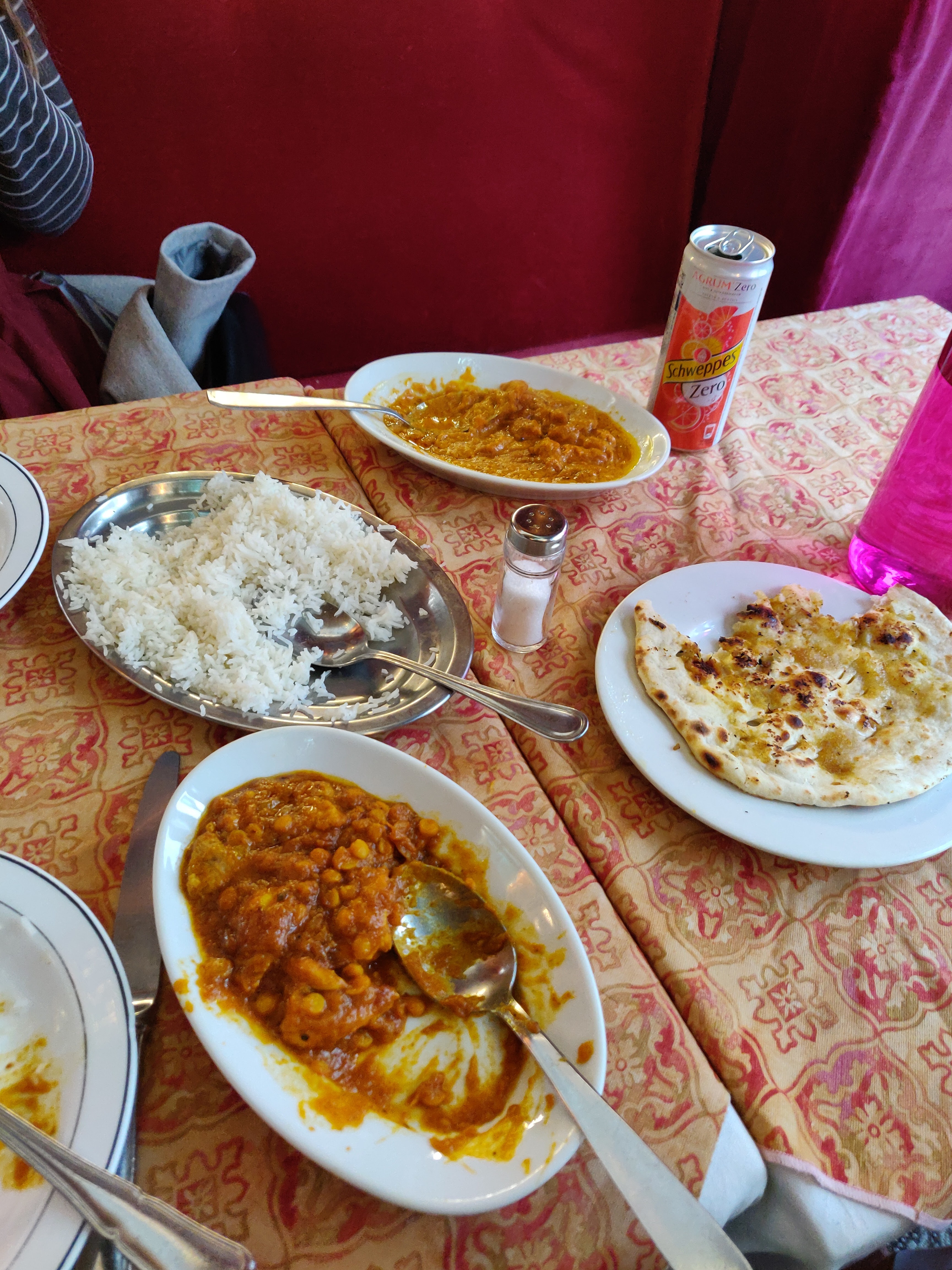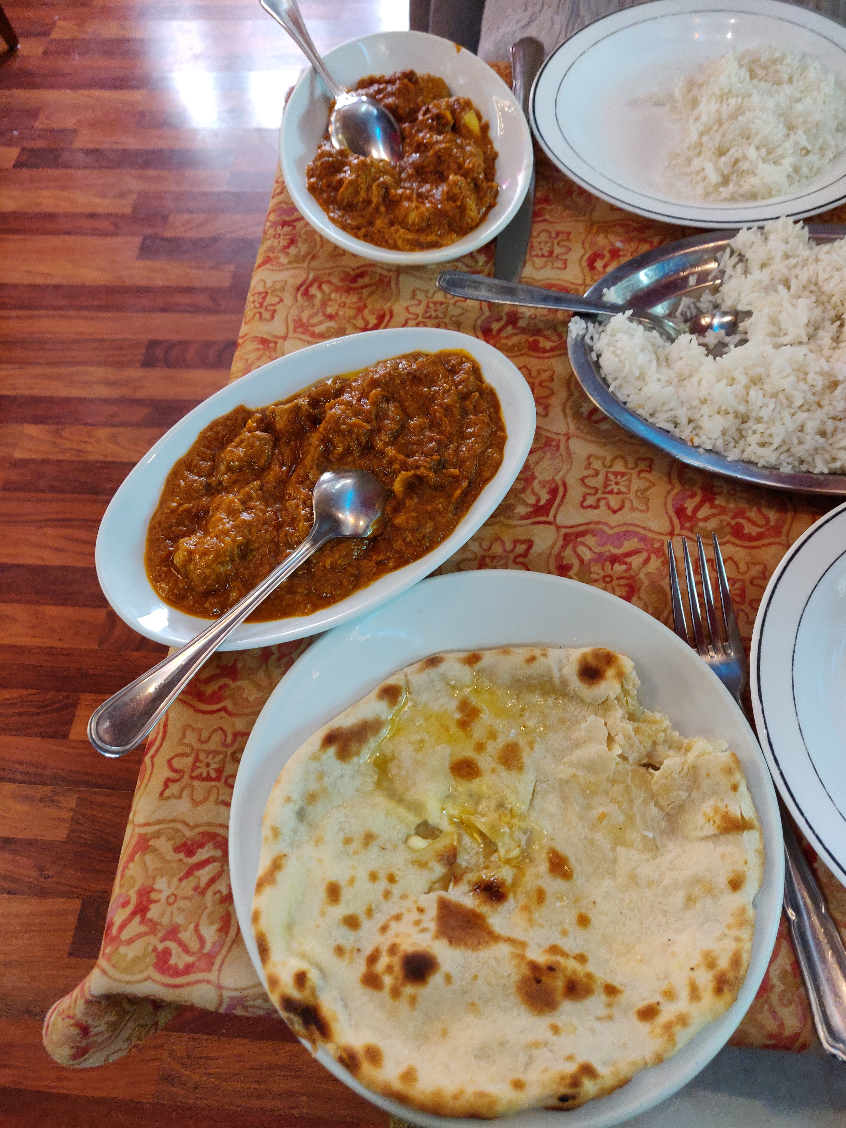Nappe tachée, cheese naan sans aucun fromage et trop cuit, butter chicken servi dans une purée, poulet rouge en forme de crevettes, je n’en ai presque pas mangé tellement c’etait mauvais. Poulet vindaloo aussi en purée, riz basmati tout sauf basmati… Heureusement ce n’etait pas cher