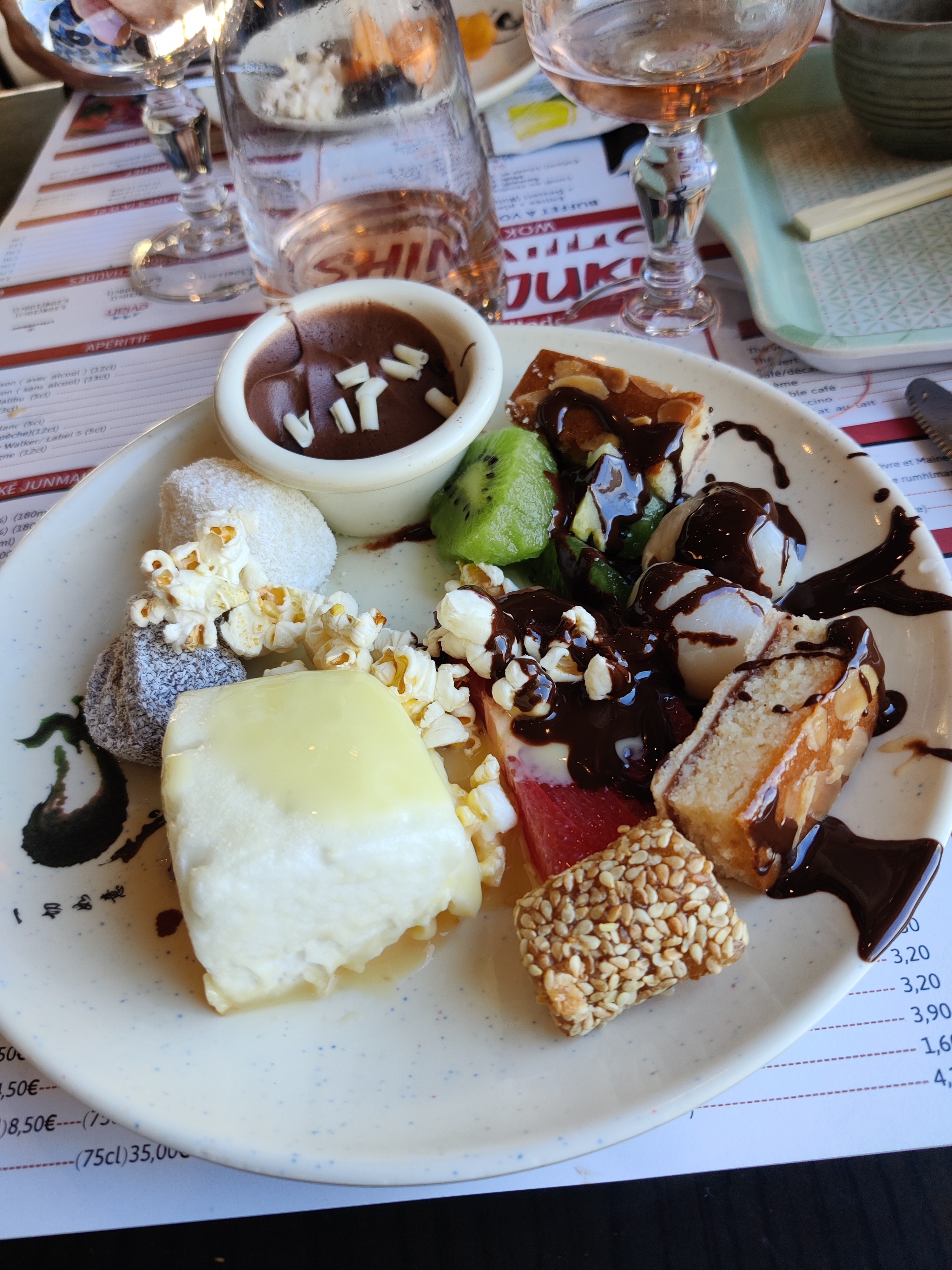 Très large choix au niveau des sushis. Bon les desserts (éclair au chocolat et beignet 🍩 par ex.) ne sont pas très frais, plus du surgelé, et les mini crêpes un peu fades même avec la fontaine de chocolat... Dommage