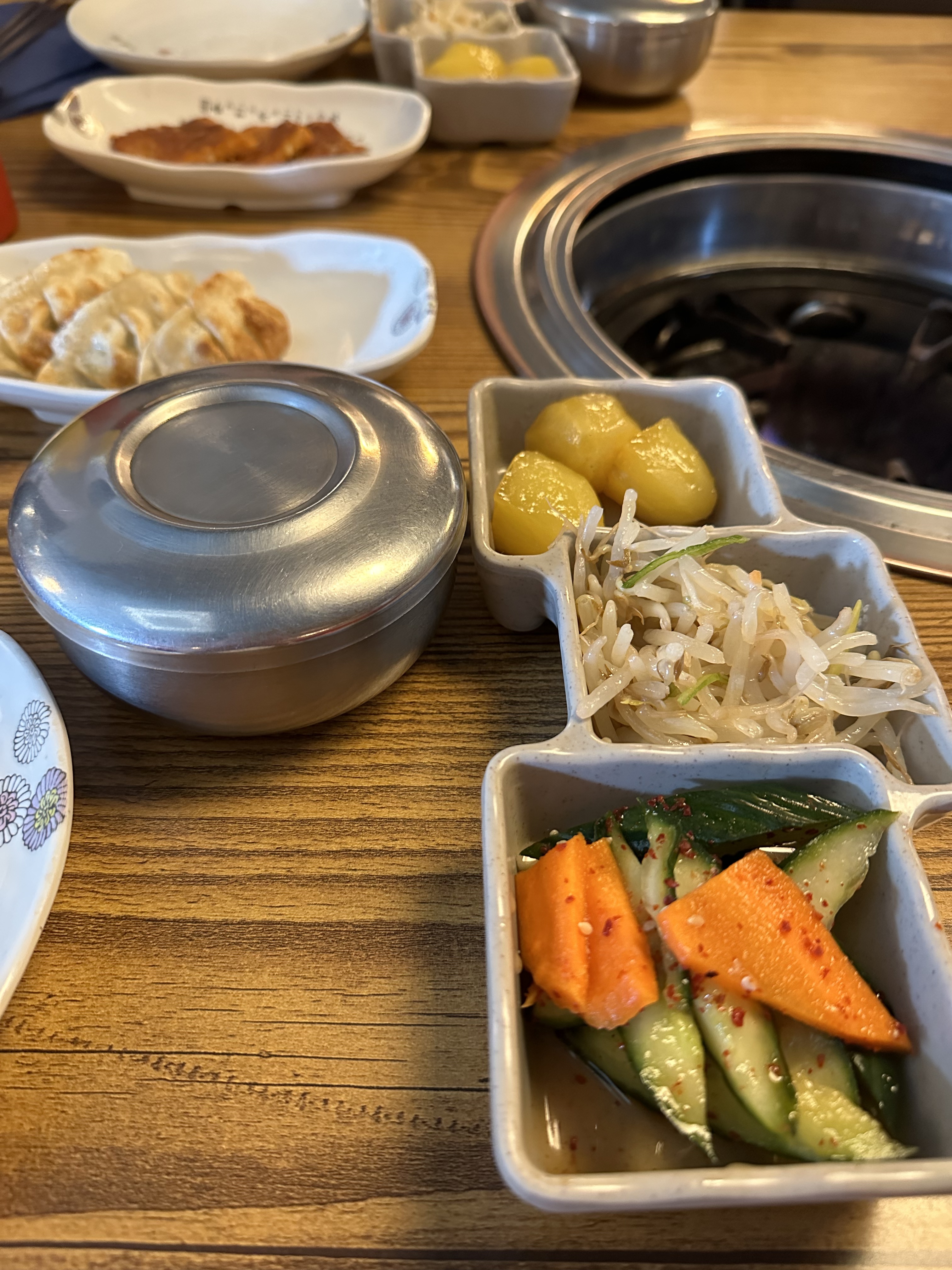 Très bon repas coréen: en entrée raviolis puis barbecue bœuf, bibimbap au bœuf, bibimbap kimchi fromage et œufs de poisson, le tout accompagné de riz nature et de divers mets. Un régal !