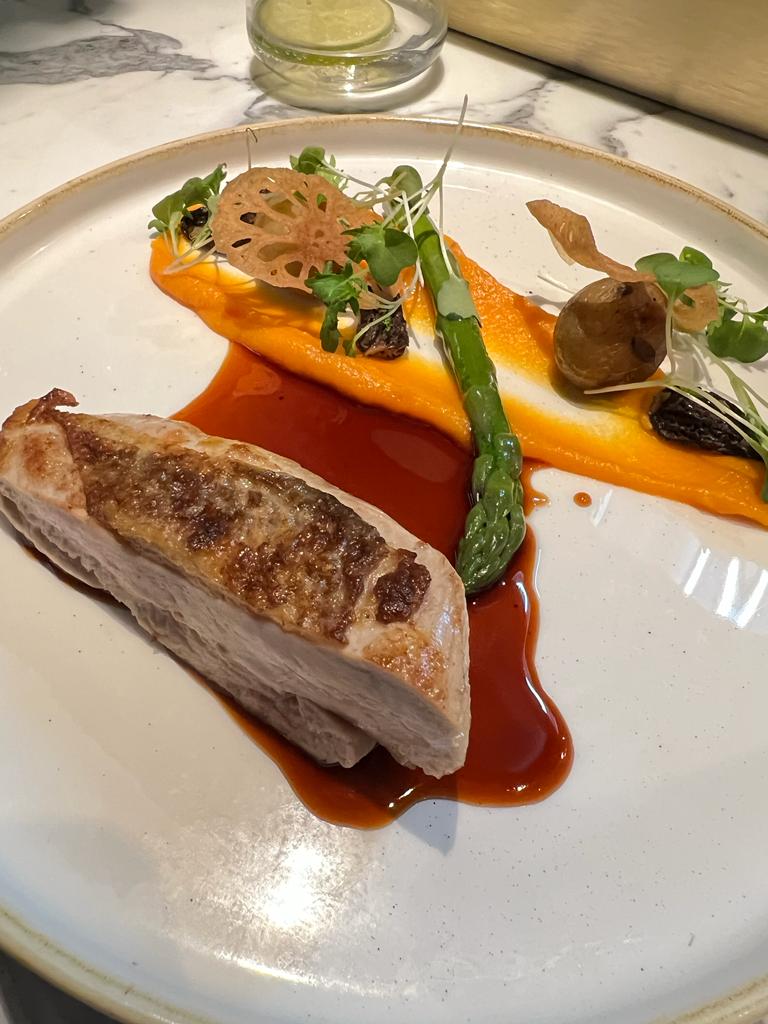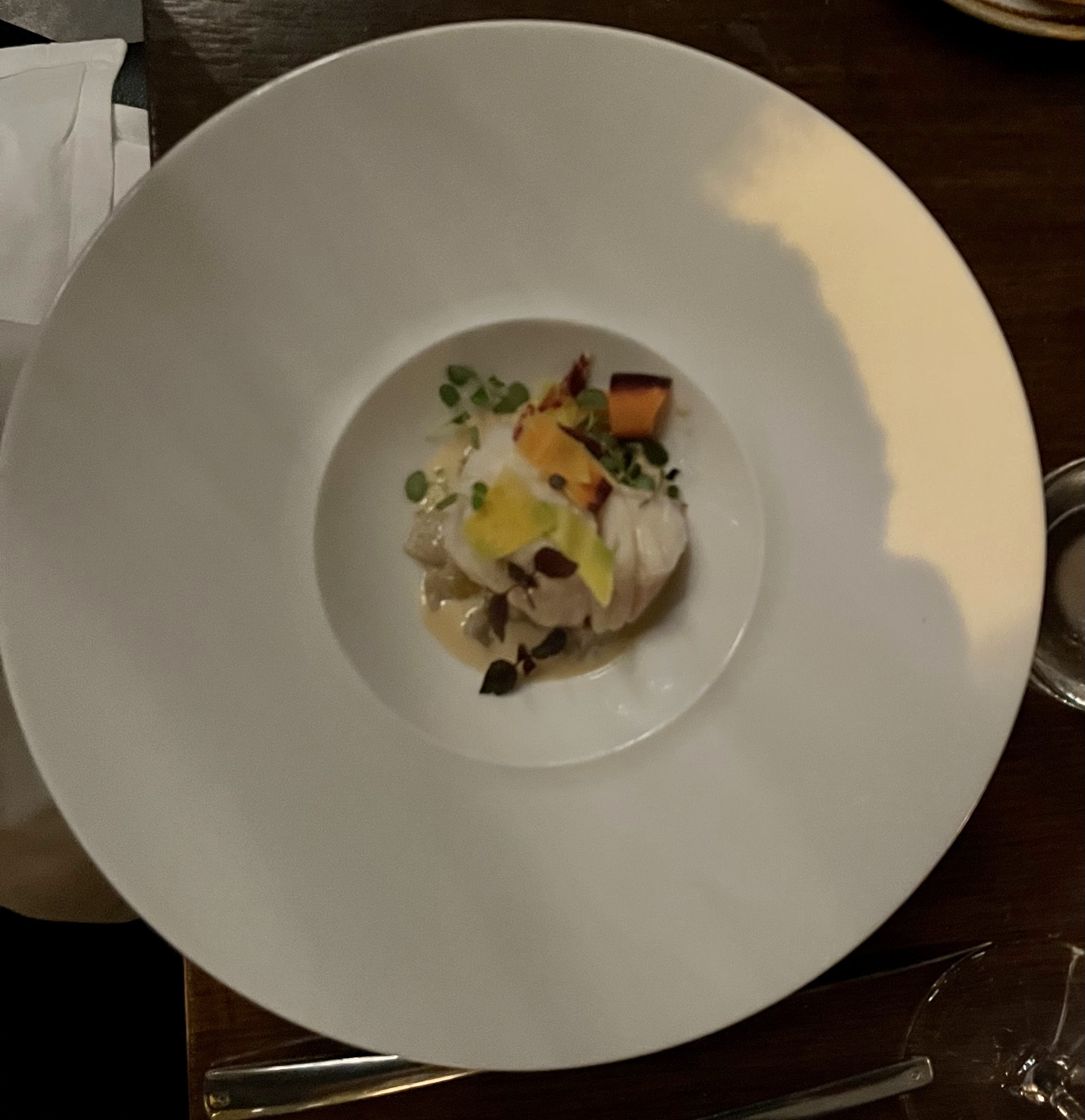 Incompréhensible. Menu en 7 étapes, 5 accords mets et vins et .. Les nages et émulsions étaient malheureusement beaucoup trop salées pour deux des étapes sur les sept, au point de ne pas finir les plats pour 2 personnes sur 4 attablées. Deux étapes avec de l'asperge verte puis blanche, un peu étonnant de tourner sur les mêmes aromatiques et ambiances sur deux étapes d'affilées. Un dessert avec du chocolat, du praliné, de la meringue, on n'en vient pas à bout. Deux vins sur trois beaucoup beaucoup trop fermés il a fallu demandé à ce qu'ils soient carafés pour les aérer, ça peut arriver mais 2 sur 3 bon .. dommage Service hésitant jusqu'à une contradiction dans l'énoncé du dessert la glace sera à la poire.. euh ou à l'orange selon ce que le chef à choisi ce soir, je peux comprendre si l'équipe est nouvelle mais c'est étonant pour la qualité du restaurant et le prix de la carte.. Je n'en veux pas du tout aux serveurs qui étaient très gentils et voulaient bien faire mais c'est très étonnant pour le standing du restaurant, l'accumulation de petites choses a fait de cette expérience une déception, c'est dommage pour 240€ par tête.