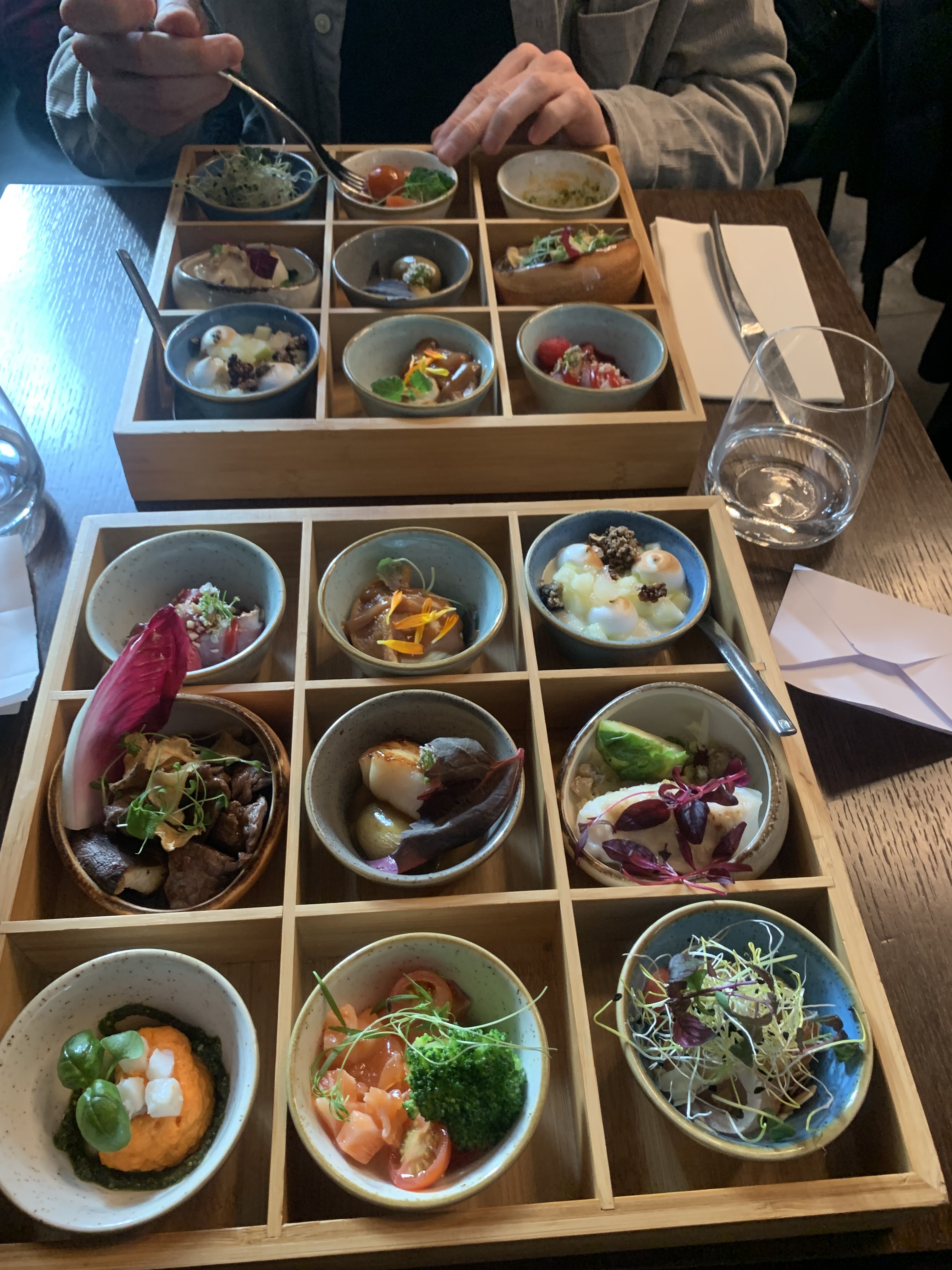 Formule Bento déjeuner exceptionnelle pour 35e. Originalité et diversité des 9 portions réparties en entrées, poissons, viandes, dessert font du déjeuner une expérience copieuse et exploratrice. Un service au top! Merci
