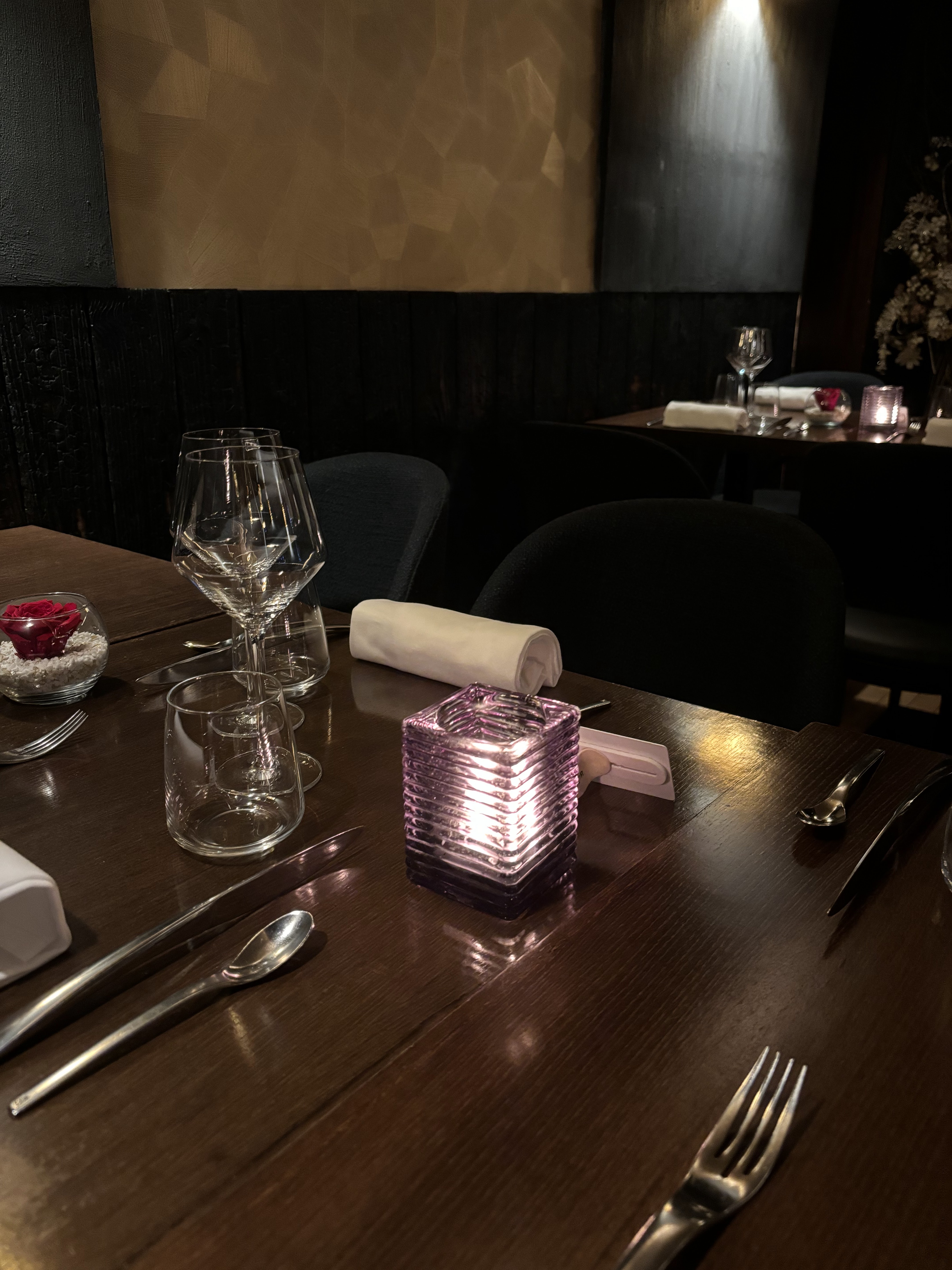 Le cadre est joli, la lumière est ajustée selon l’ambiance. Les plats sont bons. Nous avons pris le menu de 8 plats. D’habitude on etait bien calé à la fin mais là on était resté sur notre faim. Sur qualité/prix, je trouve que c’est un peu cher.