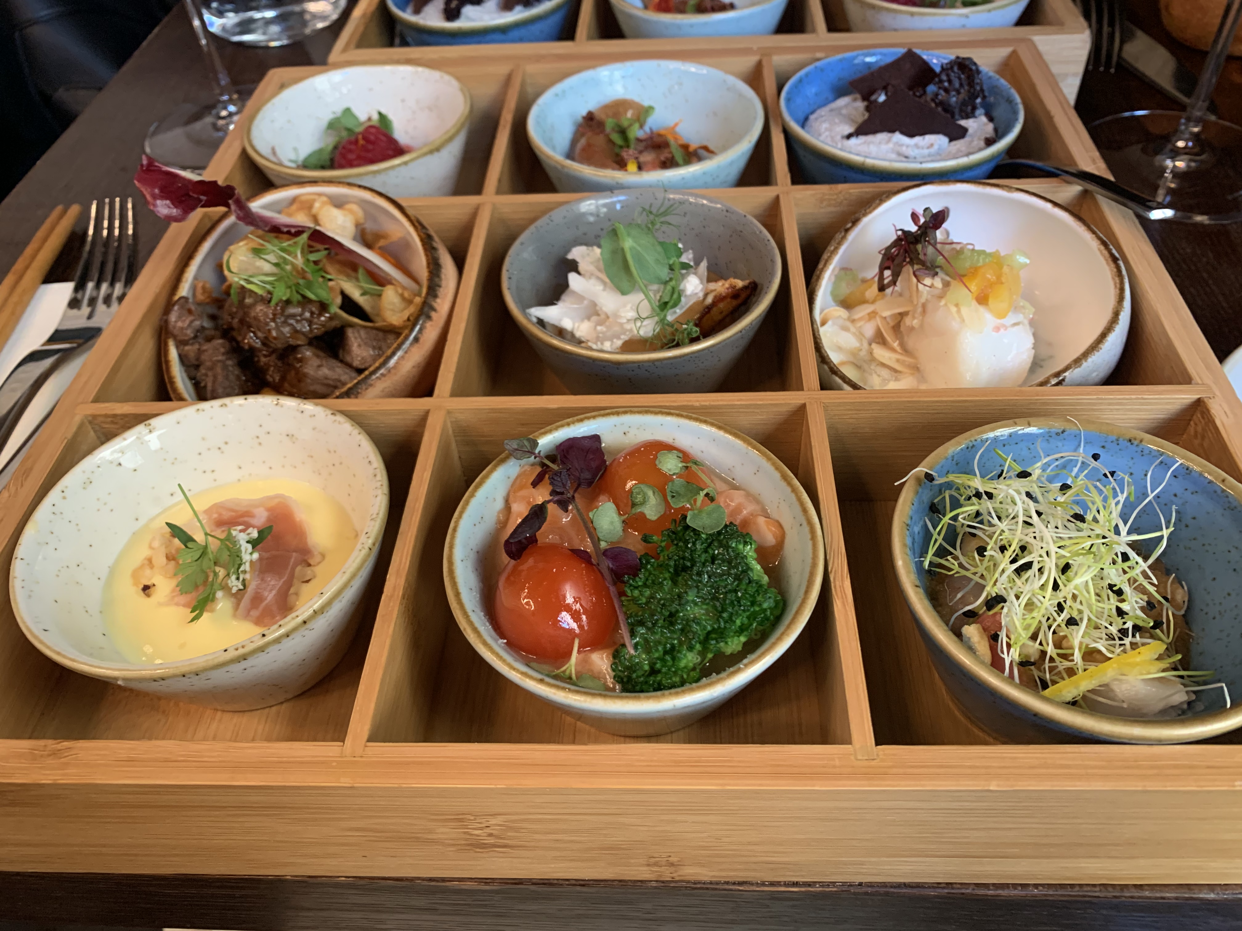 Nous sommes venus déjeuner au restaurant le 31 mai 2022 et avons commandé deux menus Bento. Les 3 premiers bols (entrées) étaient très bons, délicats et raffinés, les 3 suivants (plats) étaient bons mais nous étions un peu déçus par la qualité de la viande Angus qui n’était pas tendre, et les saveurs moins raffinées, enfin les 3 derniers (desserts) nous on beaucoup plu et nous avons retrouvé cette délicatesse des entrées. Pour finir la carte des vins est clairement à revoir, car beaucoup trop onéreuse pour la qualité des vins proposés (un verre de chardonnay sans bouche, et un pinot gris qui s’en sort tout juste…les deux verres pour 30€…nous étions déçus de ce point…) Dans l’ensemble un sentiment mitigé même si nous avons aimé tous ce que nous avons eu l’occasion de déguster.