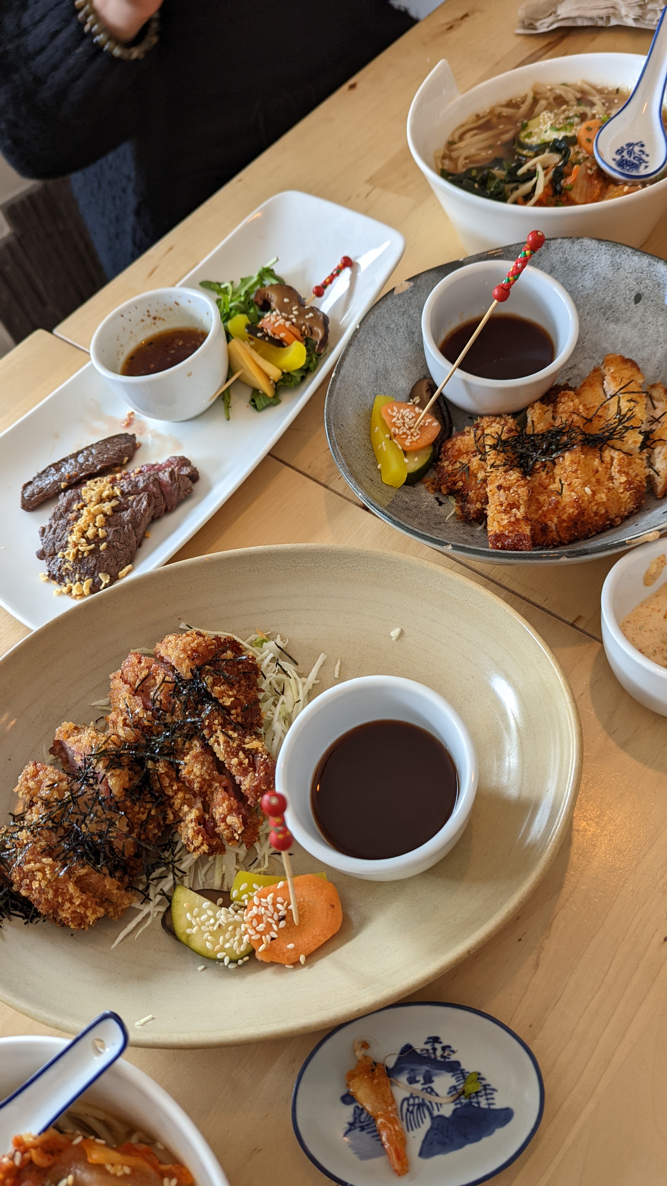 Premier passage dans ce restaurant. Les plats sont assez copieux, en tout cas en adéquation avec les prix (ce qui loin d'être toujours le cas avec les restaurants japonais ou de sushis...). Un peu plus de légumes et champignons serait bien, les soupes miso sont un peu communes (mais peut-on vraiment faire autrement ?). L'escalope panée, les brochettes, les gyozas et les nouilles sont excellents. Je recommande ce restaurant.