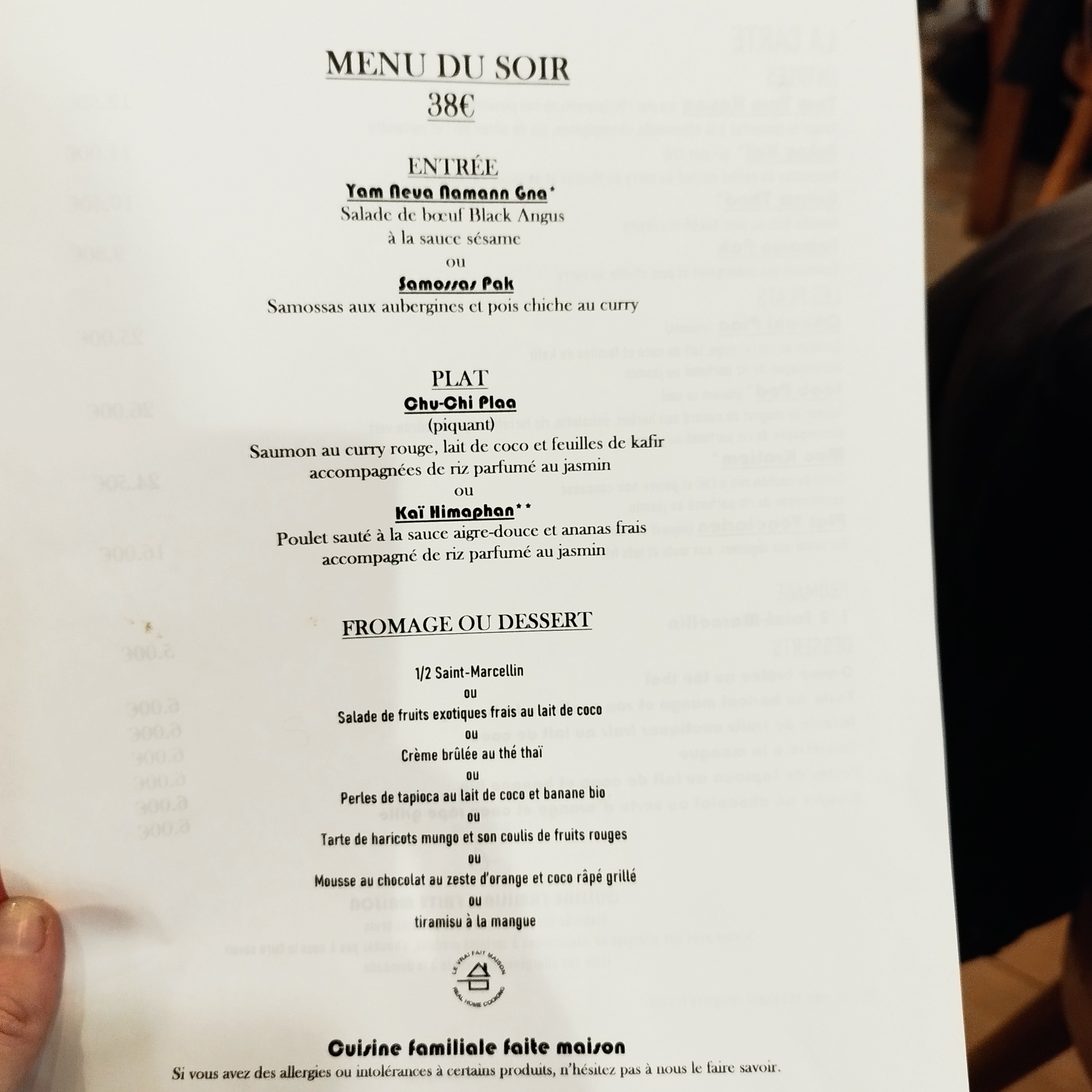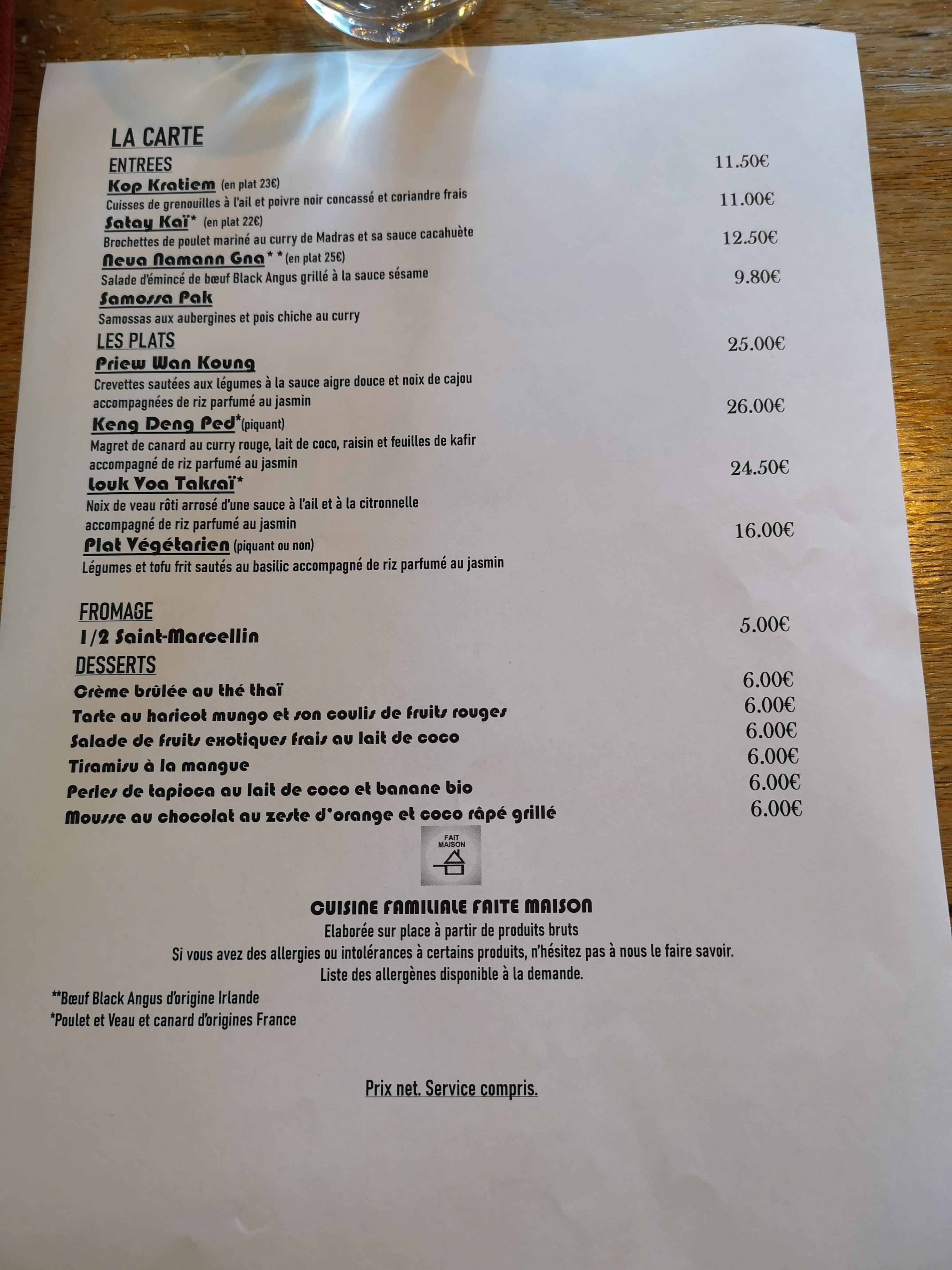 Excellent plat du jour. Un bon compromis entre cuisine thai et française. Le service est rapide et très agréable.