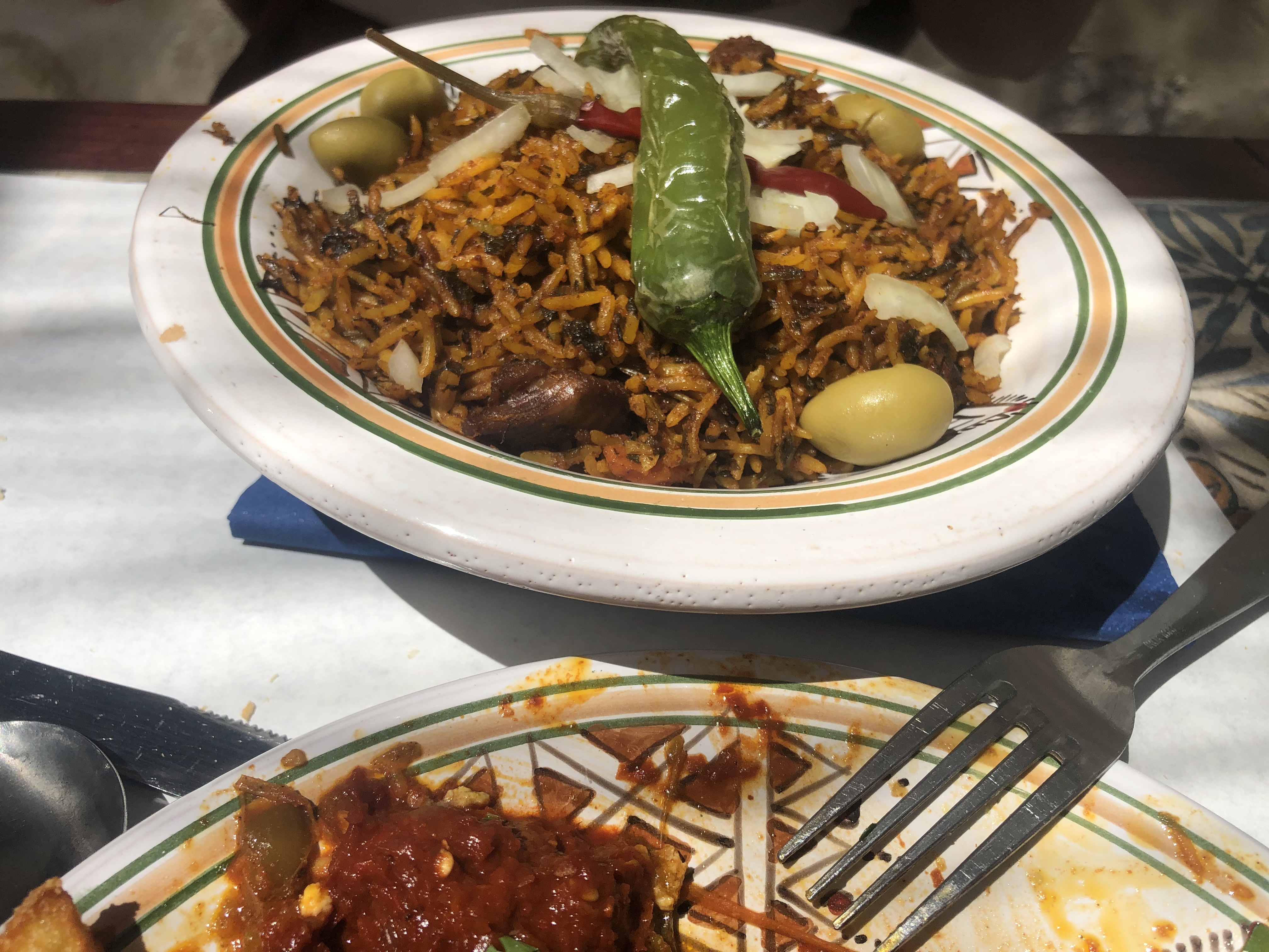 Nous avons eu du riz tunisien préparé avec du bœuf de manière traditionnelle, de la salade tunisienne au hrissa. Nous terminons notre dîner avec du thé vert. Le service était bon et les serveurs étaient souriants et très patients.