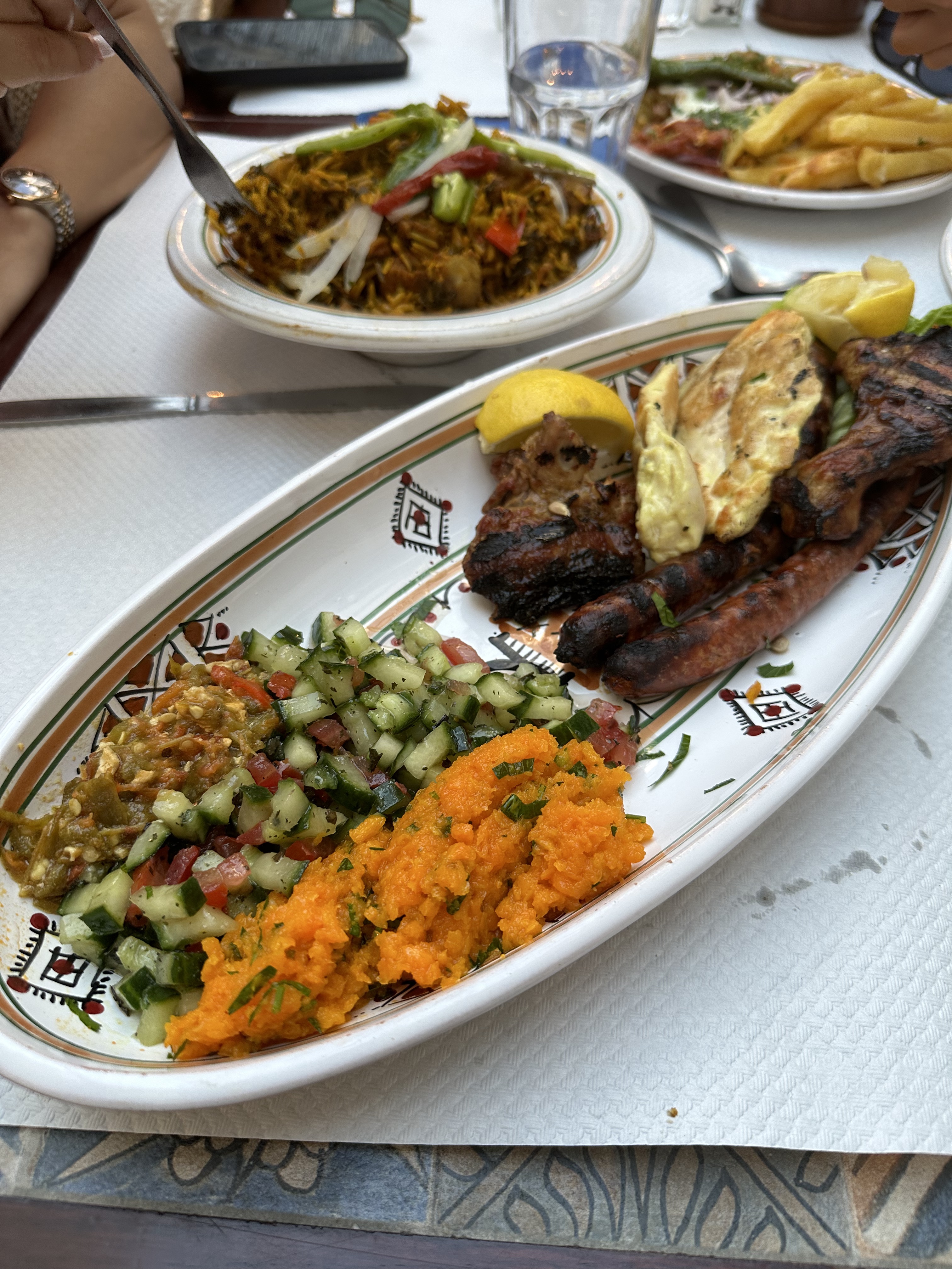 De plus en plus cet ex beau restaurant tunisiens deviens pire. Les serveurs sont gentilles mais la moitié du le menu n’est pas disponible et la cuisine et loin d être bonne et la quantité n’est plus raisonnable vu le prix des plats( sur les photos c’était un demande de supplément que je n’est pas payé, mais je l’ai demandé, imaginant la quantité initiale d une grillade mixte ! D ailleurs l’escalope de poulet m’a fait un gastro! Faut changer de chef, car il n’est pas du tout compétant en plus il parle mal ai client , c était une simple demande d un verre de thé !!
