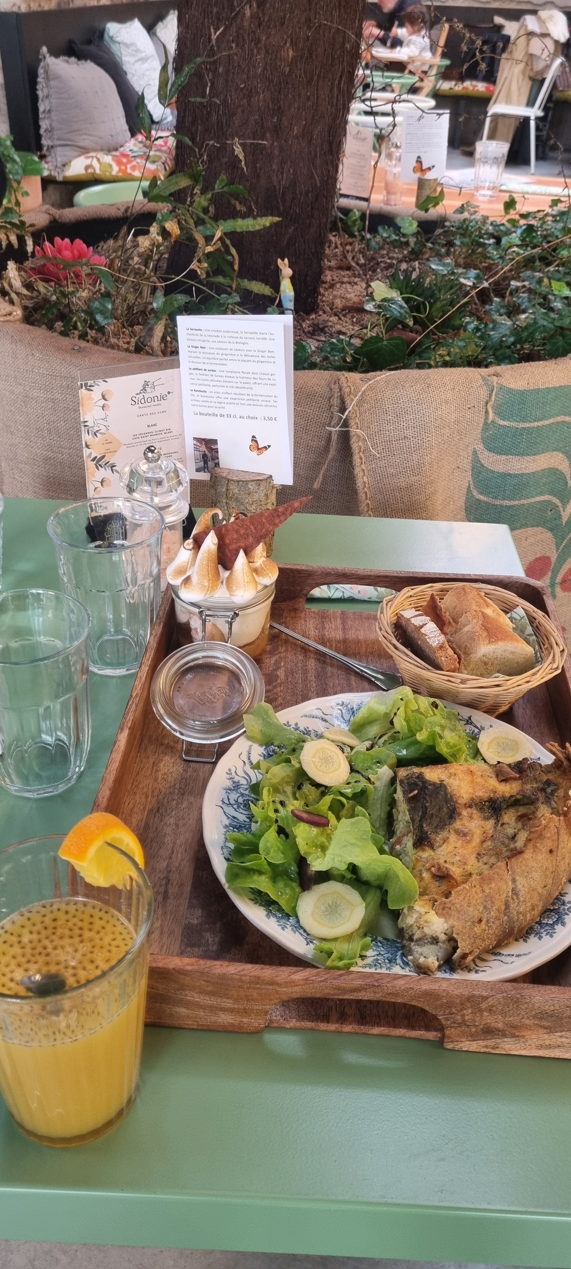 Quel plaisir ! La décoration est magnifique, la vaisselle vintage nous rappelle notre enfance et le fond sonore de gazouillis d'oiseaux crée une ambiance paisible. Quant au repas, une vraie merveile ! Plat et dessert, cuisinés maison, avec de très bons produits locaux, un vrai délice ! Félicitations à toute l'équipe !