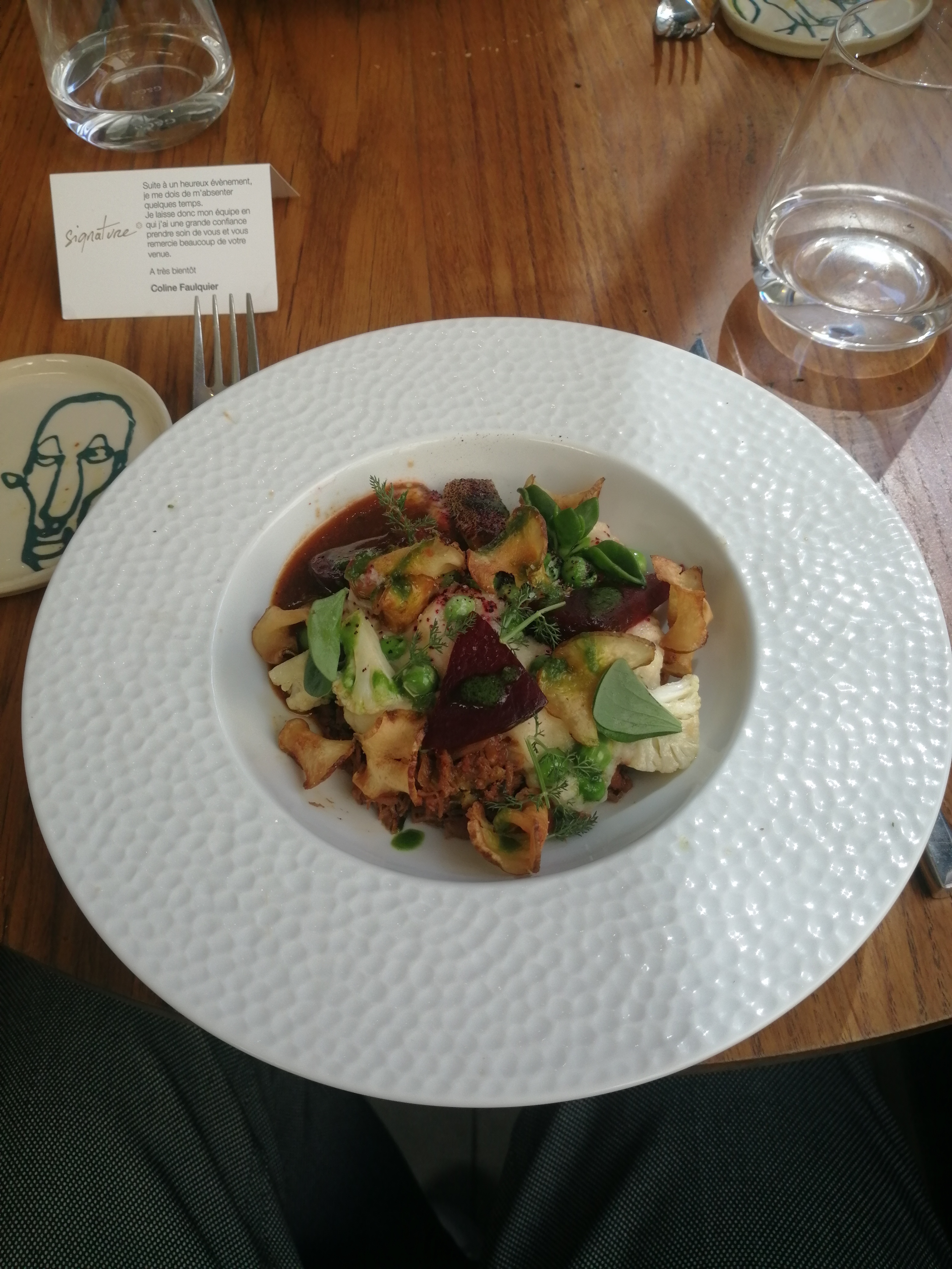 Aujourd'hui dans 1 lieu sympathique et convivial, nous avons dégusté 1 cuisine originale, savoureuse, goûteuse, audatieuse et merveilleusement bien présentée. Félicitations et Merci à Coline