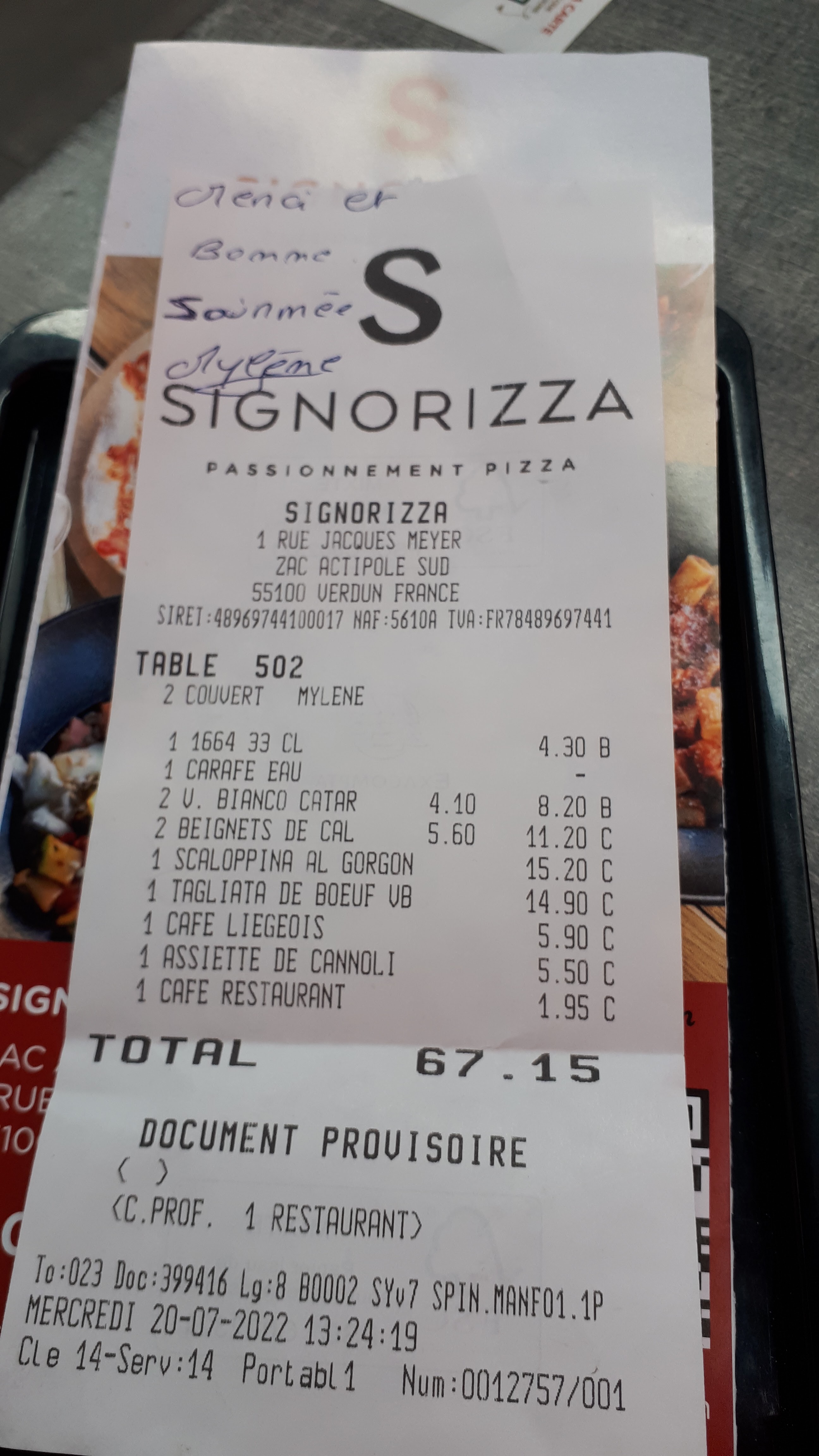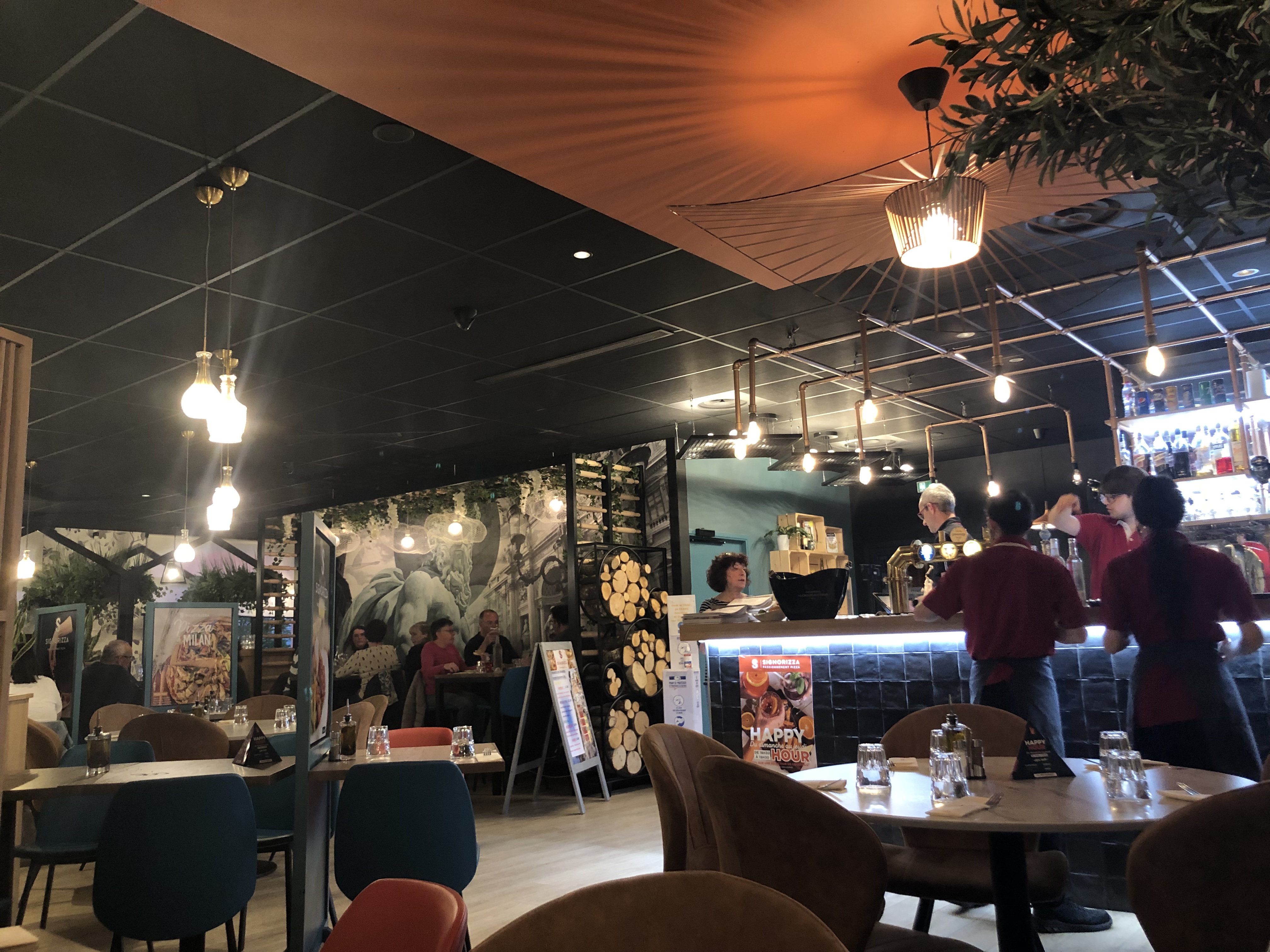 Tourangeaux de passage, nous avons pu réserver assez tardivement ce qui fait déjà un très bon point, par ailleurs notre serveur Christophe était très arrangeant et souriant, cela a rendu le repas pétillant. Il en était de même pour la dame aux cheveux frisés. La déco intérieure est chaleureuse et colorée (contrairement à la terrasse un peu tristounette et tâchée). Sans compter combien le repas était excellent et copieux, des cocktails aux desserts. Merci Signorizza Verdun !