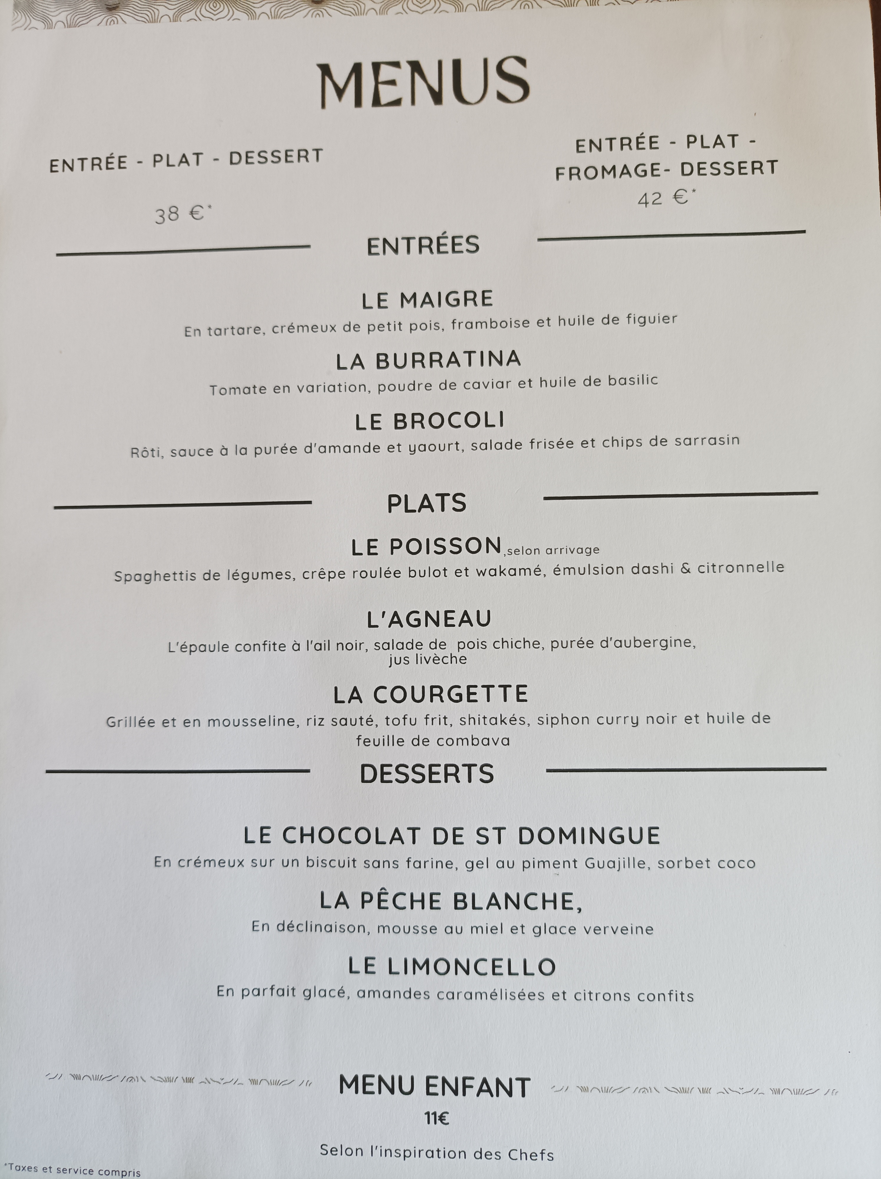 Nouvelle carte des Menus (soirs et Week-end) +Très belle grande table, tout était Excellent, car derrière des titres simples se cachent des mets de qualité tous en finesses, y compris le menu enfant qui sort enfin du steak-frittes: Les enfants ont tout mangé.. Les 3 fromages sont excellents (en option) et le pain croustillant. Ce Silex mérite 6 ☆☆☆☆☆☆ surtout avec ce cadre aéré acceuillant moins de tables et pour une meilleure qualité que l'ancien Miton. Il y à aussi des vins d'exceptions.