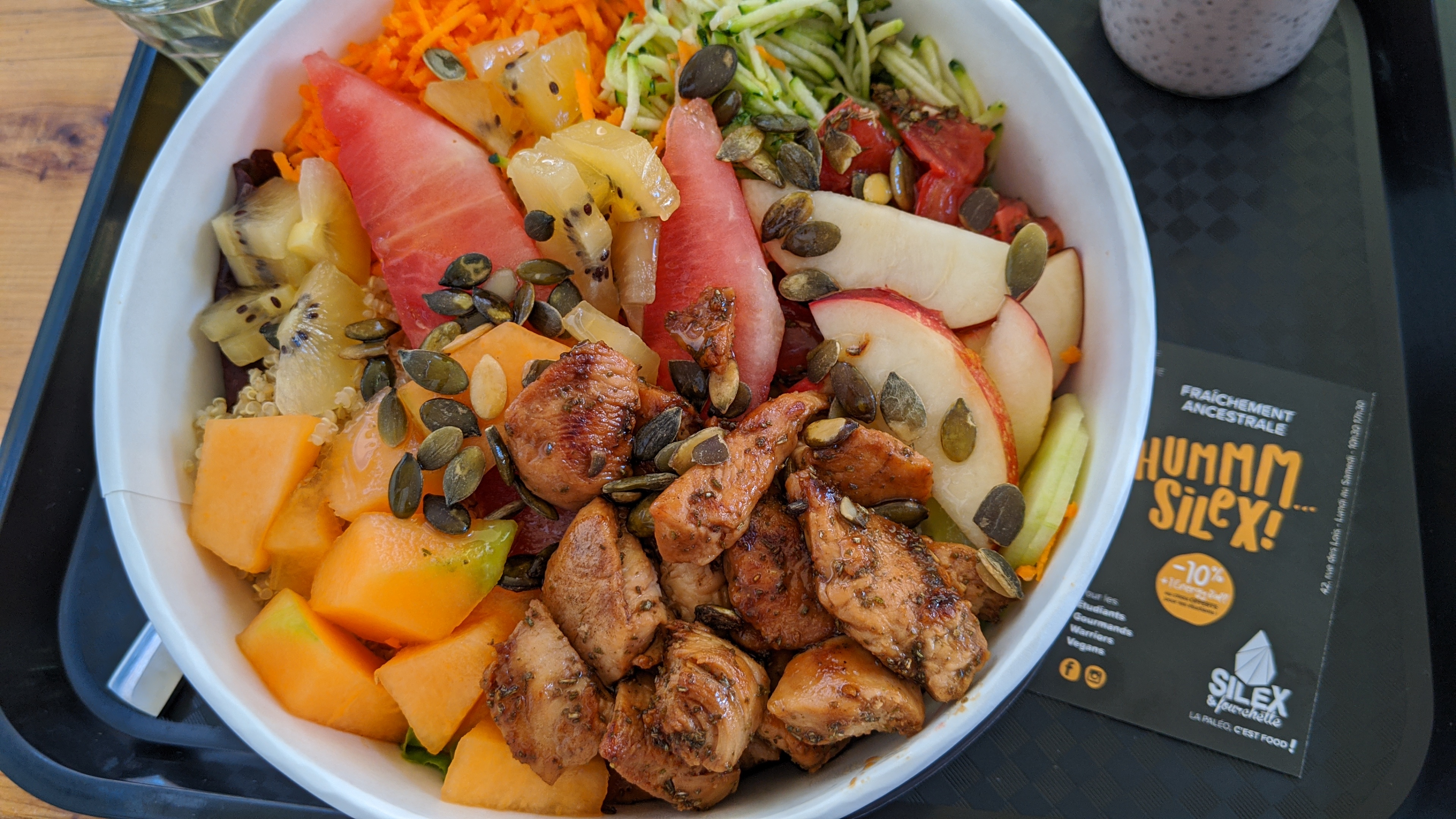 J'ai pris une formule, patate douce chili version carni et la salade de fruits du jour pour prendre le train ensuite. C'était délicieux !!! Les energy balls j'adore!!! Je dois me rappeler qu'elle font un repas complet sinon j'en mangerai sans cesse... Bravo ! J'ai hâte de revenir sur Toulouse.