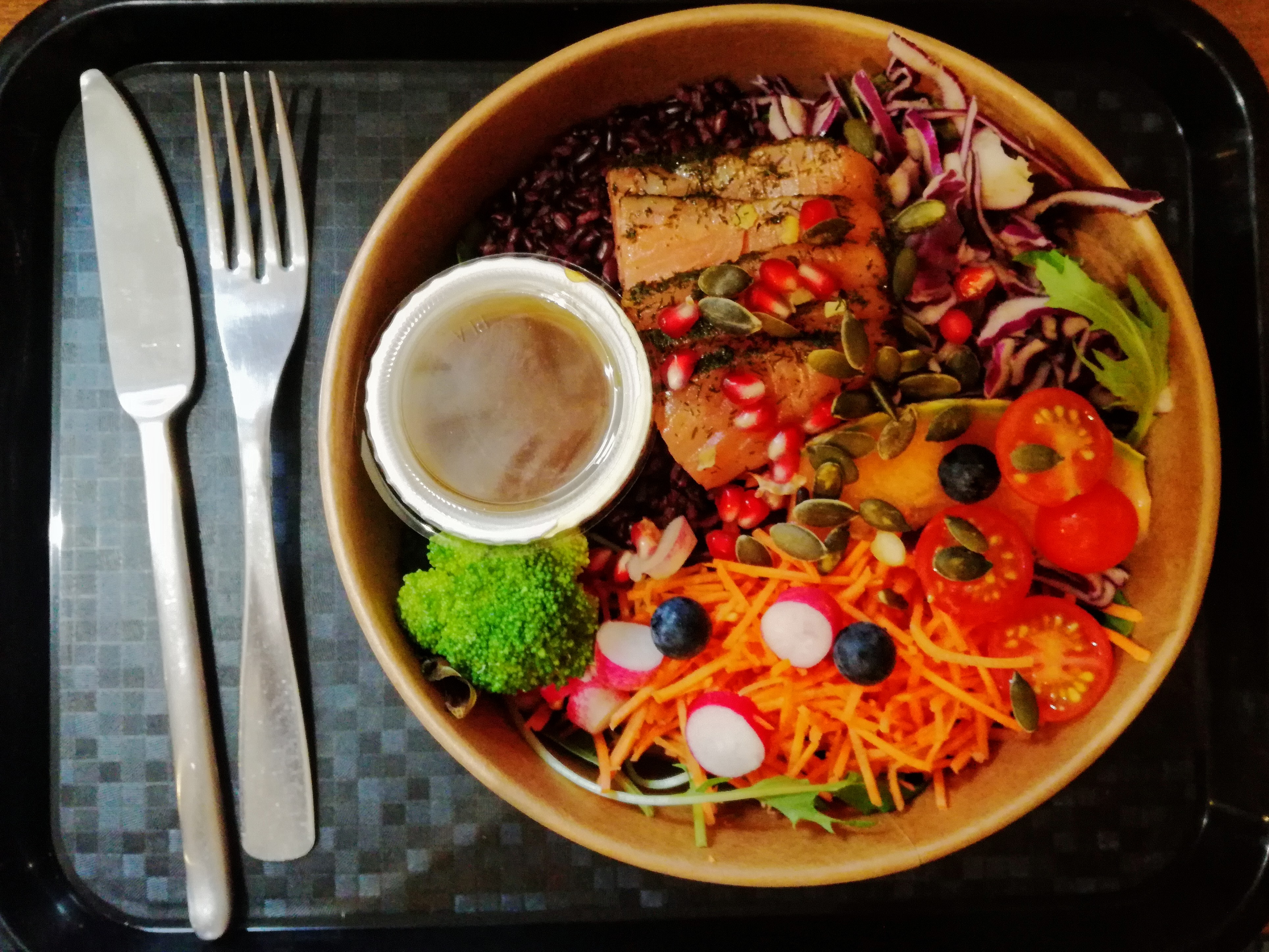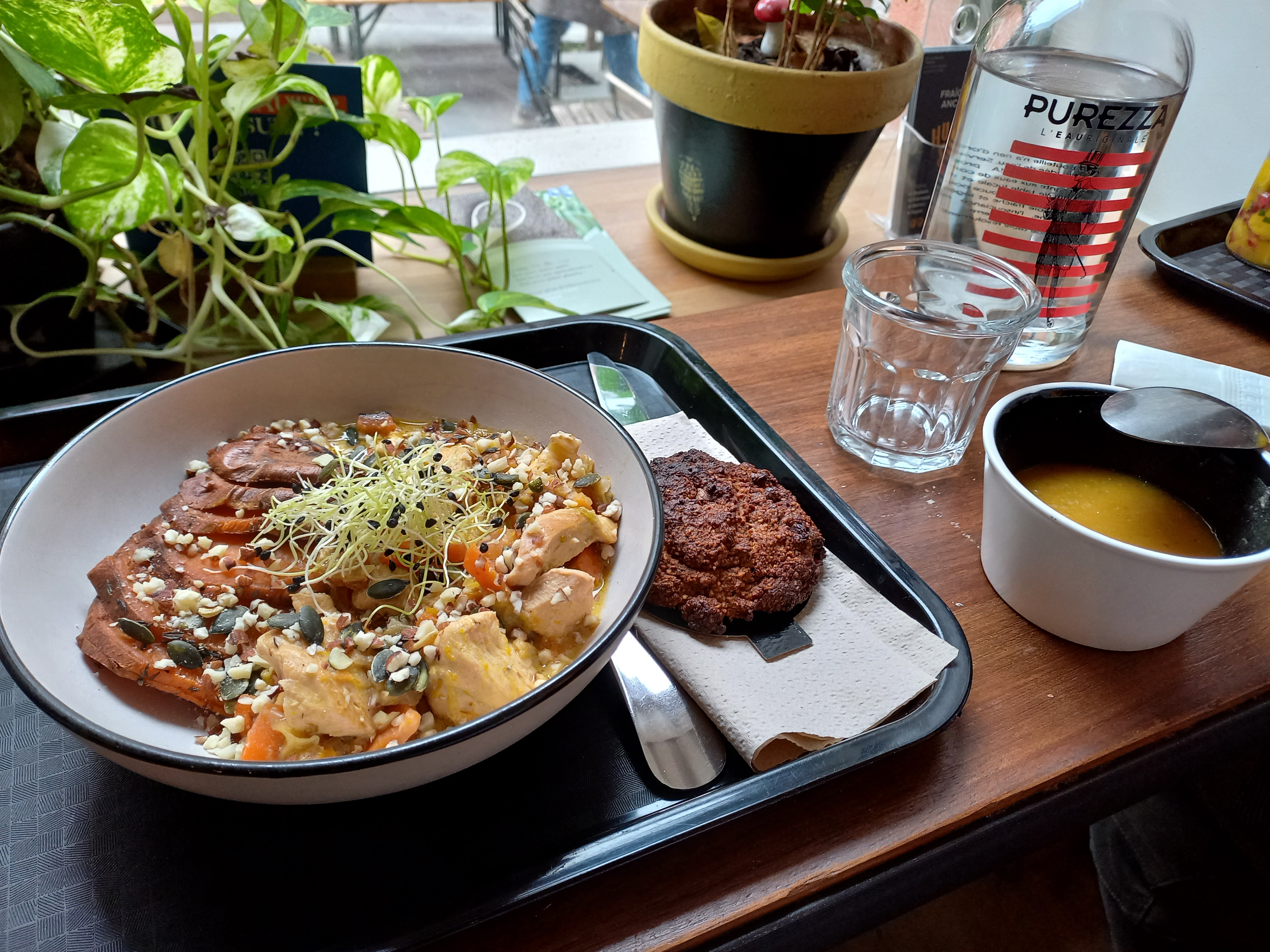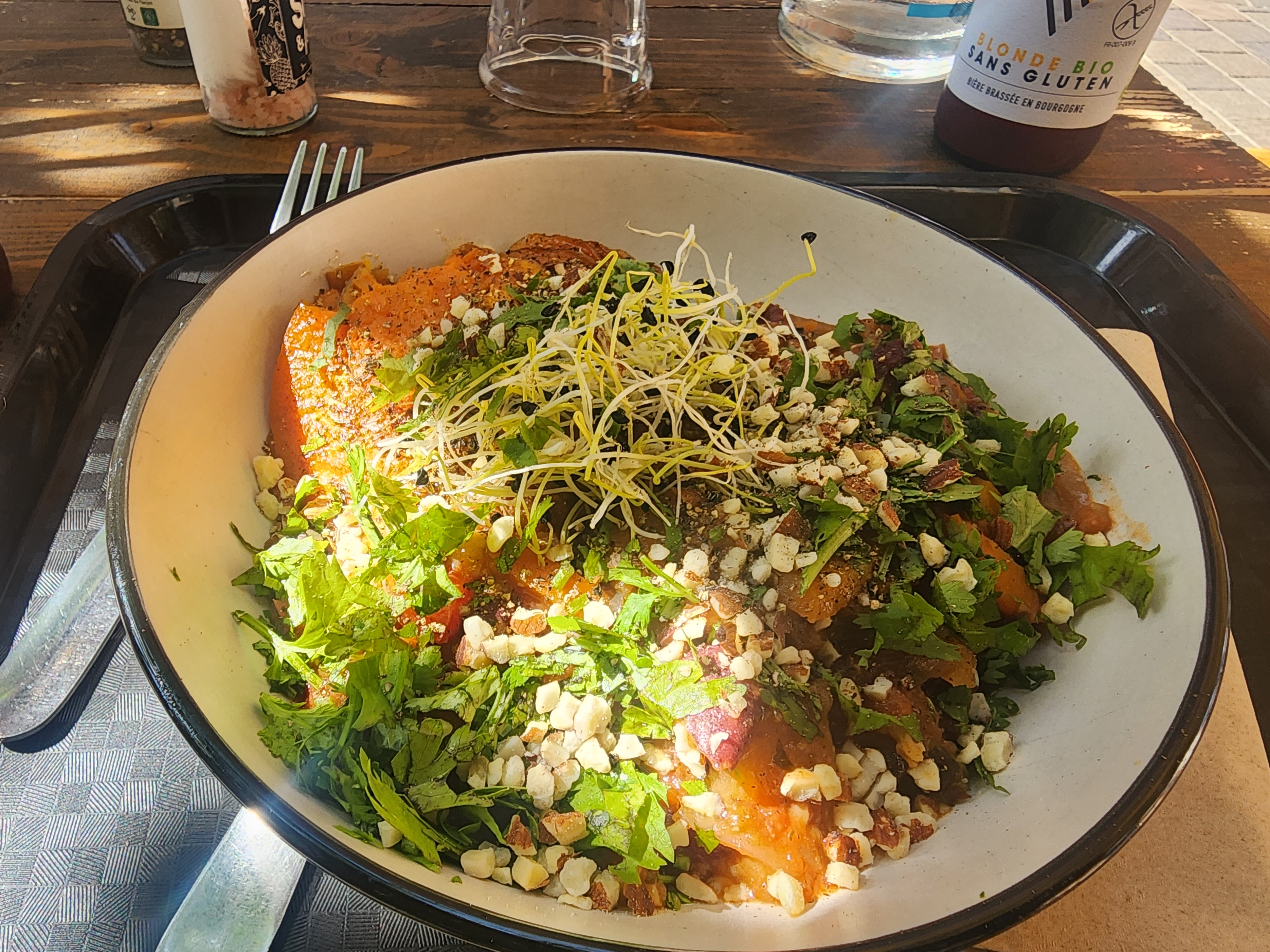Sans gluten, frais et équilibré. La quantité etait parfaite pour moi mais si vous avez tres faim, ce ne sera pas assez en effet. Le poisson etait fondant, les patates douces bien cuites Personnel tres sympa