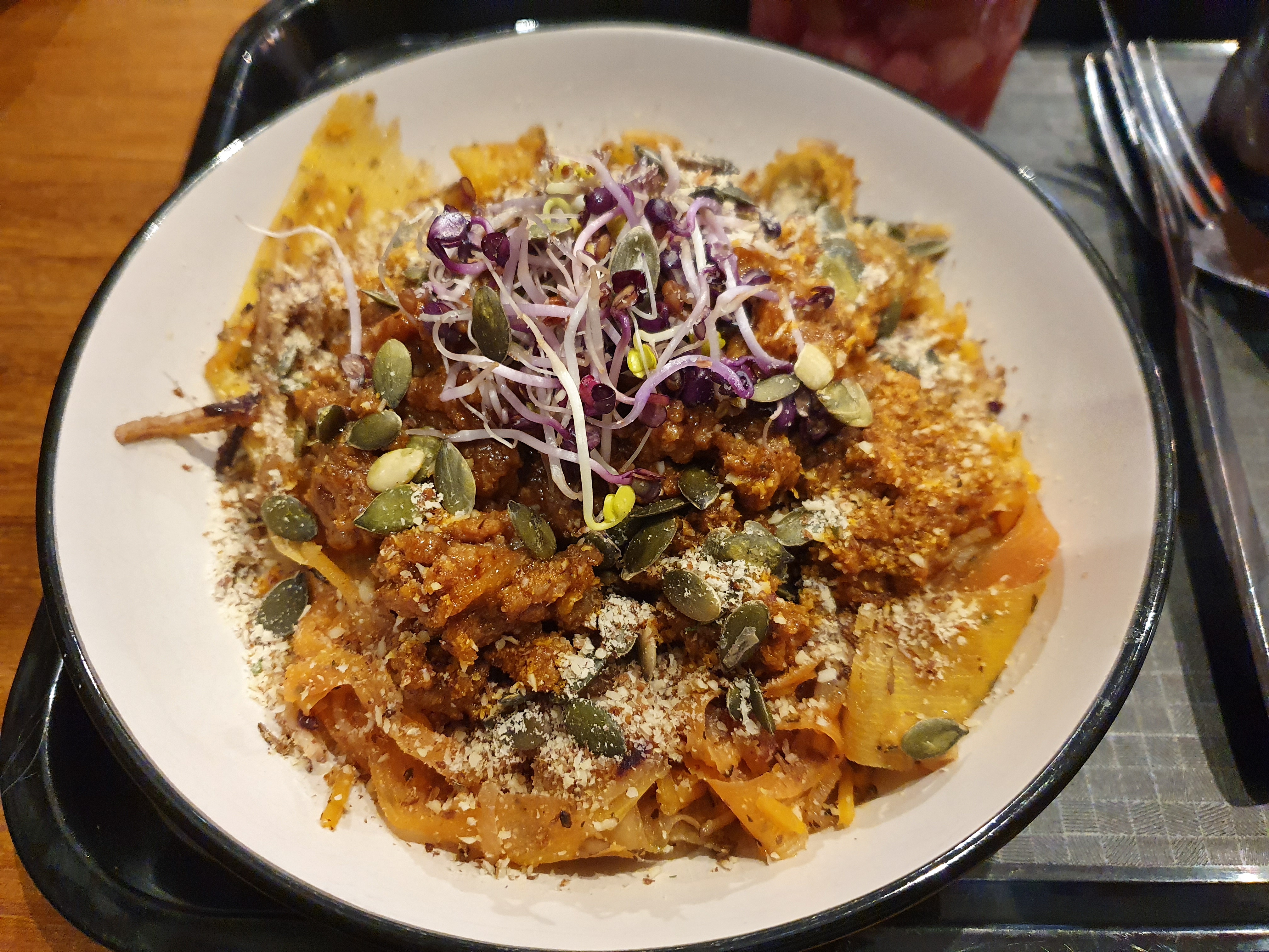 J'ai eu la bolognaise végétalienne, mais à mon avis, elle faisait plutôt penser à un sauté de légumes car il n'y avait pas vraiment quelque chose pour remplacer la viande hachée. C'était toujours bon, mais j'attendais avec impatience un bollo végétalien🥹
