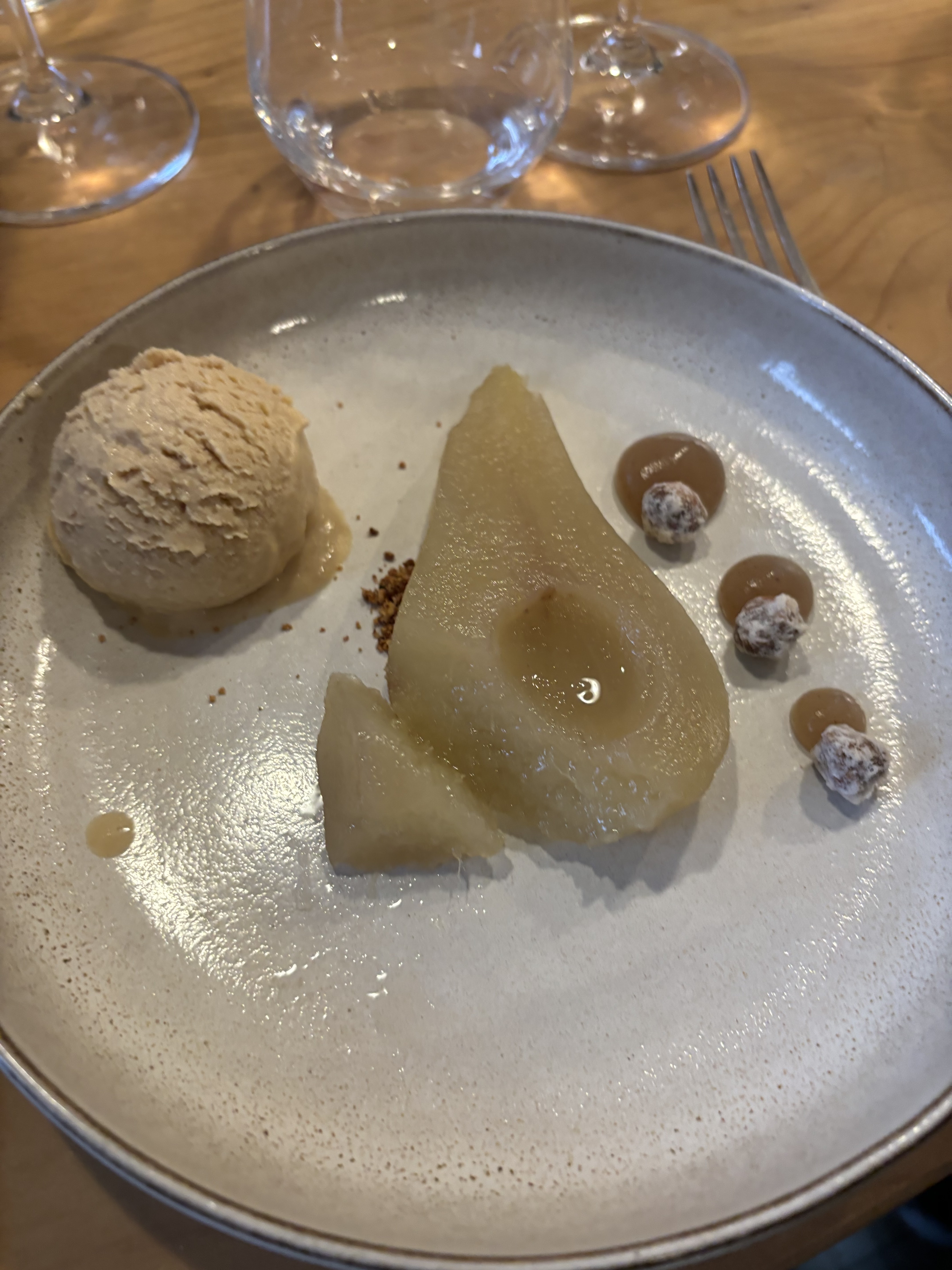 Moment convivial. Met délicieux. On était parti sur le menu avec plats définis et étions plutôt dubitatifs quant au dessert poire pochée, glace noisette qui s'est révélé une belle découverte au final.