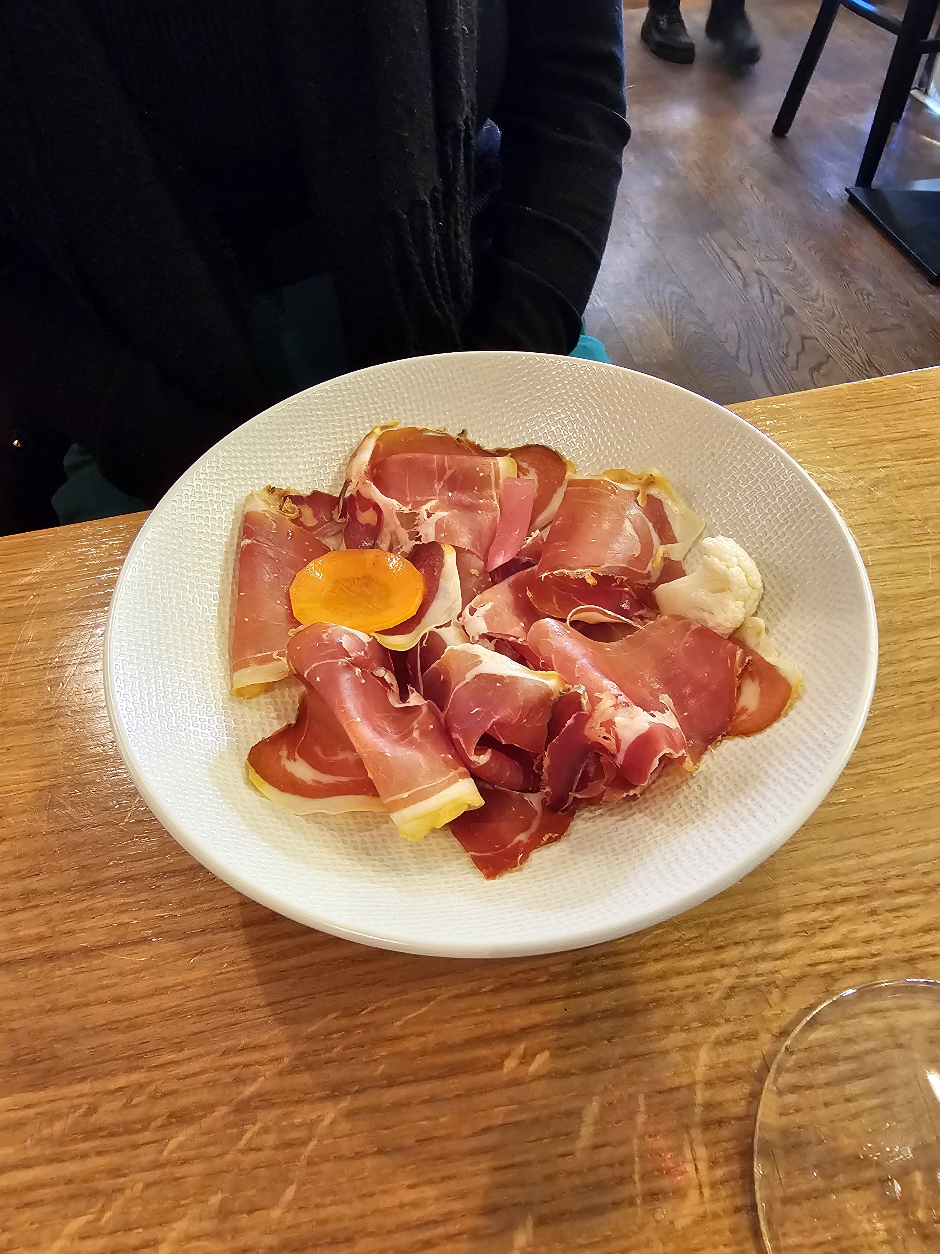 Voyons les points positifs; belle carte de vins natures; des bulles très agréables et un blanc très vif parfait pour équilibrer le plat. Le fameux plat c est l os à moelle sans l os mais vous devez sortir la loupe pour la trouver. Extrêmement déçu par cette entrée ou le vinaigre supposé venir équilibrer le plat vient le tuer et que dire de la quantite de moelle: ridicule! dissimulée sous les cocos par ailleurs bons. Pluma ibérique ensuite correct mais aussi cher à 30 euros le plat. Bref sentiment général très cher pour un dîner avec plus de 70 euros par personne sans désert ,à revoir lors d un dej. J aurais aussi apprécie que la chef passe à la table suite au mécontentement exprimé pour l entrée. Ce ne fut pas le cas ...