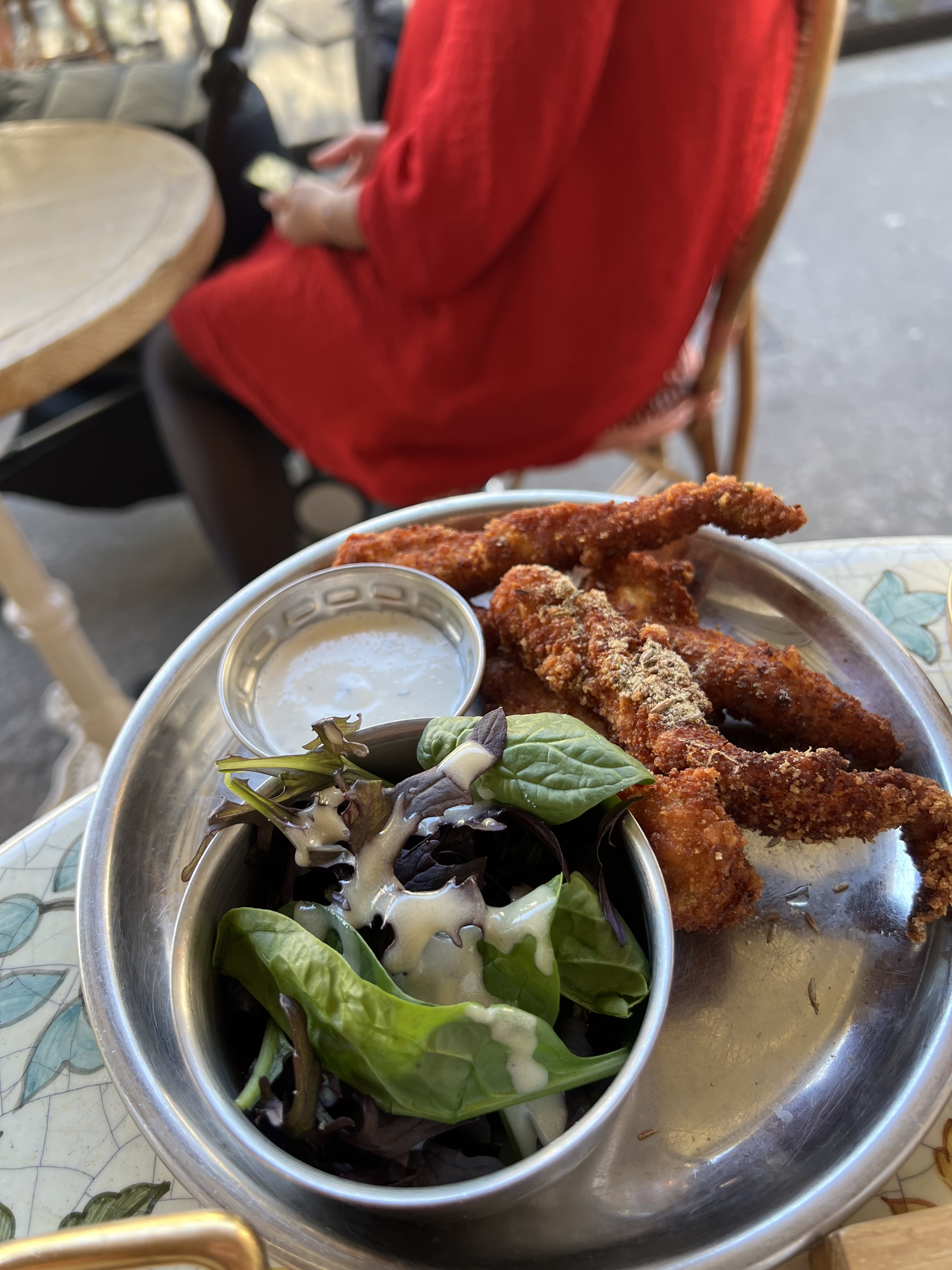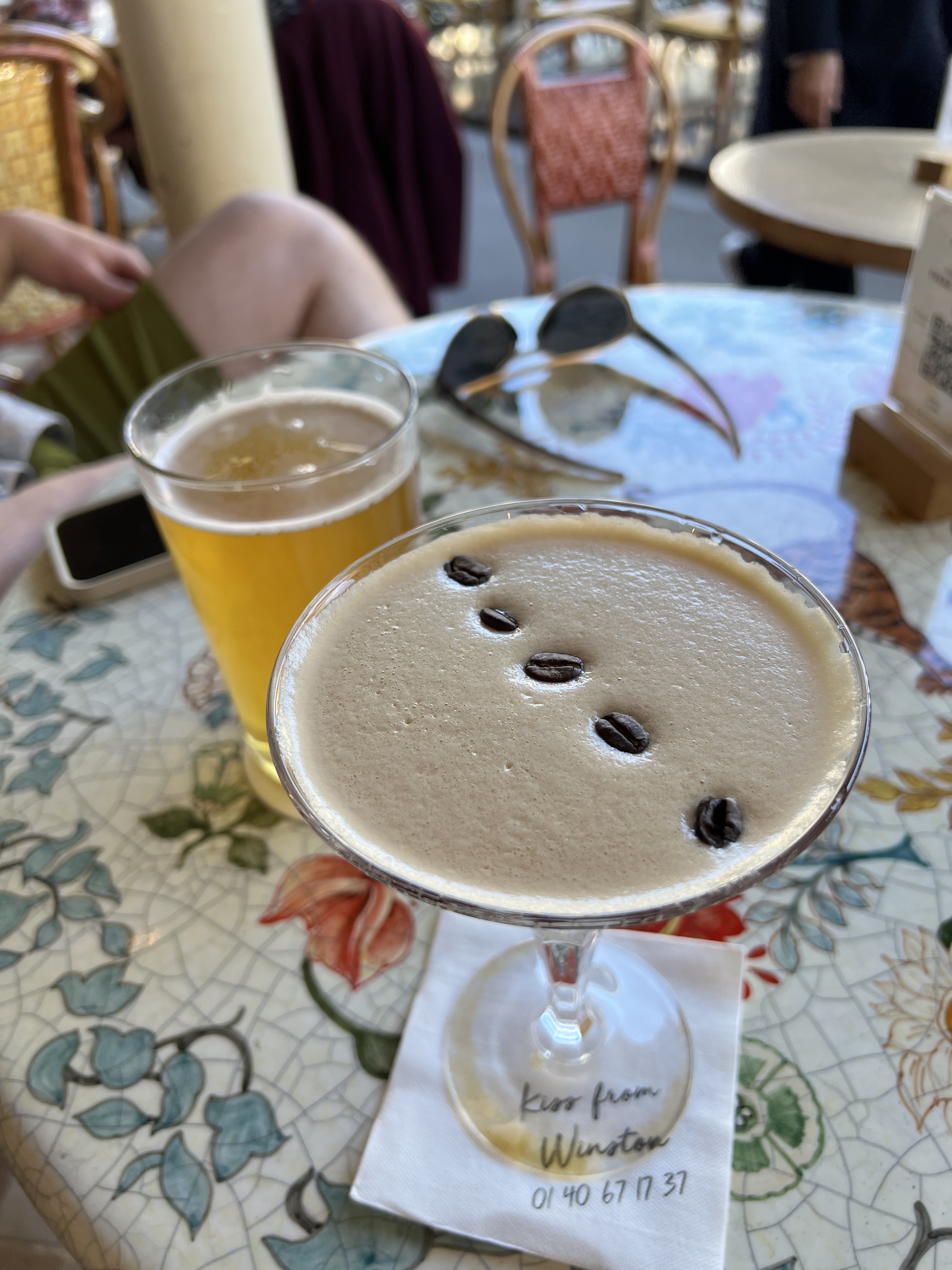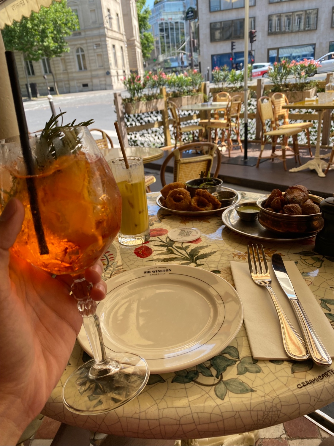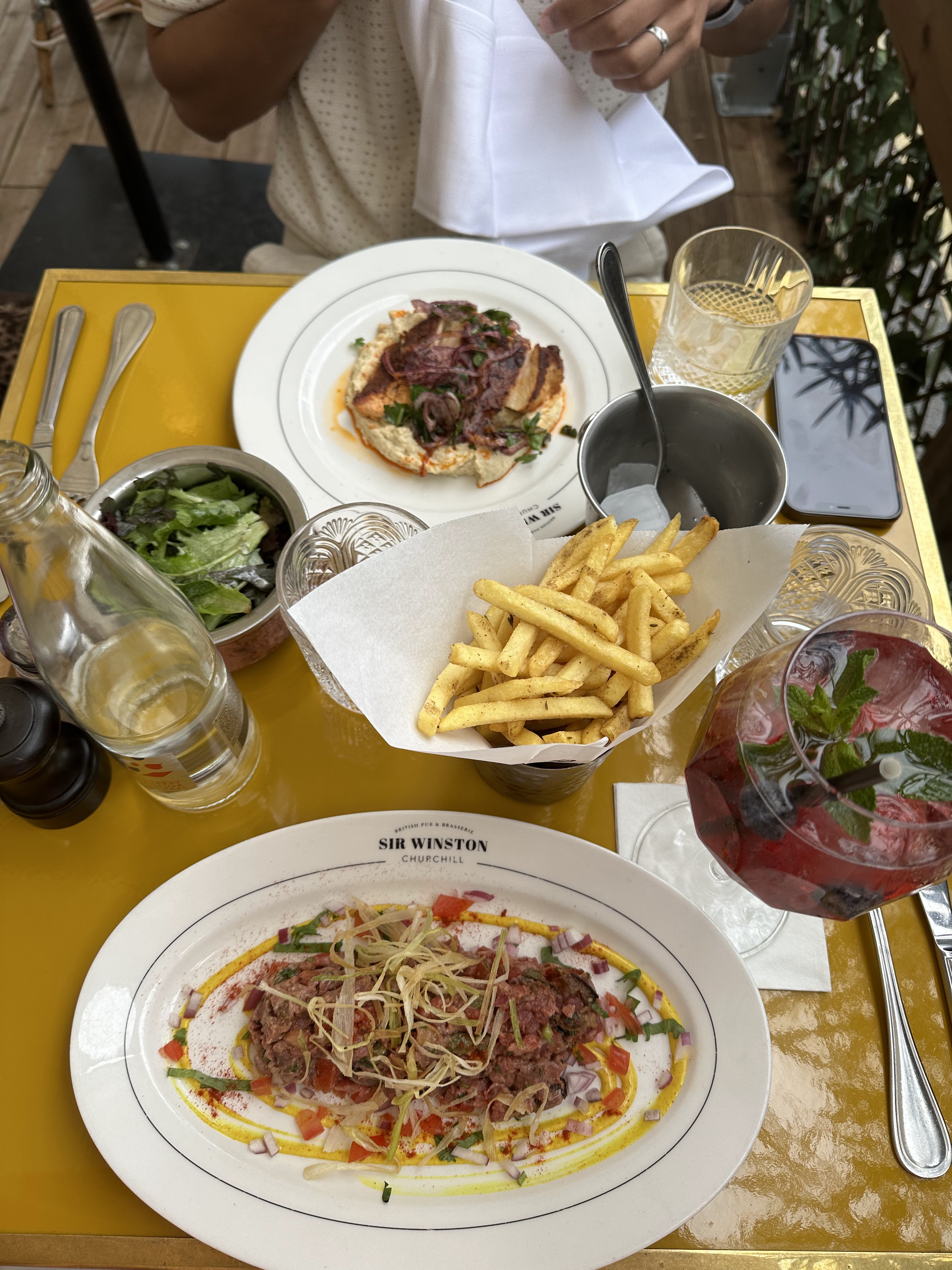 Sir Winston, un café près de l'Arc de Triomphe, offre une ambiance mignonne mais une cuisine médiocre. Le point culminant de mon repas a été le cocktail Spritz aux baies. Le tartare était une grande portion avec de gros morceaux inégaux et manquait de jaune d'œuf et des saveurs habituelles. Le shawarma au poulet était décevant car il s'agissait simplement de poitrine de poulet assaisonnée, pas d'un authentique shawarma.