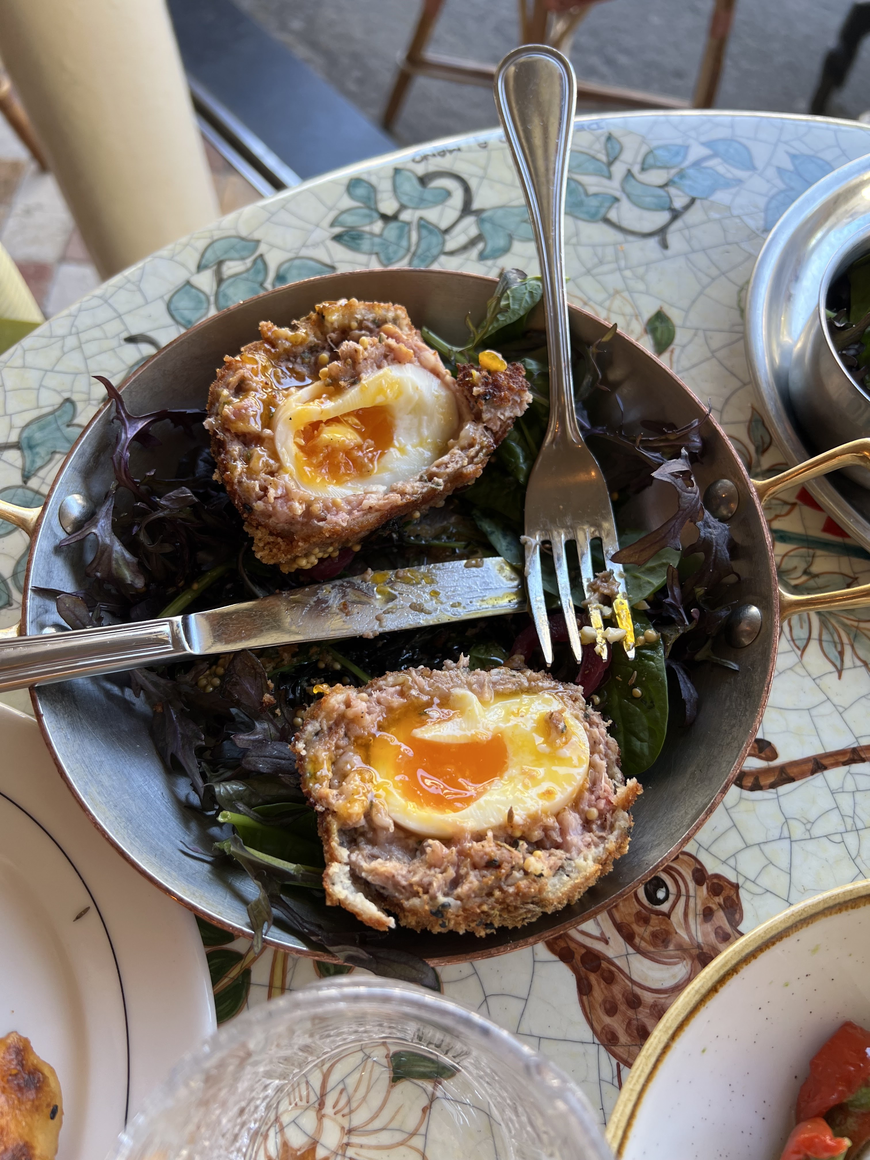 Superbe œuf écossais en entrée, poulet Schwarma en plat principal et pain Garic Naan. Je recommande vivement !