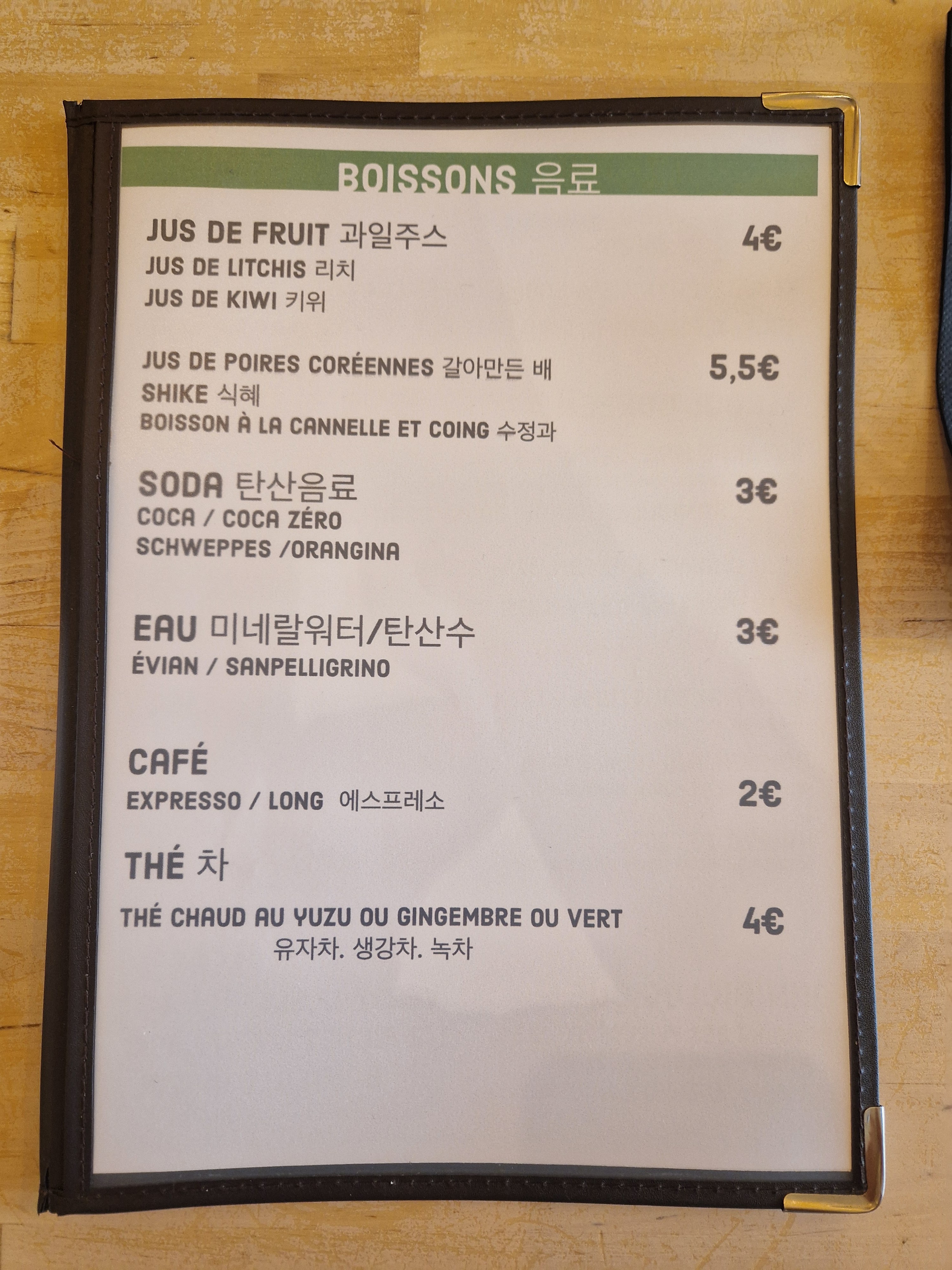 Il me semble que la carte du midi et du soir est différente car le chef change. (A vérifier) Nous sommes venus le soir et avons pris le classique bimbimbap et jinro chamisul ( alcool à 20 dégrée, qui n’a malheureusement peu de goût, faudrait boire avec de la bière) Personnellement je préfère le vin français… Service très chaleureux !