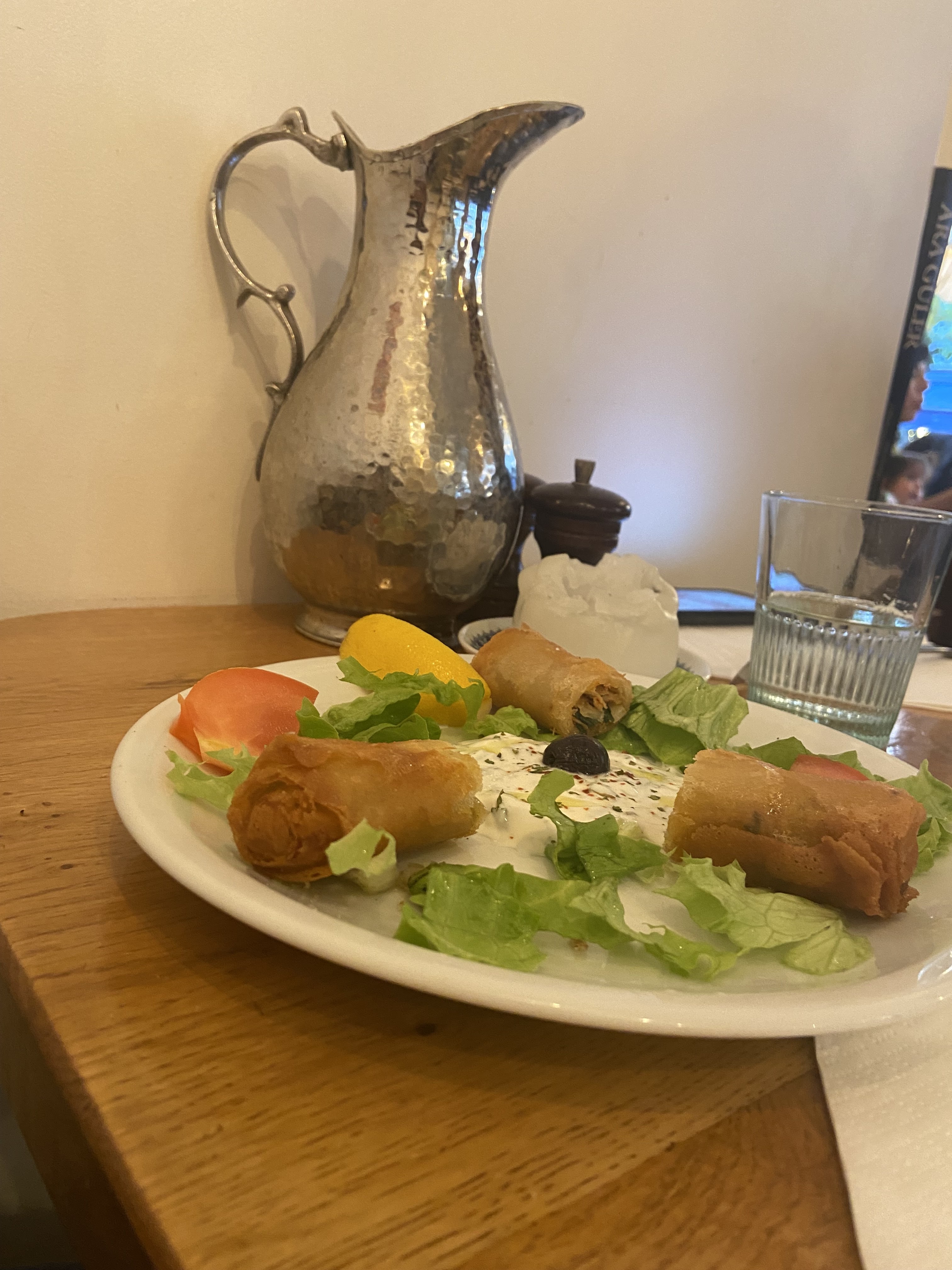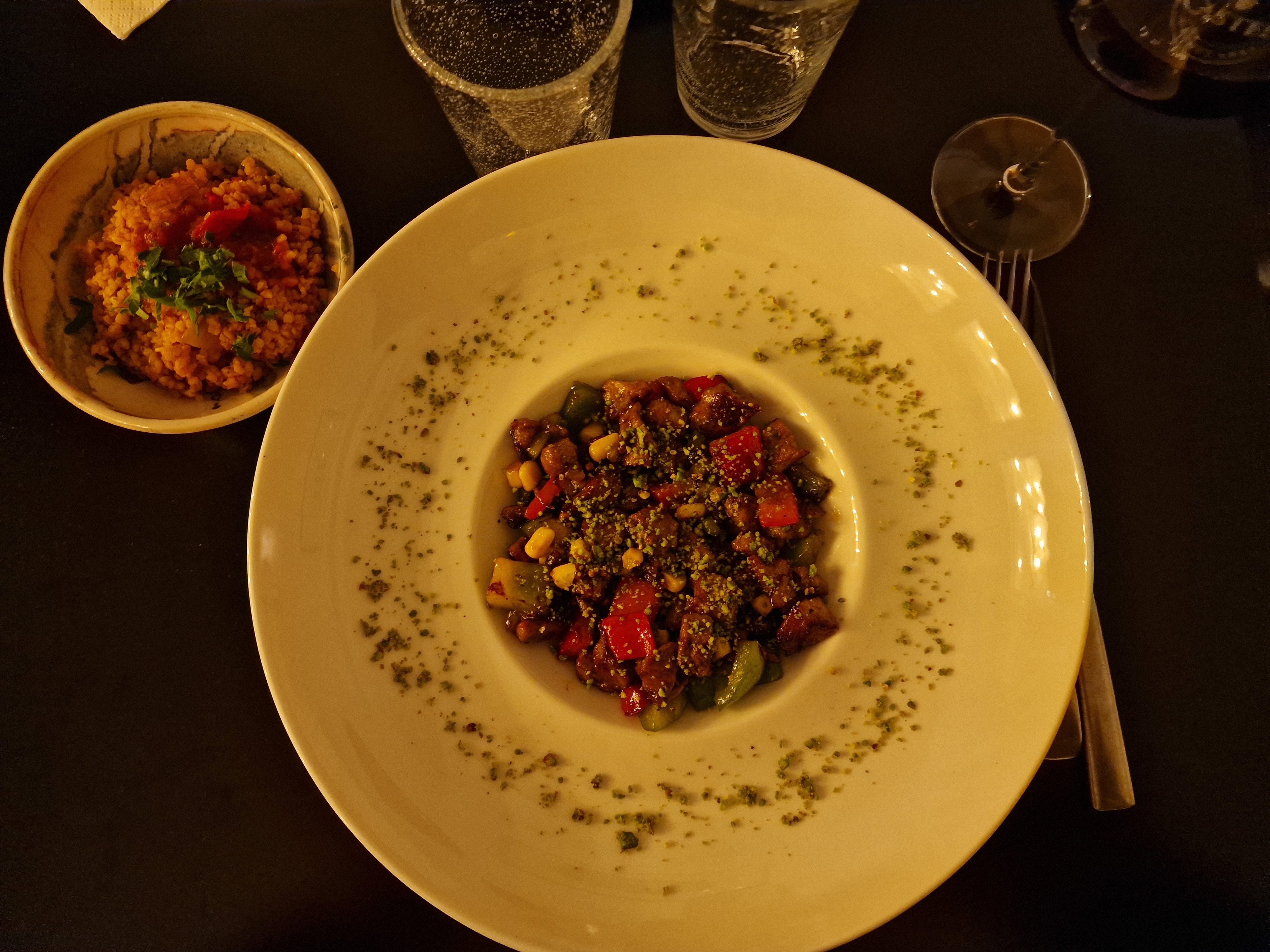 Bons mélange de légumes au yaourt en entrée. Bars grillés de bonne taille avec une cuisson presque parfaite à mon goût, avec boulghour et crudités. Le pain accompagne bien et n'est pas rationné. Yaourt maison au miel pour finir sobrement. Le thé à la menthe est classique mais parfait comme point final. Le service est professionnel, juste un peu longuet (3h un vendredi soir) si vous êtes pressés. Compter un peu plus de 35€ pour entrée/plat/dessert/thé, un bon rapport qualité-prix.