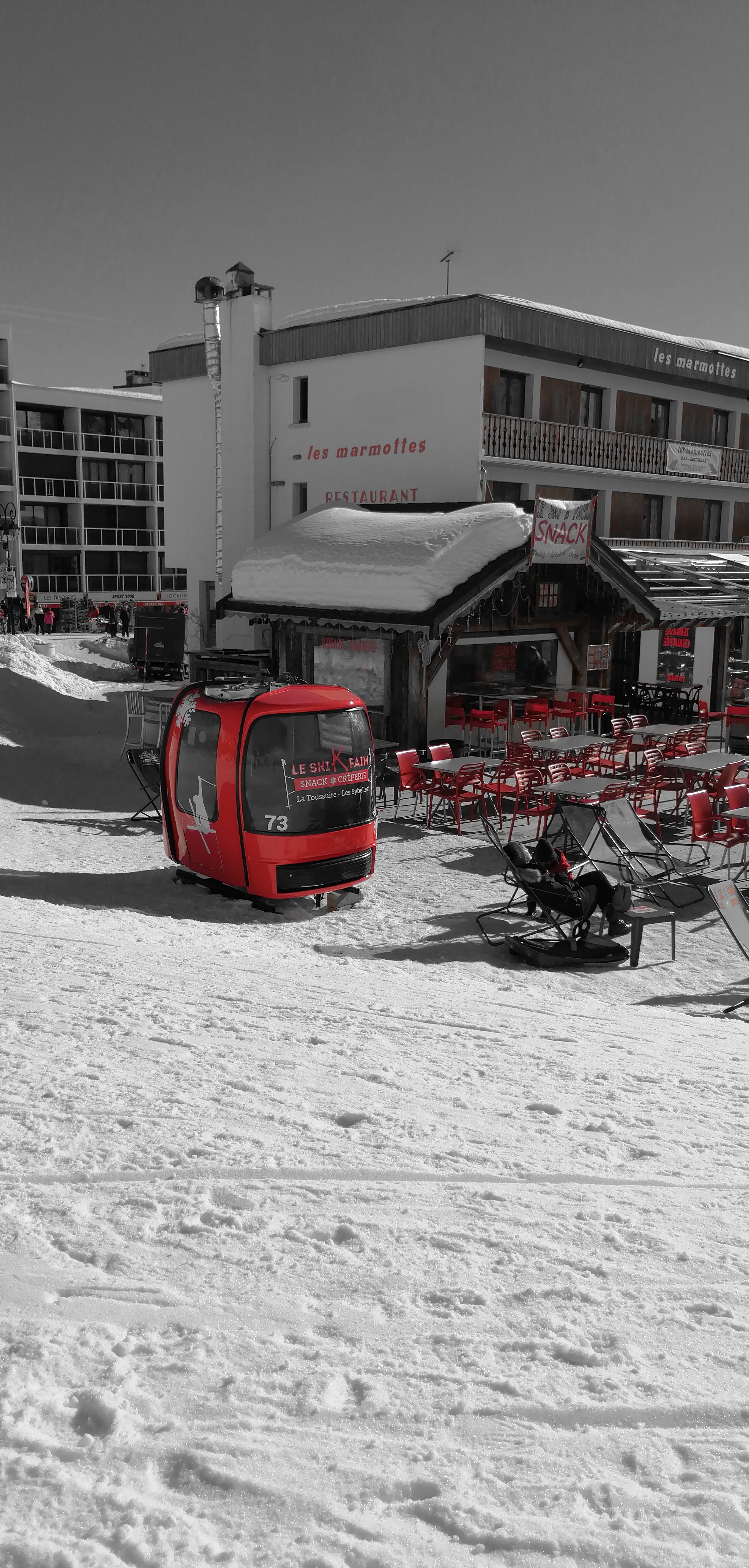 Chouette terrasse au soleil ☀ 😎 avec un snack pas trop cher et avec vue sur les pistes !!!
