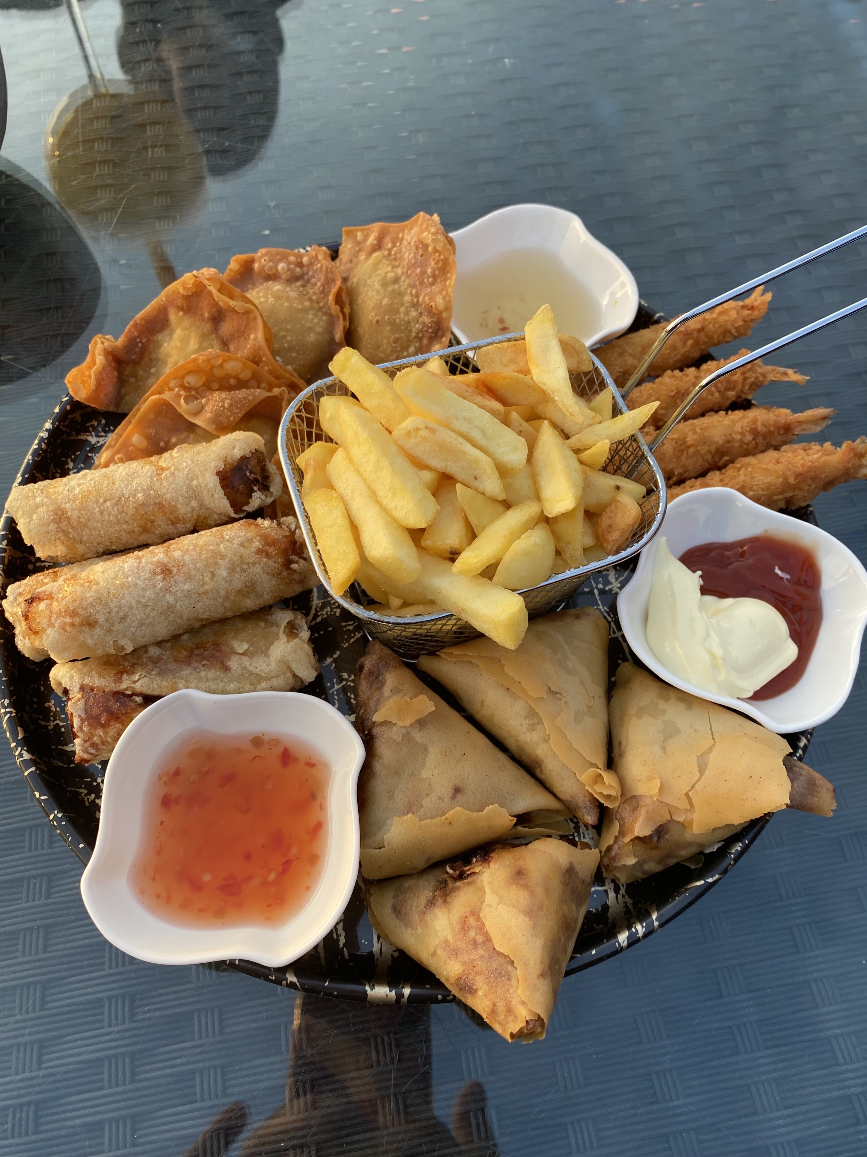 Trois quart d'heures d'attente pour iune planche de nems et samoussas surgelés....pas la faute du monde noetios 5 tables . Bof bof
