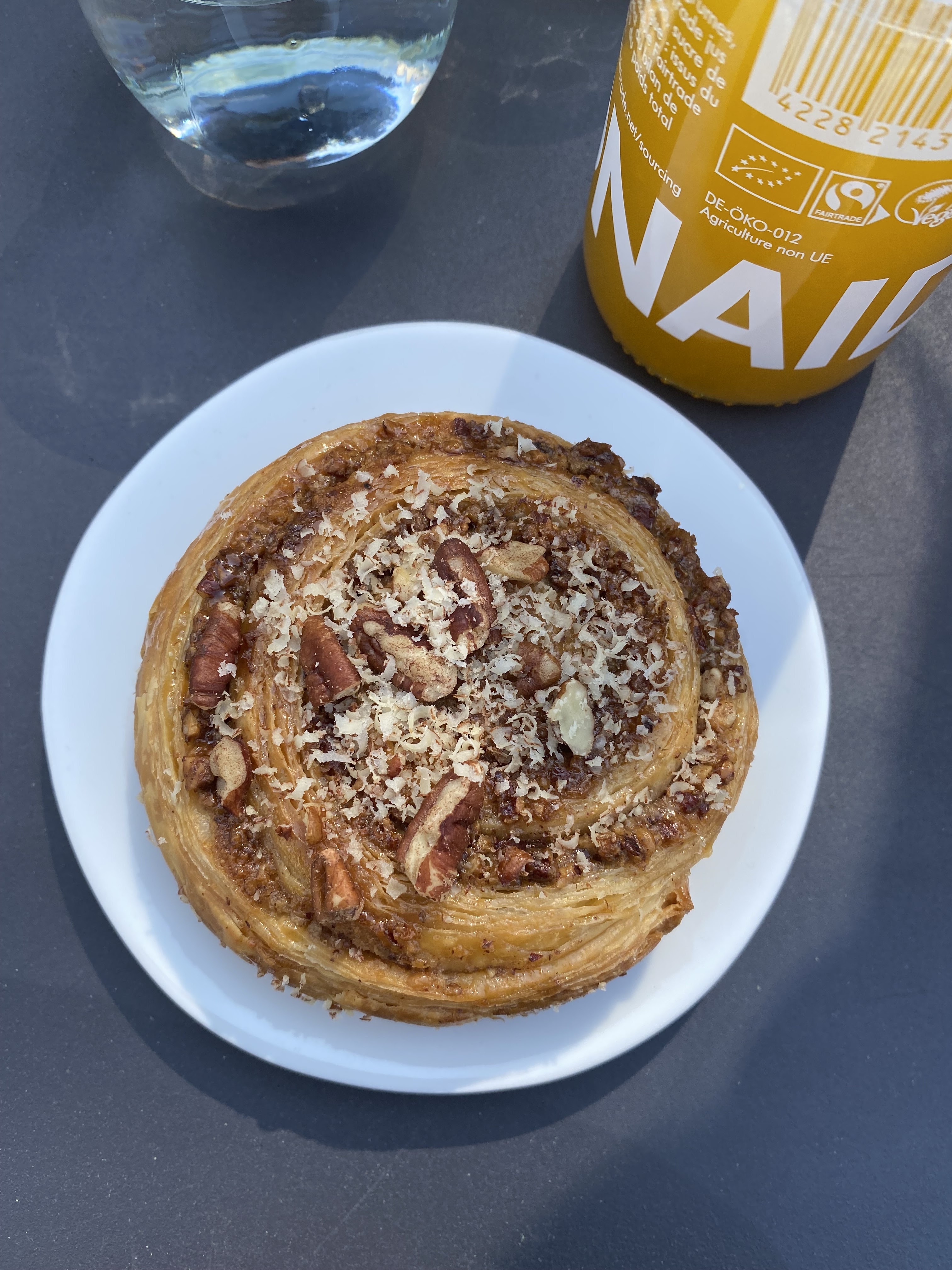 Joli café à Hossegor avec d'incroyables options de cuisine végétalienne. Je n'ai pas essayé leur déjeuner, mais ça a l'air délicieux. Il y avait un americano et un de leurs produits de boulangerie. Le café était vraiment bon et le petit pain au chocolat était un RÊVE. Si savoureux! 10/10 je le recommande et j'y retournerai certainement.