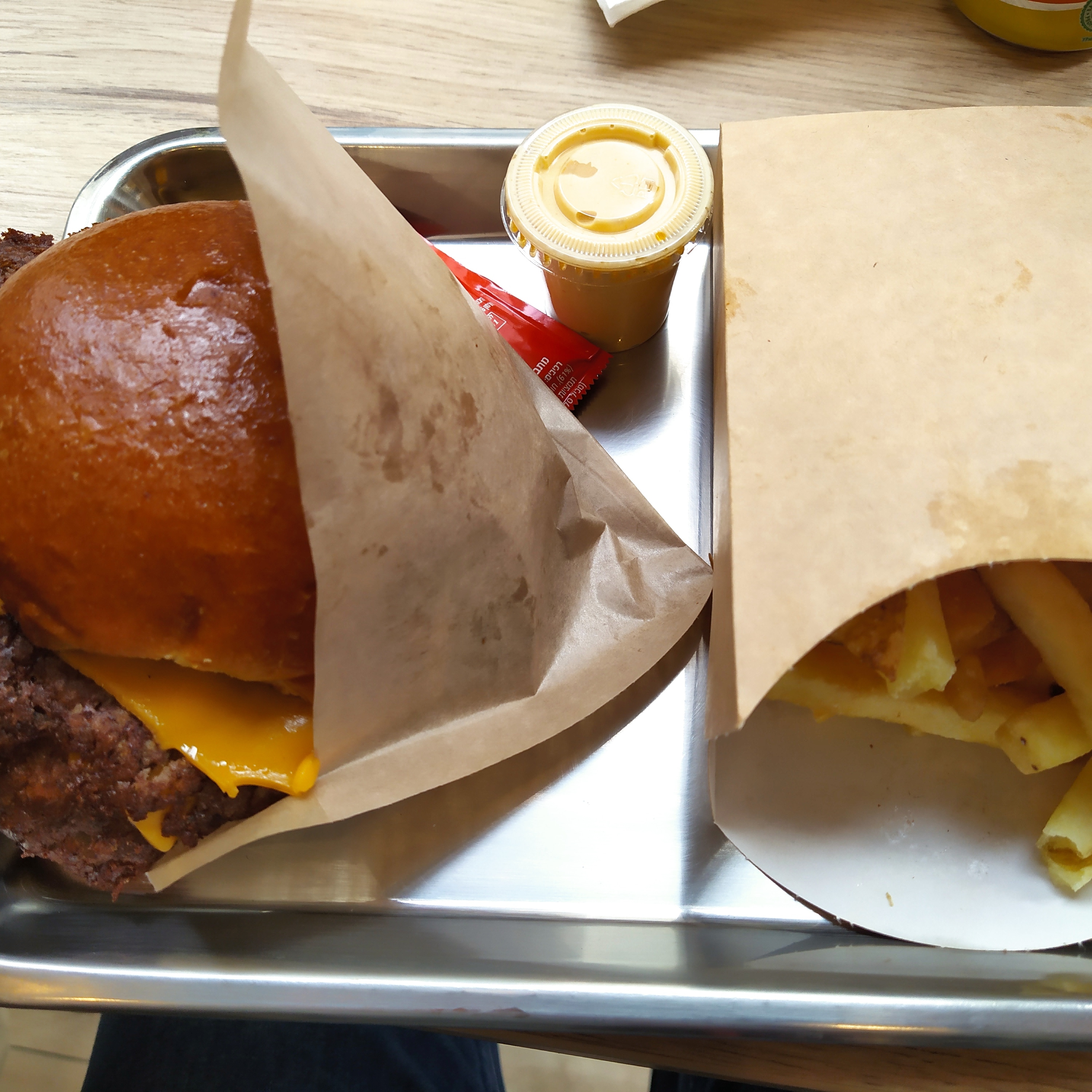Ce restaurant de hamburgers fait de bons hamburgers, des options casher étaient également disponibles. Le burger a mis du temps à nous être servi. Les frites étaient assez faibles et aqueuses et n'étaient pas suffisamment salées. Le hamburger au poulet était délicieux et le menu au poulet offrait un bon rapport qualité-prix pour ce que vous aviez. L'emballage était soigné, tous les aliments étaient emballés dans un emballage en papier écologique avec un revêtement gardant la chaleur.