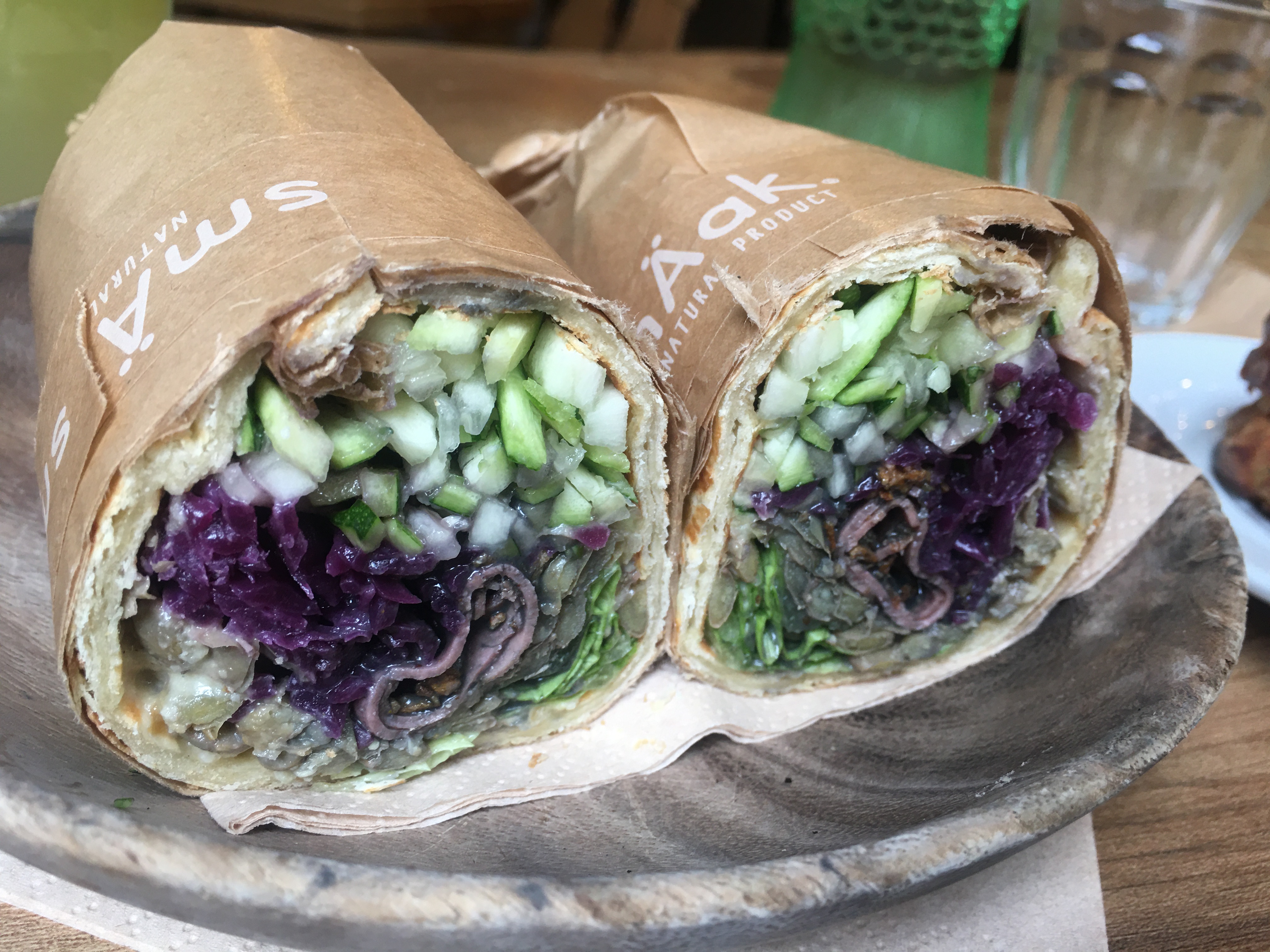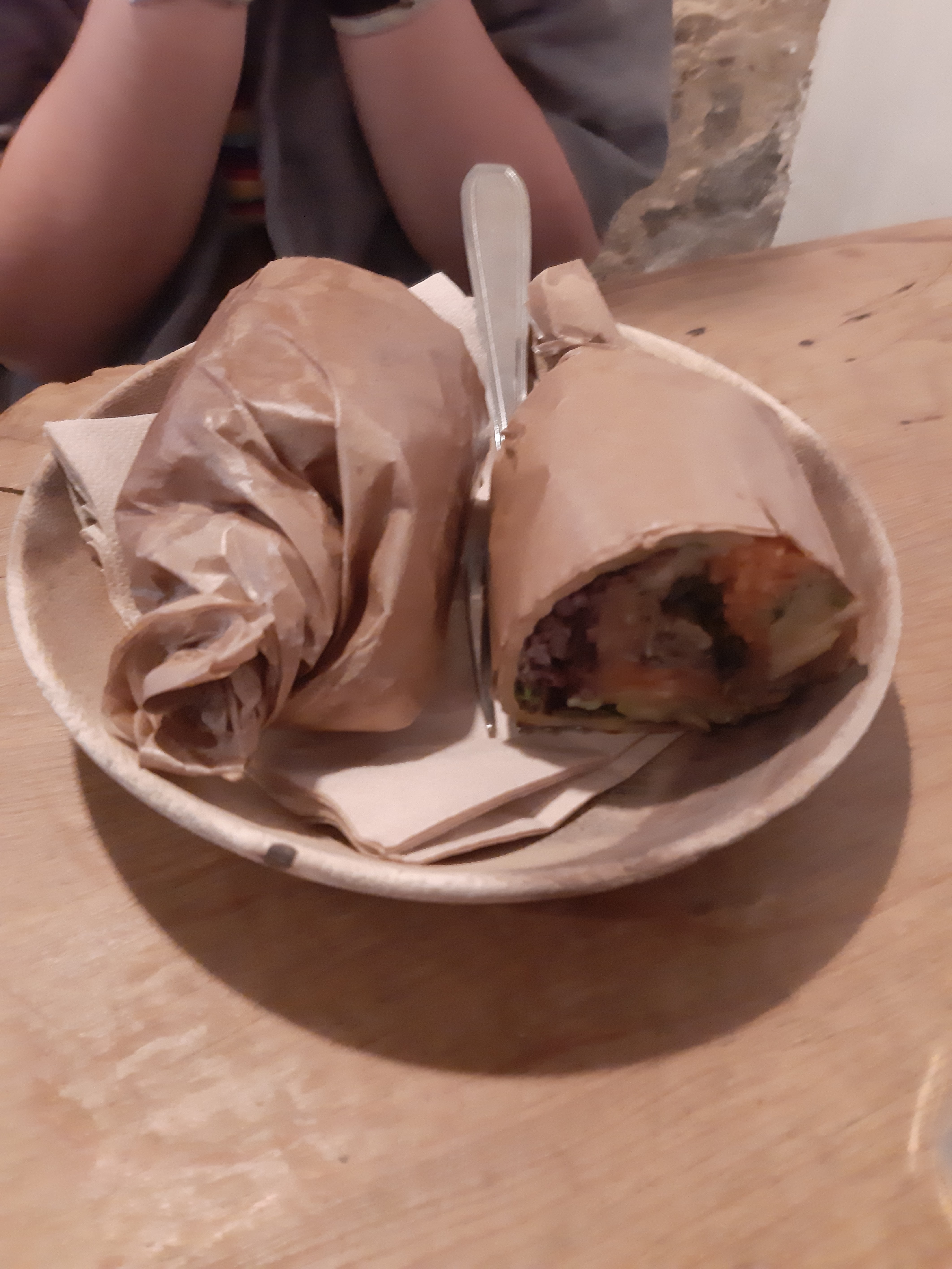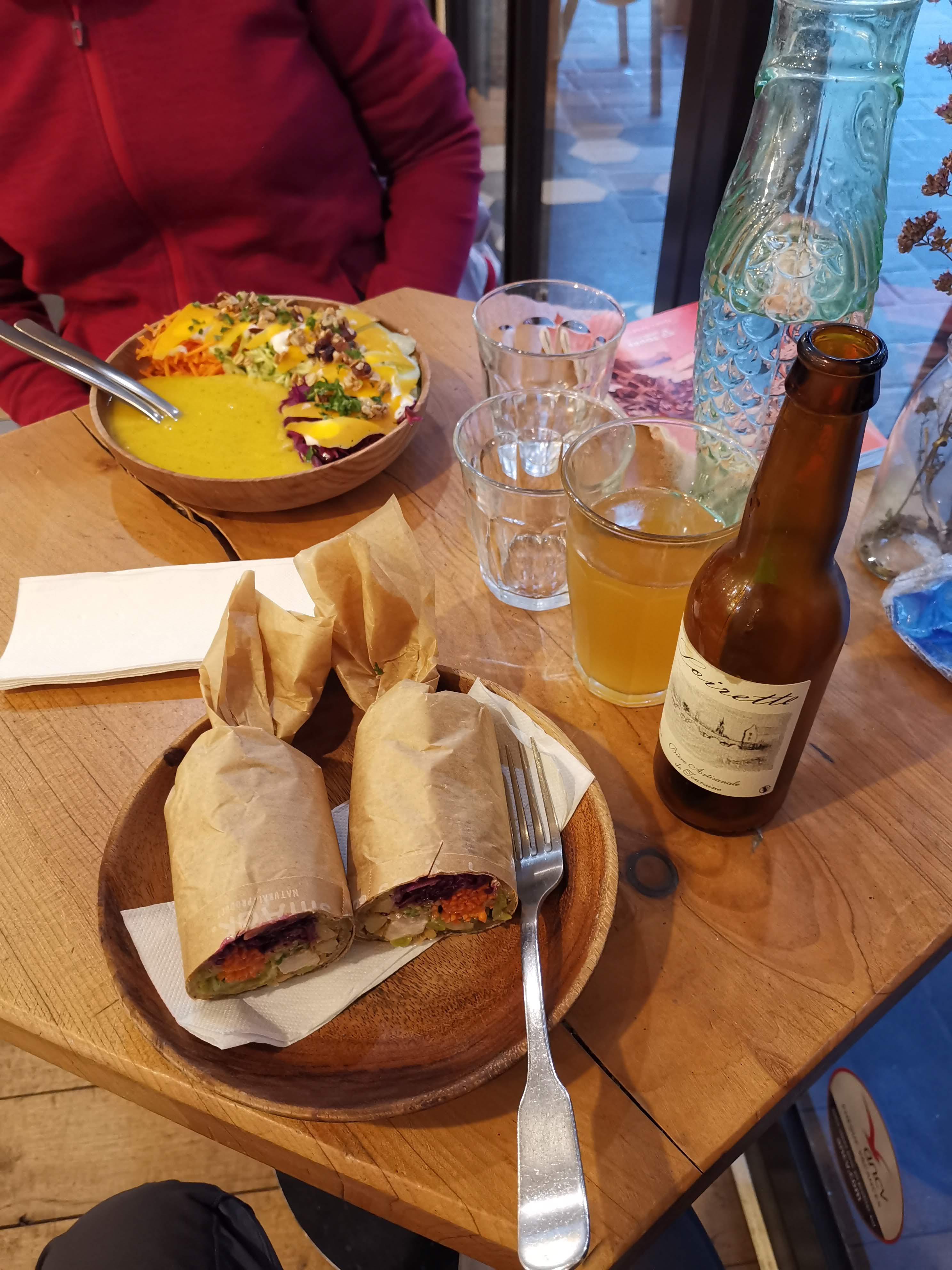Quelle bonne idée! 3 façons de déguster des recettes saines , en salade , soupe ou sandwich roulé! possibilité de composer soi même sa garniture. Pain en galette fait maison délicieux!! Protéine animale ou végétale, légumineuses, légume et fruit frais. Un joli pied de nez au fast food.