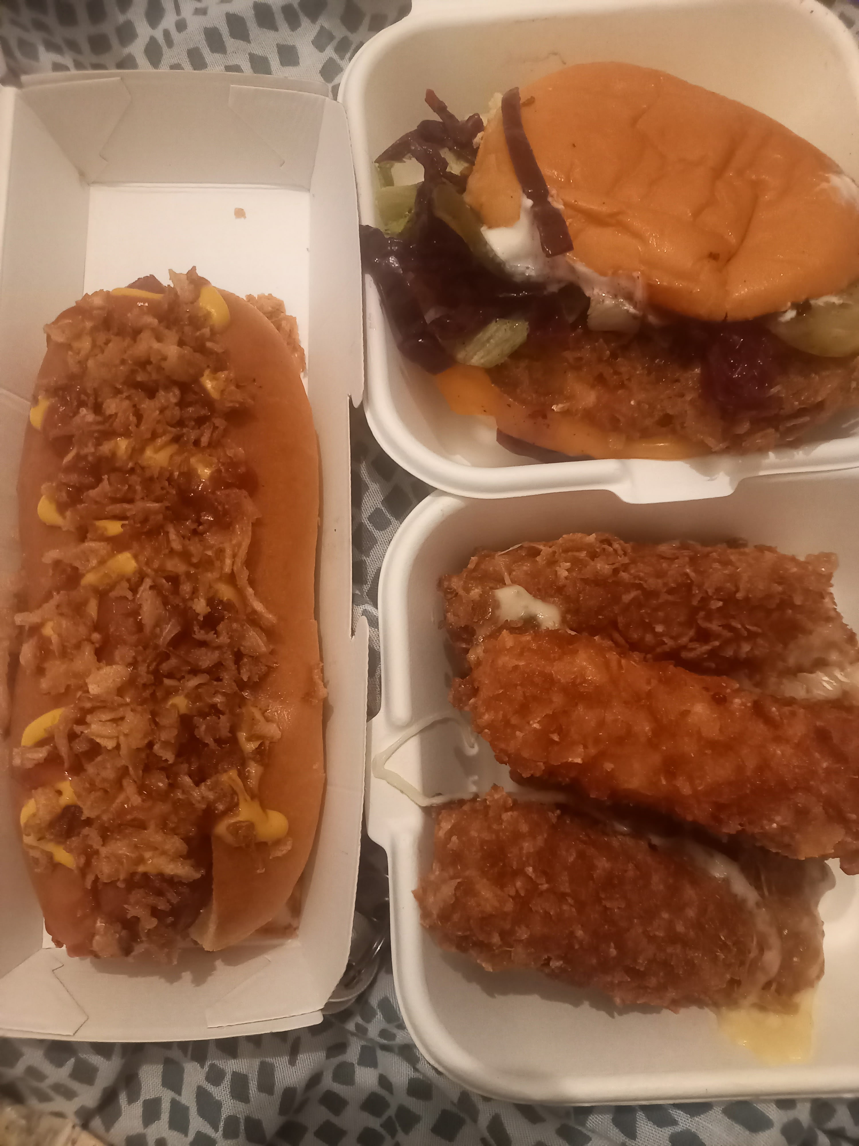De très bons hamburgers au poulet :) Je ne peux pas faire de commentaire sur les frites car elles étaient devenues froides au moment où je suis rentré à la maison, mais les sandwichs au poulet étaient encore chauds et juteux. Recommandé :)