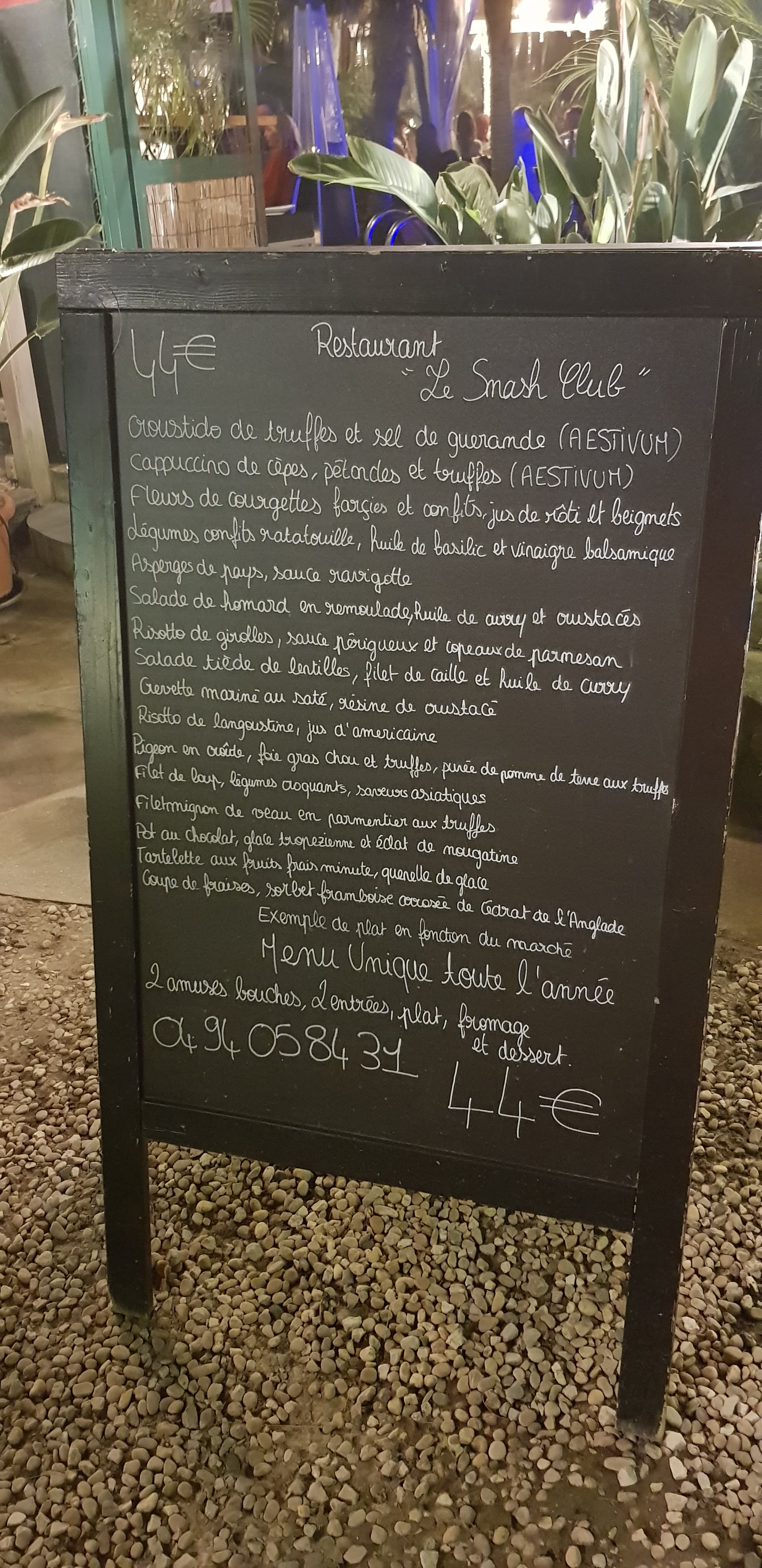 Superbe soirée passée hier au Smash Club. Cadre unique : légèrement éloigné du centre ville assurant de la tranquillité, restaurant au bord de la piscine. Cuisine de grande qualité, très fine et savoureuse. Personnel sympathique et patron proche de sa clientèle. Menu unique à 44euros : mise en bouche, 2 entrées, le plat, fromage et dessert.Je recommande fortement ce restaurant.