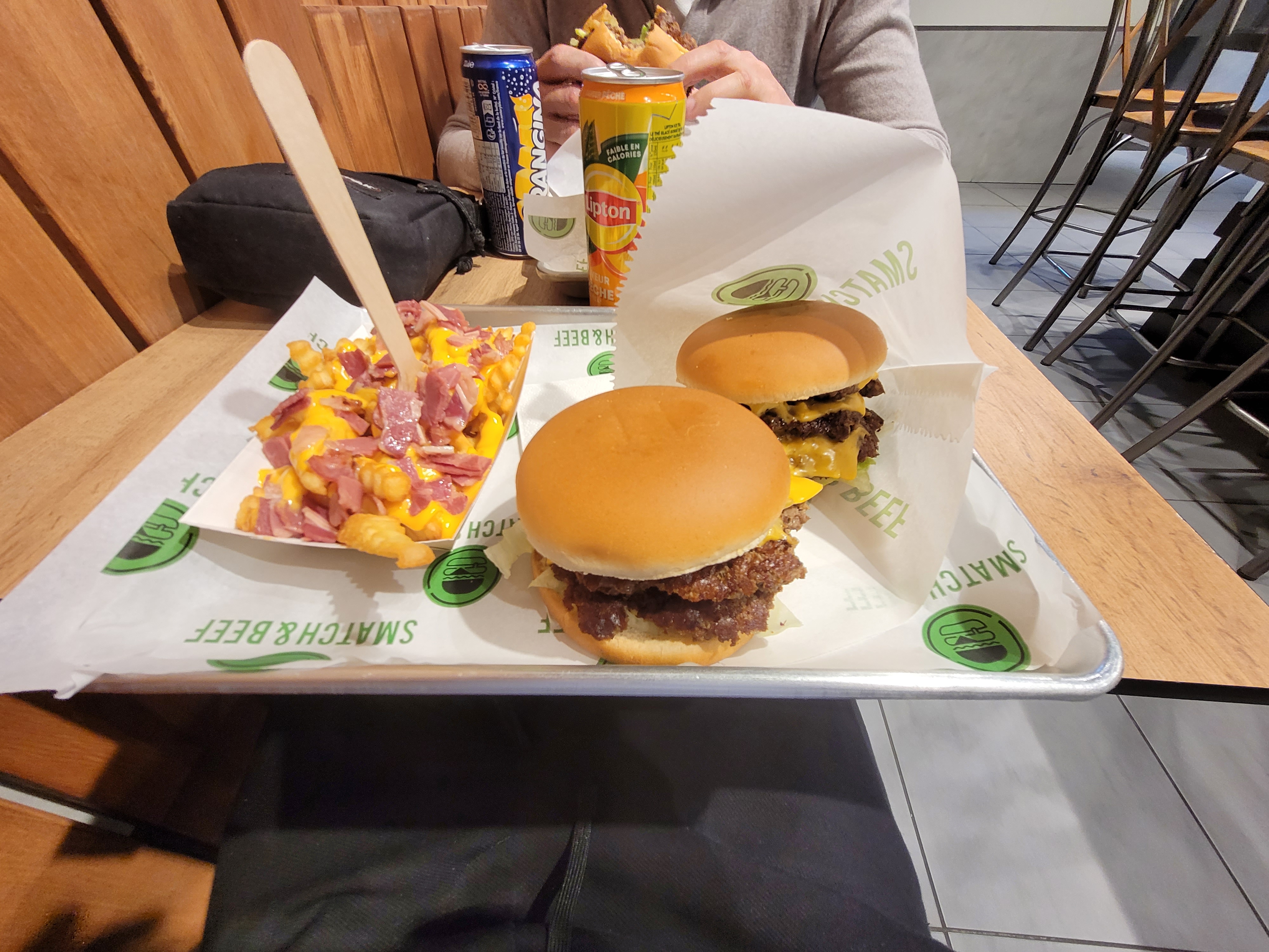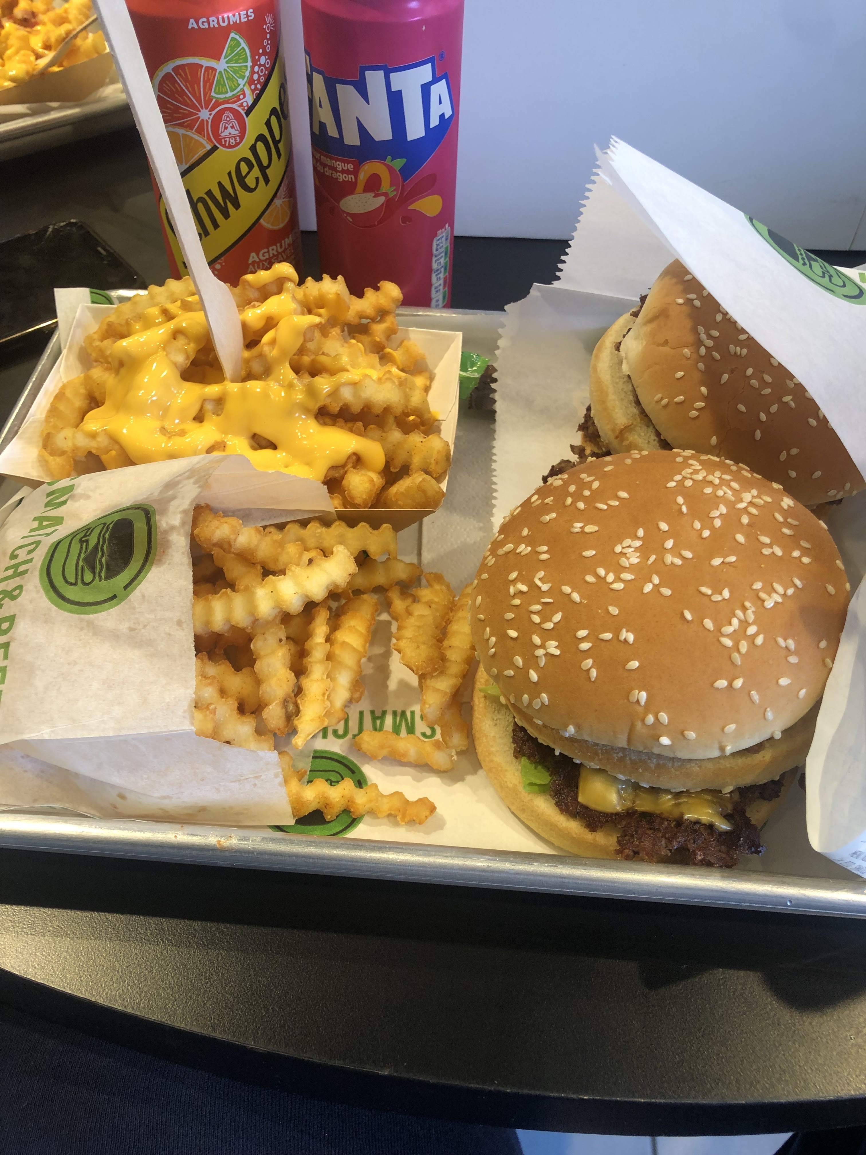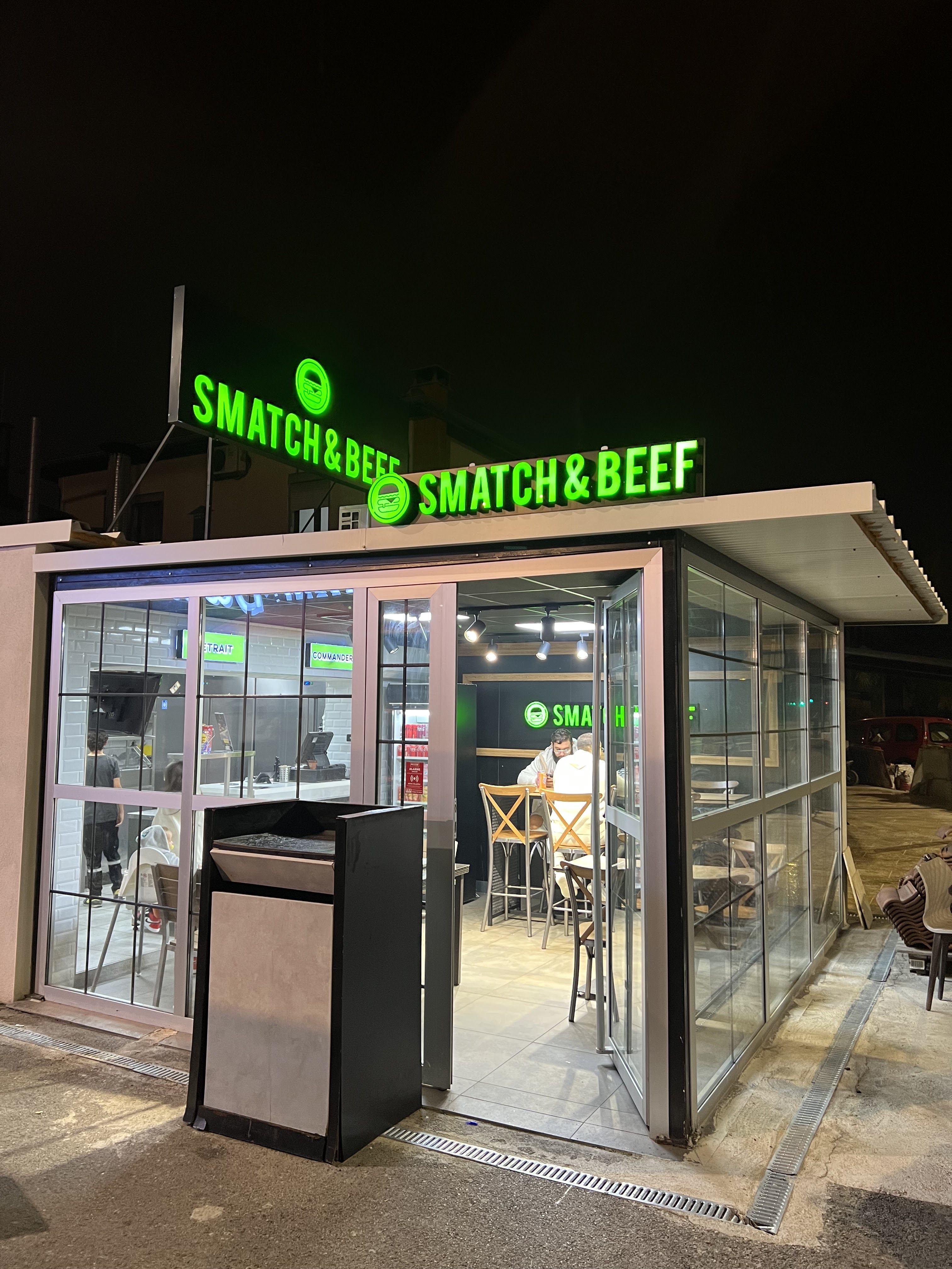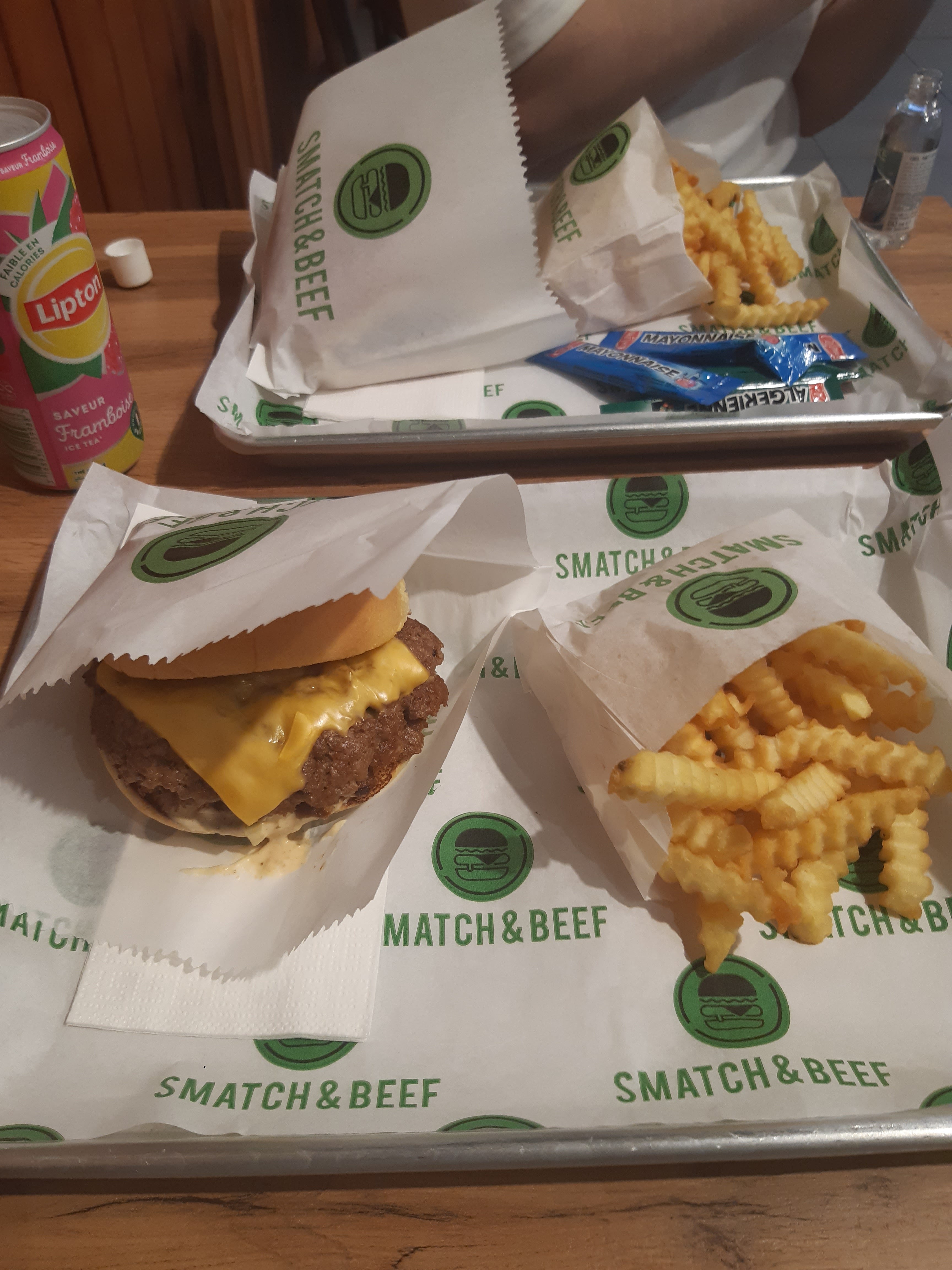 Nous avions envie de renouveler l'expérience du burger smatché. Cette fois nous nous sommes rendu sur place. Nous avons été accueillis par le responsable et son équipe avec un sourire malgré le Rush des commandes et des livreurs venus récupérer leurs commandes. Nous avons choisi nos commandes sur une grande carte claire et facilement compréhensible. Nous avons opté pour l'offre Signature (5€ supplémentaires pour le deuxième burger). Un double cheeseburger et un double smatch burger). Les burgers étaient excellents et le fait que les viandes soient plates, la viande ne s'échappe pas du burger. Sincèrement le meilleur burger que j'ai mangé. Les frites sont délicieusement salés hummm. Pour finir le tiramisu au chocolat est très bon et pas trop sucré.🤔👍