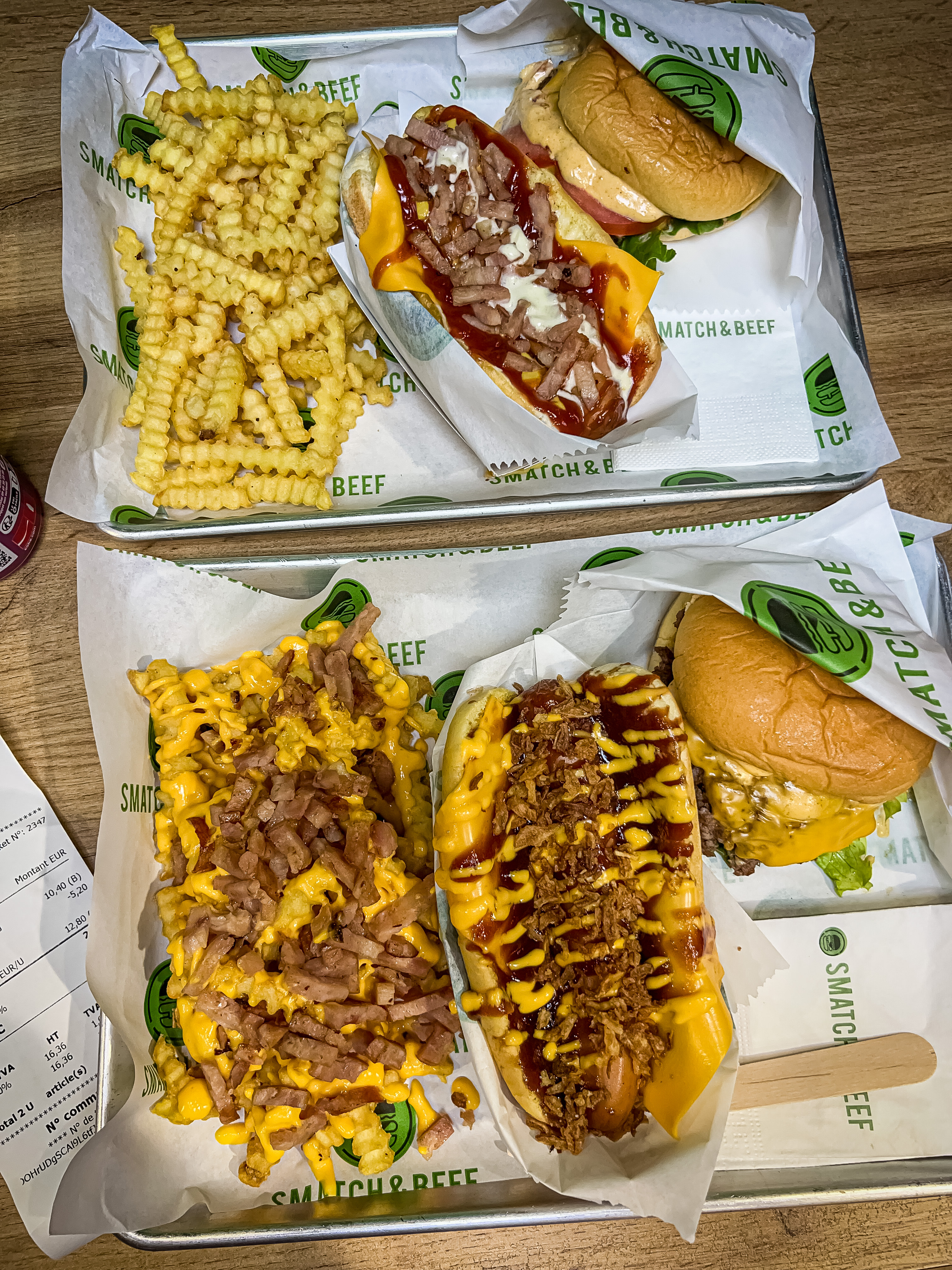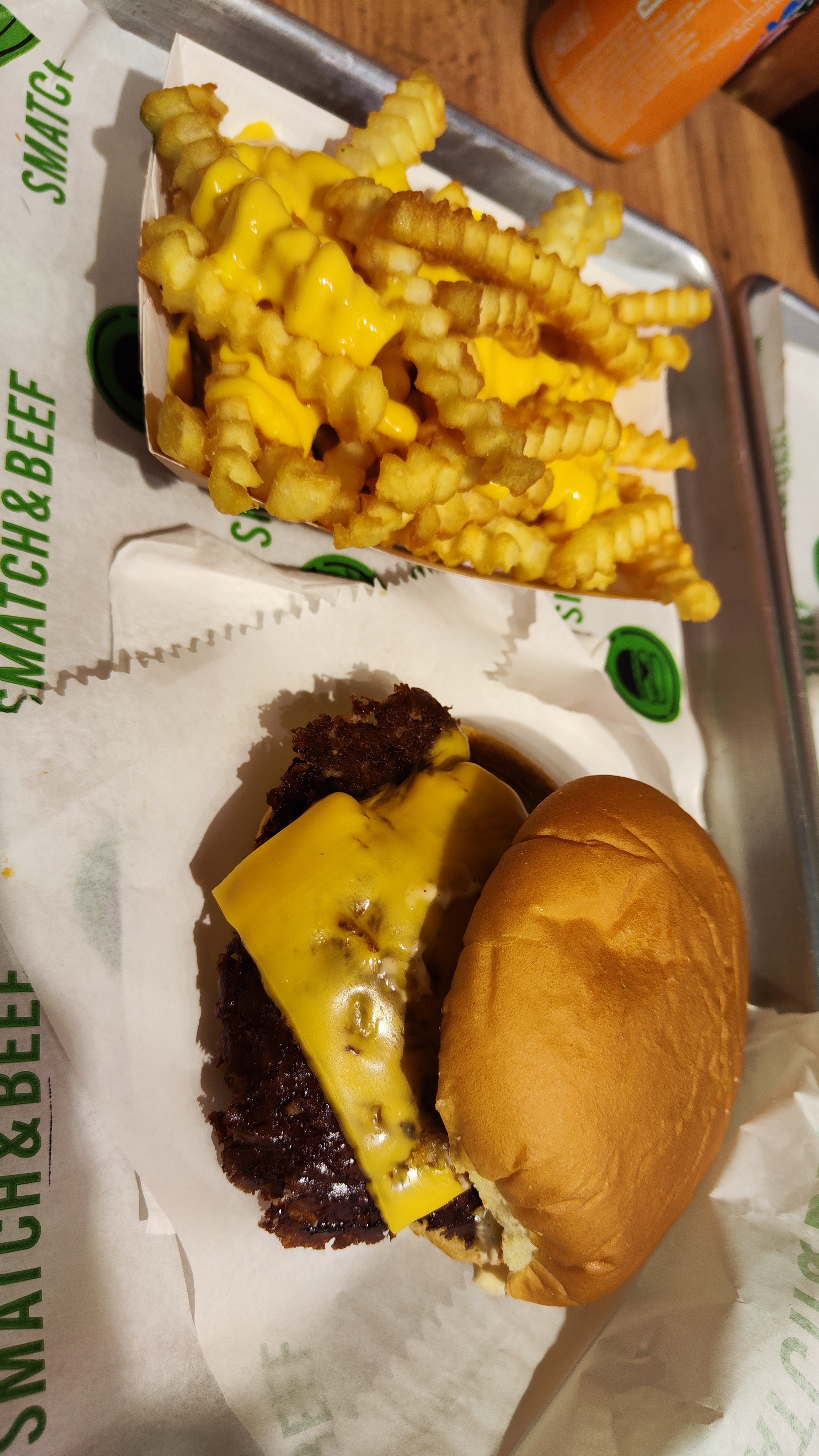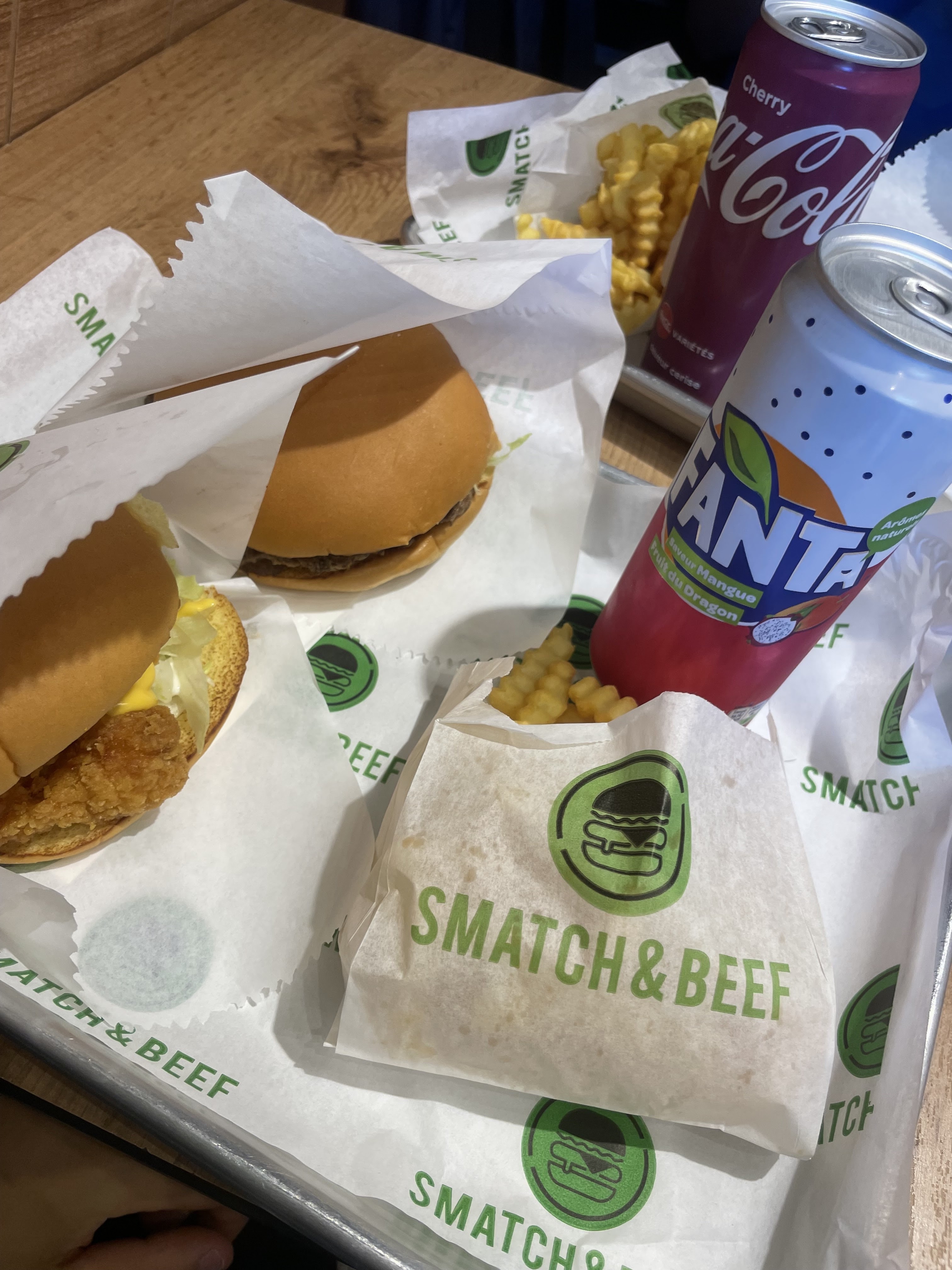 Nous avions envie de renouveler l'expérience du burger smatché. Cette fois nous nous sommes rendu sur place. Nous avons été accueillis par le responsable et son équipe avec un sourire malgré le Rush des commandes et des livreurs venus récupérer leurs commandes. Nous avons choisi nos commandes sur une grande carte claire et facilement compréhensible. Nous avons opté pour l'offre Signature (5€ supplémentaires pour le deuxième burger). Un double cheeseburger et un double smatch burger). Les burgers étaient excellents et le fait que les viandes soient plates, la viande ne s'échappe pas du burger. Sincèrement le meilleur burger que j'ai mangé. Les frites sont délicieusement salés hummm. Pour finir le tiramisu au chocolat est très bon et pas trop sucré.🤔👍