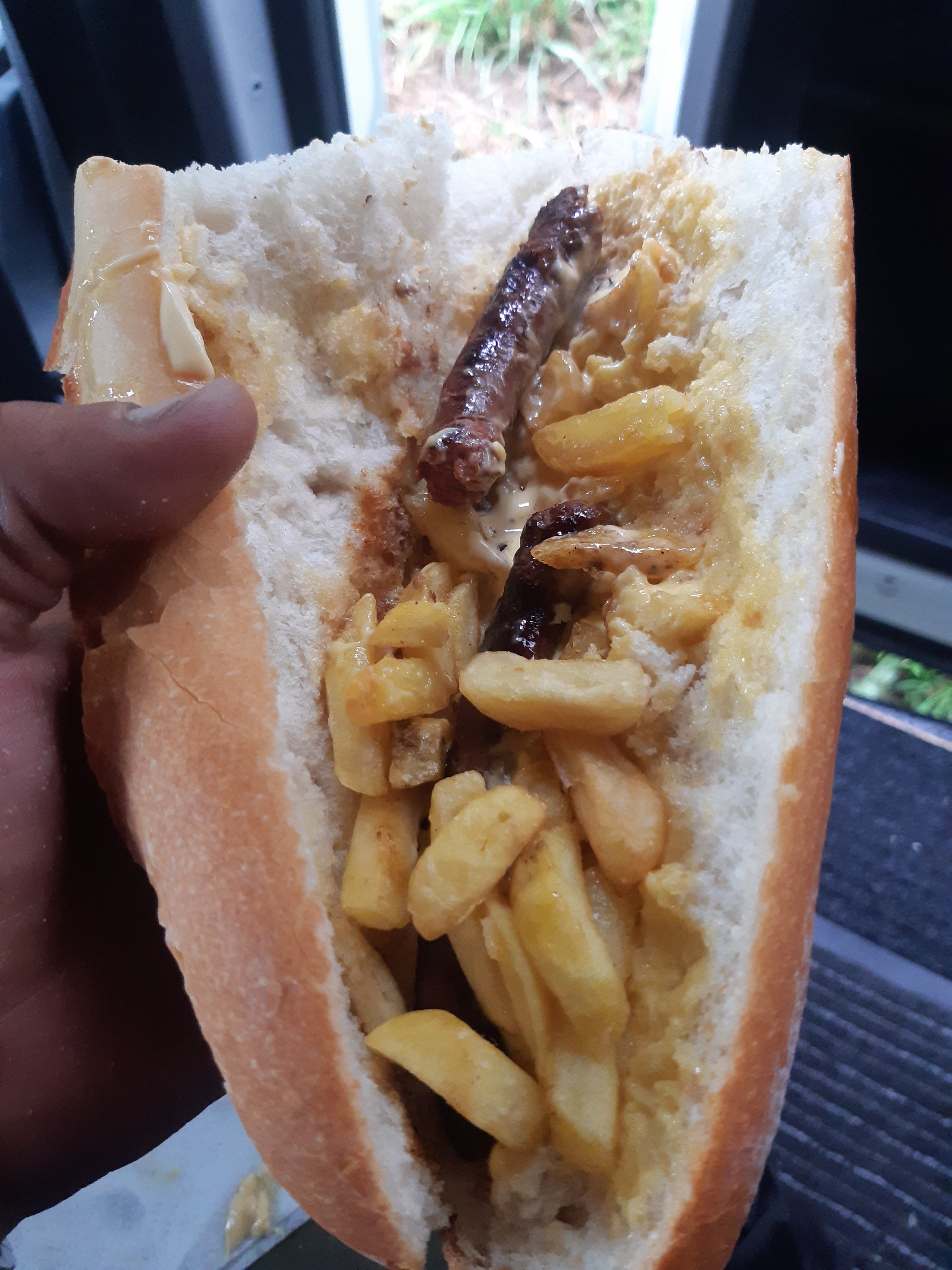 Bon emplacement (juste à côté du rond point), grand parking et vous êtes assis pour manger. Frites, sandwich (chaud/froid) boissons et café. Attention : paiement uniquement en espèces