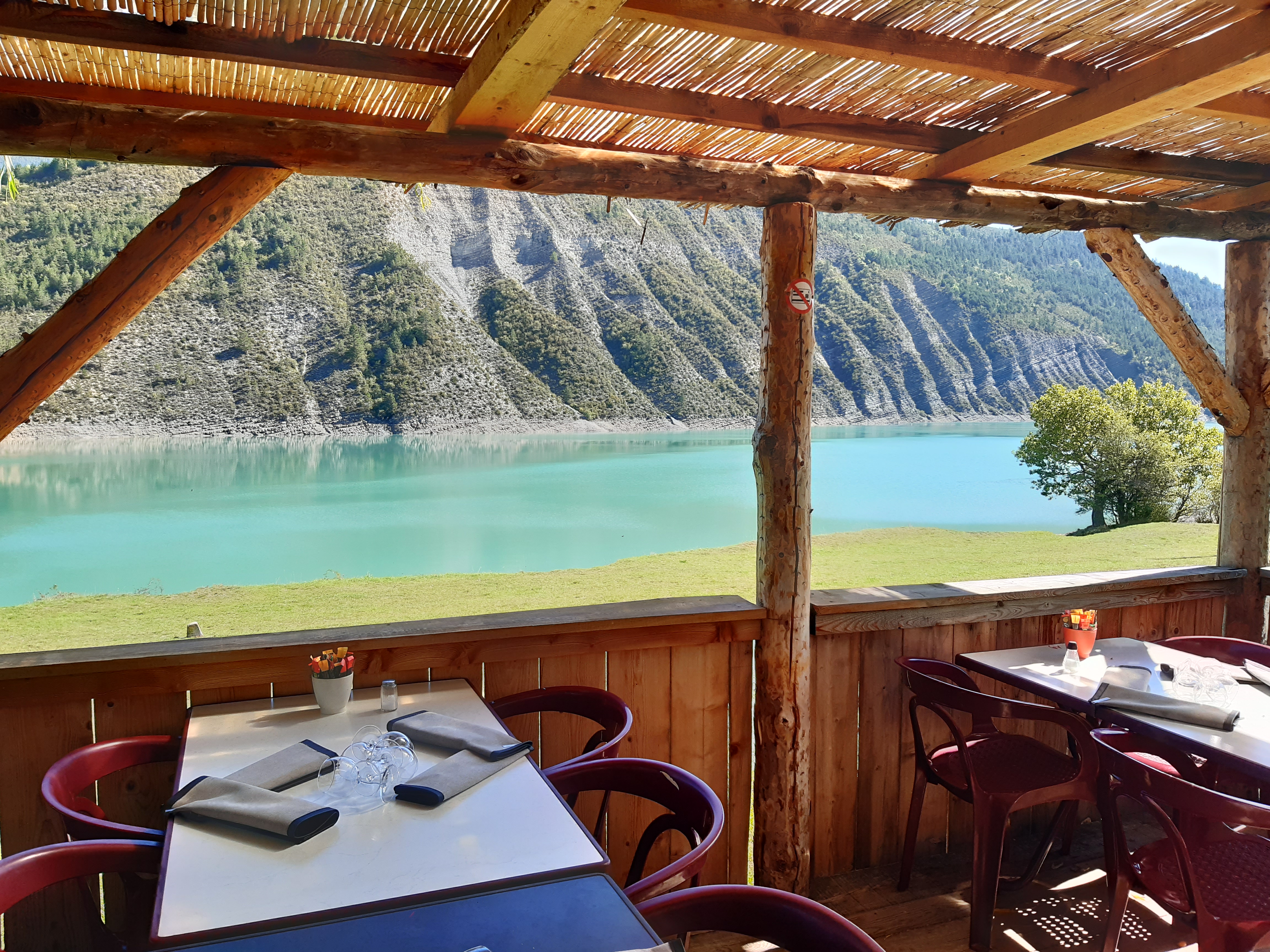 Super pause repas au bord d’un lac magnifique avec des serveurs super sympathiques et souriants