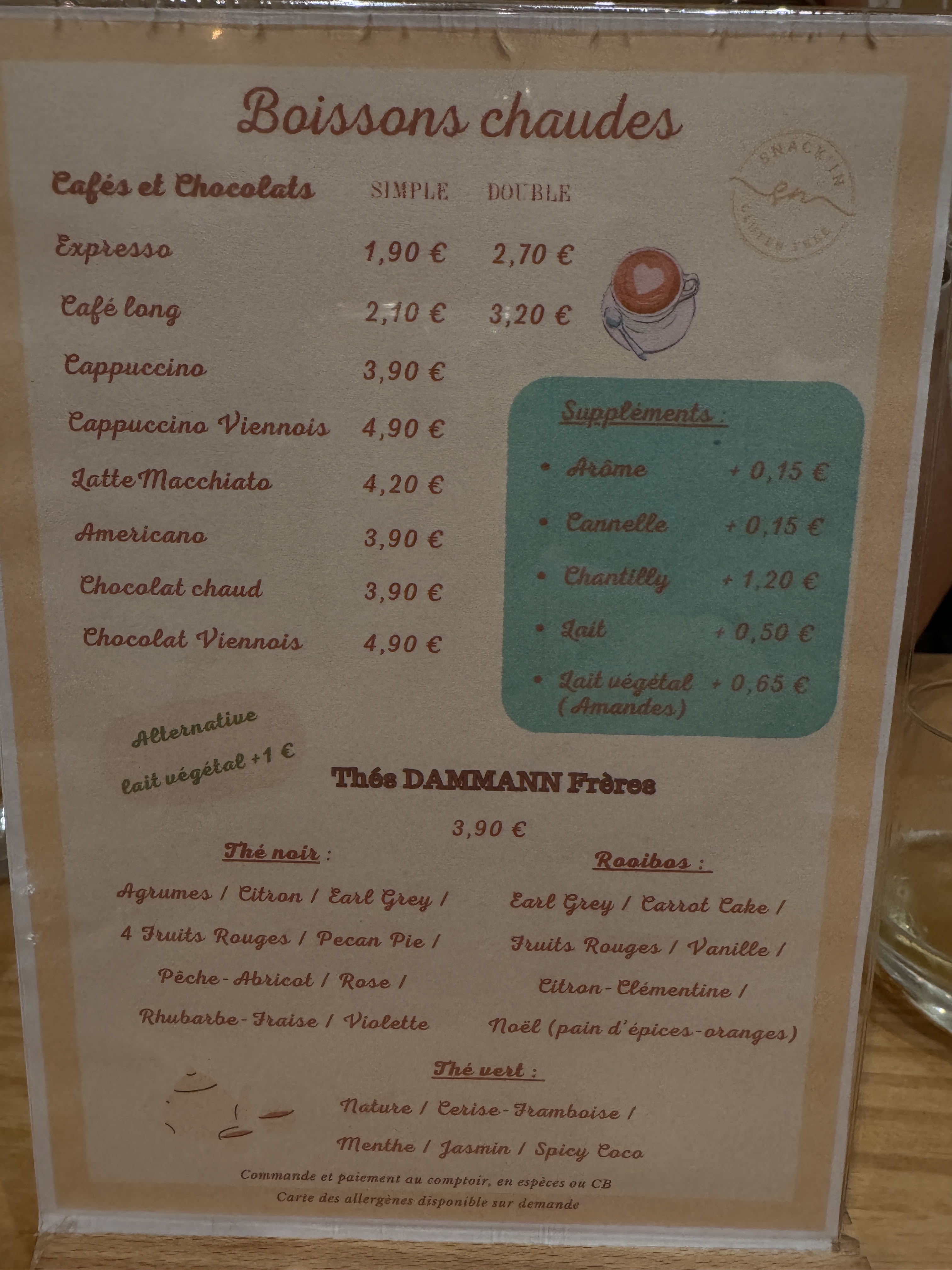 L'accueil est adorable, c'est bon, fait sur place et pas cher (vraiment), la déco est sympa, c'est calme et propre, on y distingue bien le vrai cappuccino du cappuccino viennois (généreux !), il y a l'option végétale et en bonus, on y trouve du sirop et de la glace à la violette ! 💜 Que demander de mieux ?