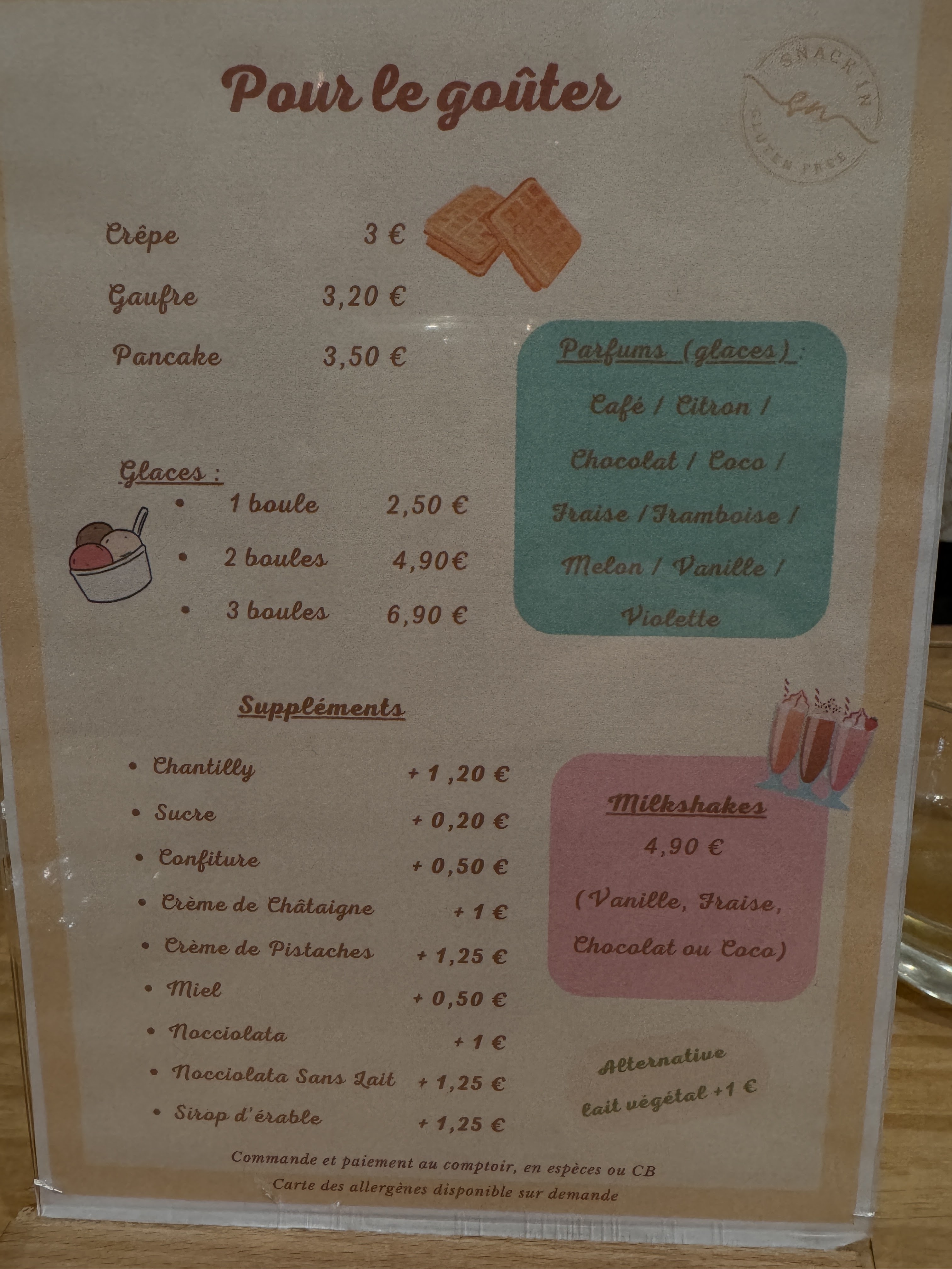 Pour ceux qui sont intolérants au gluten, ou cœliaque ou lactose ou tout simplement pour le plaisir. N'hésitez pas allez au SNACK'IN pour le déjeuner ou le gouter. Audrey vous accueillera chaleureusement souriante attentionné , endroit cocooning, coin enfants, tout est fait maison un régal avec un prix abordable à proximité de la cathédrale. Je recommande allez faire un tour ;)