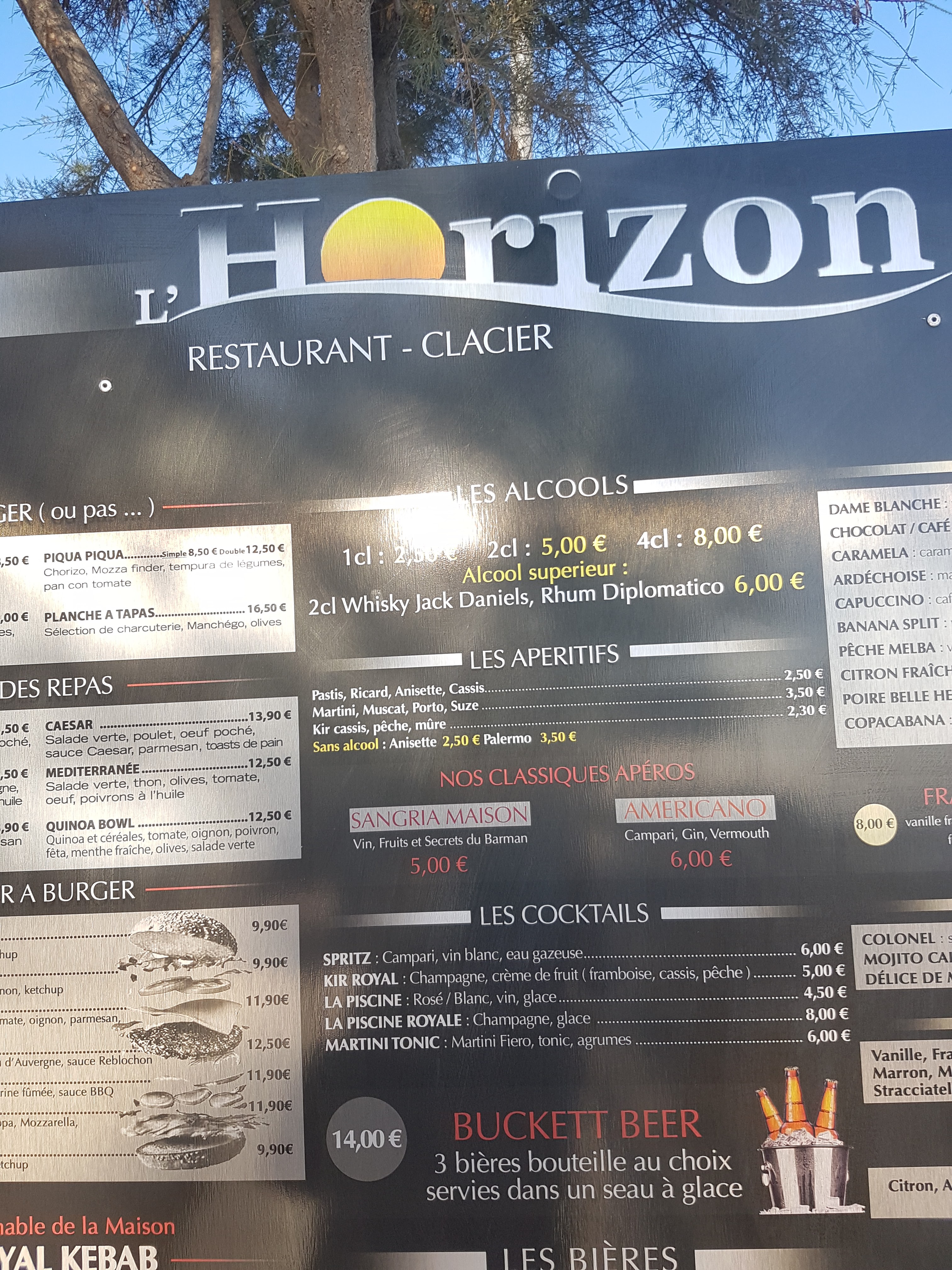 L horizon, une Institution sur le Grau d Agde. Service assuré par une équipe de mâles un peu rugueux, le dress code bermuda, tatouages (jeunisme assuré) et franc parler qui se calquent sur l attitude du patron. Heures de service, même en pleine saison, c est comme à l ephad, passé 13 h ou 20 h les fourneaux sont éteints. Quant à l ambiance mieux vaut être de la région, chauvinisme assuré, un peu dépassé pourtant à l heure actuelle. Messieurs, il faudrait revoir la copie, vous avez des leçons à prendre question accueil et amabilité. N oubliez pas que le soleil ne fait pas tout et que la concurrence pointe le bout de son nez. Rien n est acquis et rien n est gagné ! Côté cuisine, ça reste un snack. A bon entendeur !