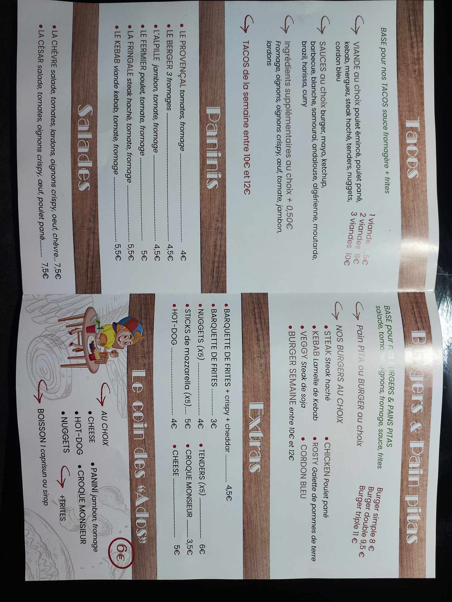 Une carte bien fournie et très bonne (burgers, tacos, paninis, salades, frites, glaces et bien d'autres choses) ! Un service au top et en continu ! Je recommande sans hésiter.