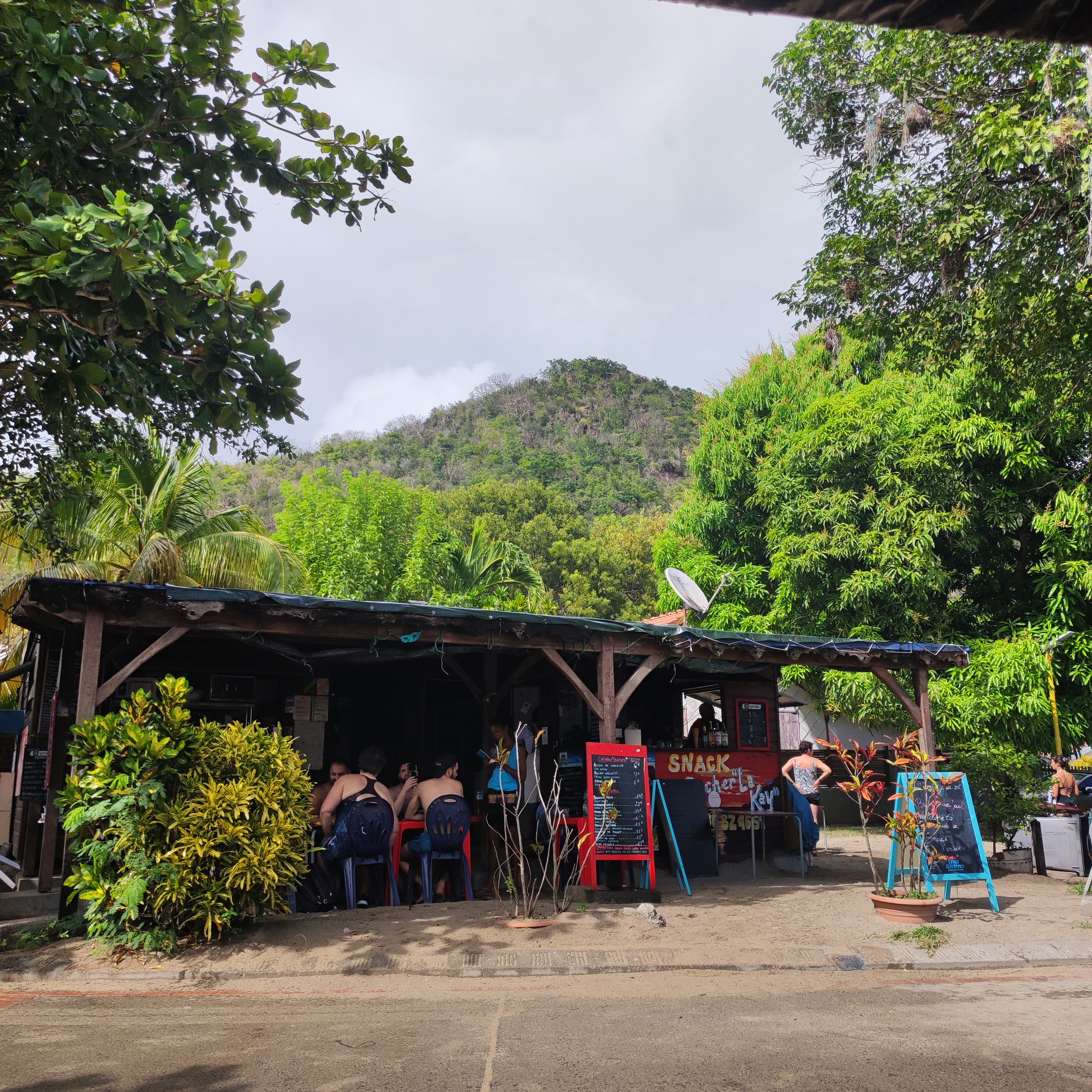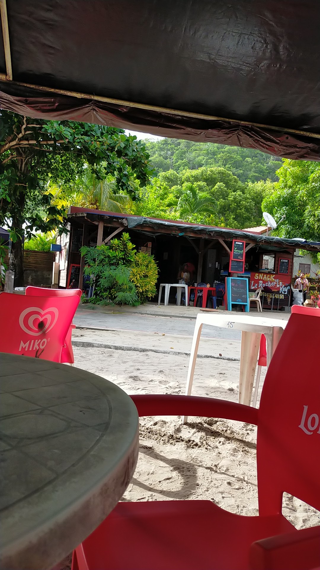 Les pieds dans le sable, face à la plage, la mer et les bateaux. L'ambiance est chaleureuse, détendue et familiale. Tout le monde est souriant et vous font partager le bonheur d'être ici. La nourriture est simple, locale authentique et excellente. C'est devenu notre cantine, à xchacun de nos déplacements au bourg, c'est là qu'on va et, sans surprise, c'est le même accueil convivial et la même qualité dans l'assiette. Un planteur puis une grillade ou une salade et un verre de rosé et c'est le paradis...