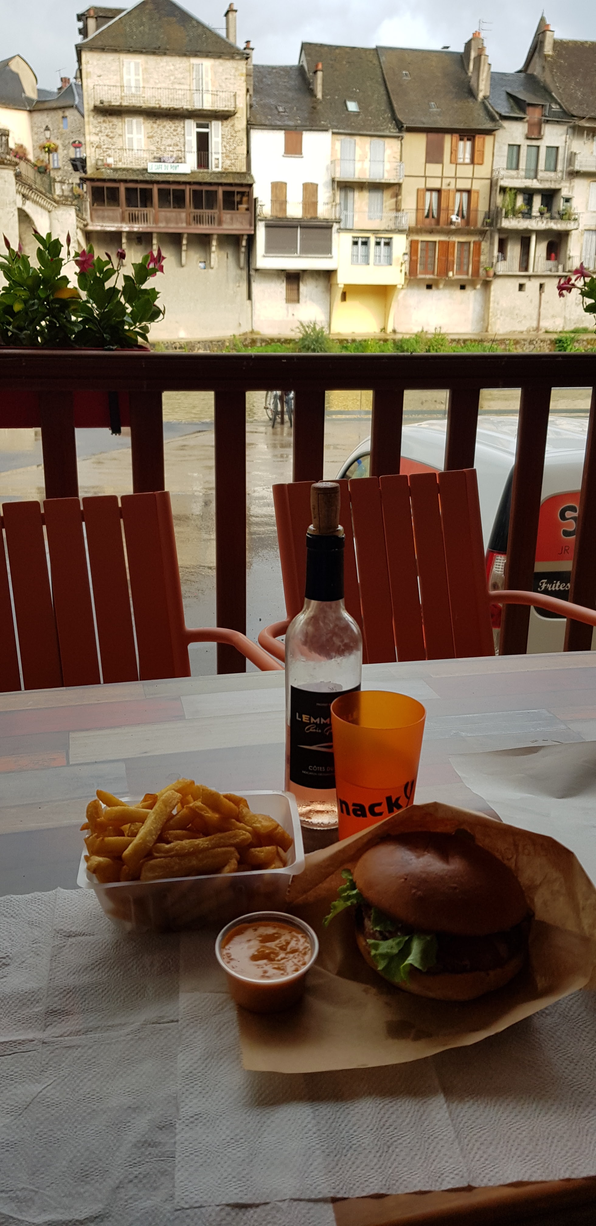 Burger avec produits de qualité, roquefort, noix, magret de canard. Pain frais. Service efficace et aimable pour un tarif correct. Très bonnes frites. Salades copieuses. Petite terrasse à dispo ou parc en bord du Lot... Nous recommandons !