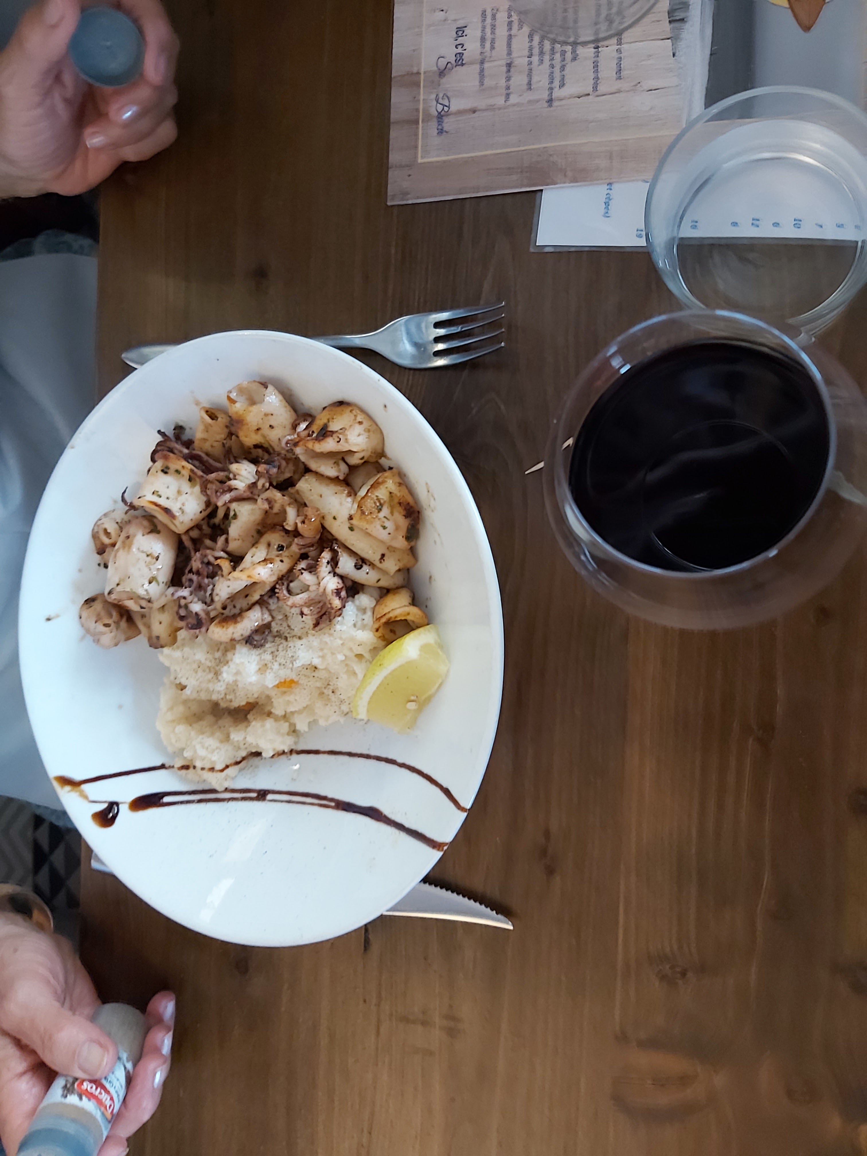 Un lieu vraiment agréable, la vue, la sympathie du personnel ... Et nous nous sommes régalés !!! Risotto parmesan - chipirons a la plancha pour moi, chipirons sauce champignons accompagnés de salade et frites pour mon mari, hamburgers maison pour mes enfants. Top ! Malgré l'affluence, nous avons été servis rapidement en bonus !